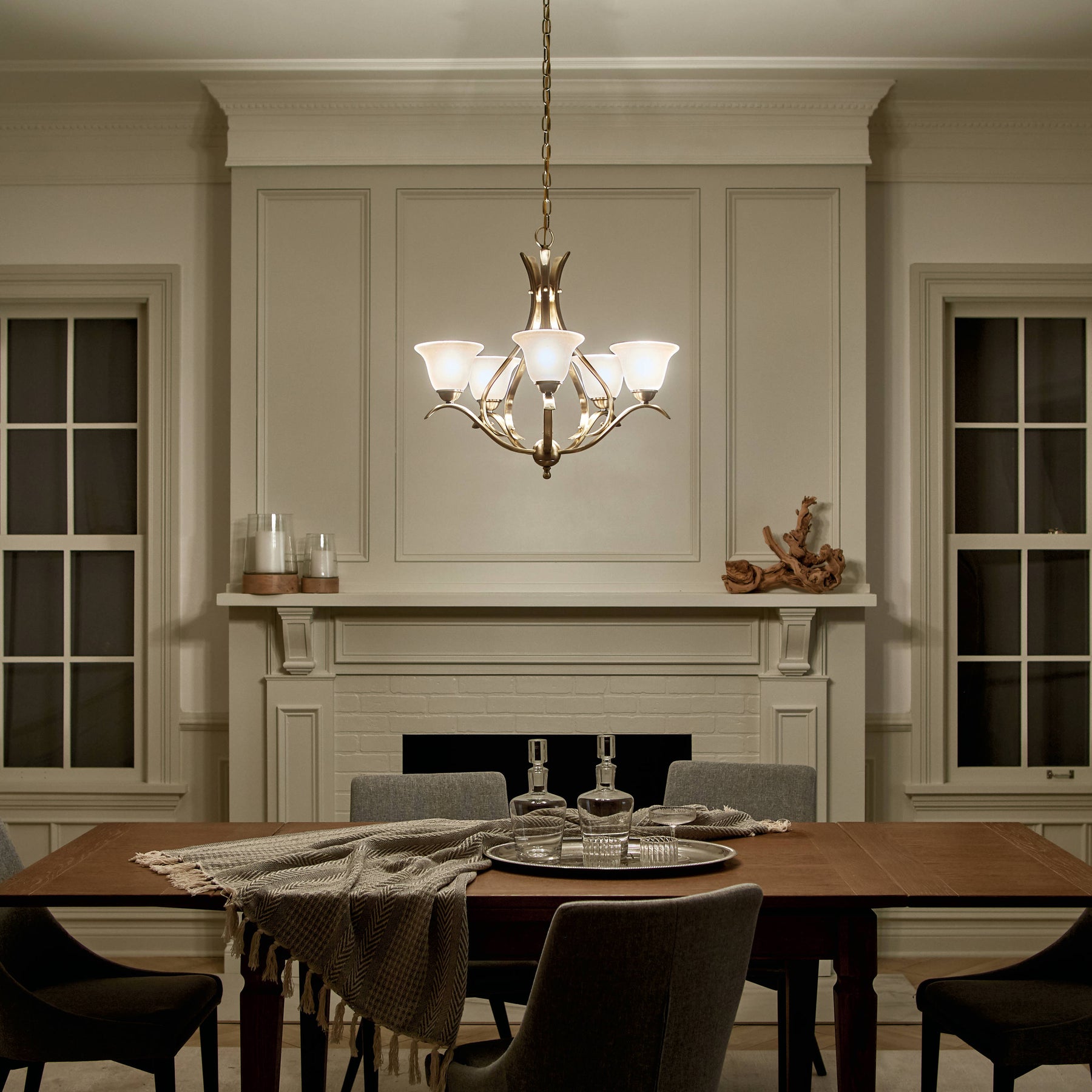 Elevate your space with the Kichler Dover 5-Light Antique Gold Chandelier. Featuring graceful curves in antique brass and adorned with alabaster swirl glass, this transitional chandelier is perfect for dining rooms, foyers, or living areas, adding a touch of elegance and sophistication to any setting.