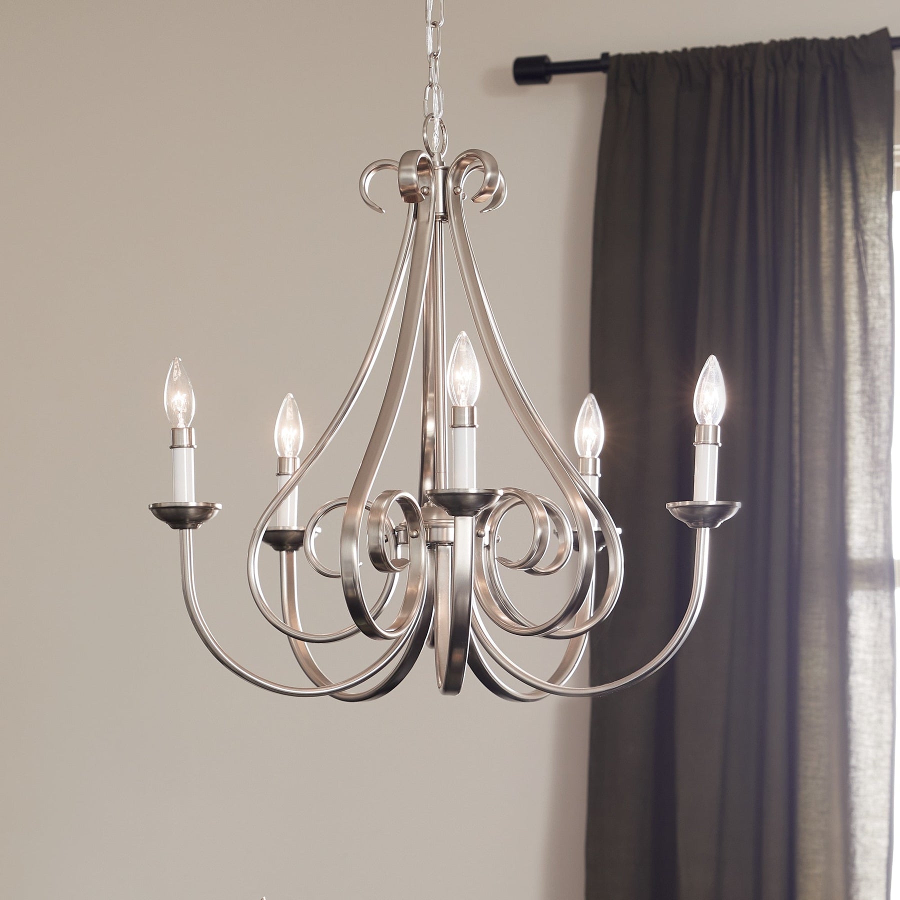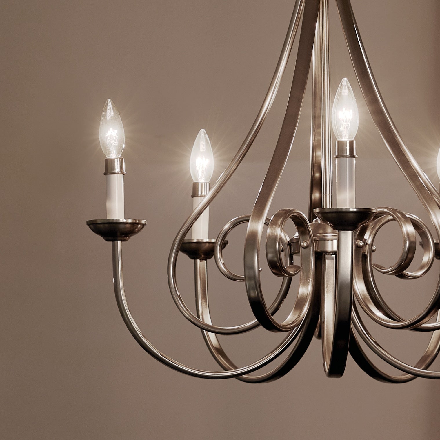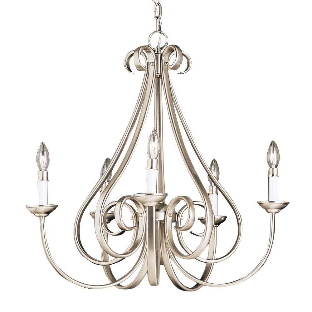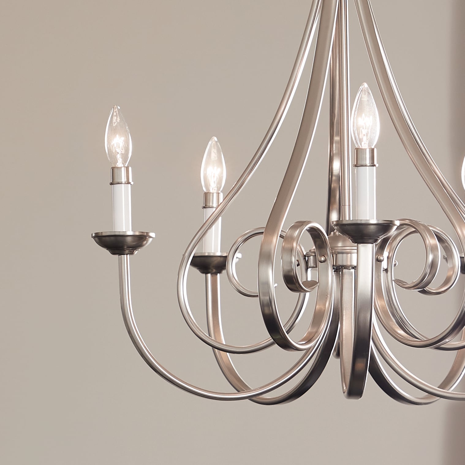 Illuminate your space with the Kichler Dover 5-Light Chandelier, an elegant blend of traditional design and modern functionality. Crafted from hand-wrought steel and finished in brushed nickel, this fixture brings a touch of sophistication to any room. Ideal for dining rooms, foyers, and living spaces, it offers both style and adaptability with its adjustable hanging height and compatibility with dimmable bulbs.