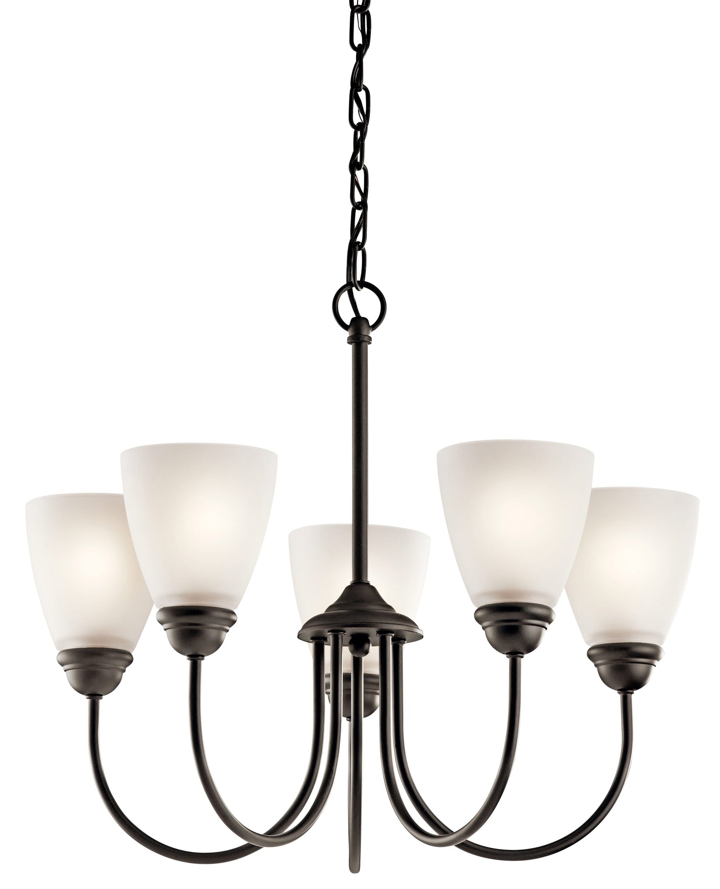 Illuminate your space with the timeless elegance of the Kichler Jolie 5-Light Antique Bronze Transitional Chandelier. Featuring beautifully crafted satin etched glass, this fixture offers ambient lighting that enhances any decor. Ideal for dining rooms, kitchens, or entryways, its antique bronze finish evokes a classic sophistication.