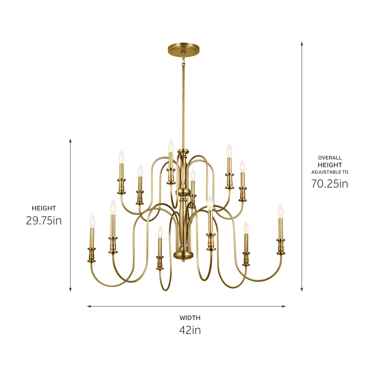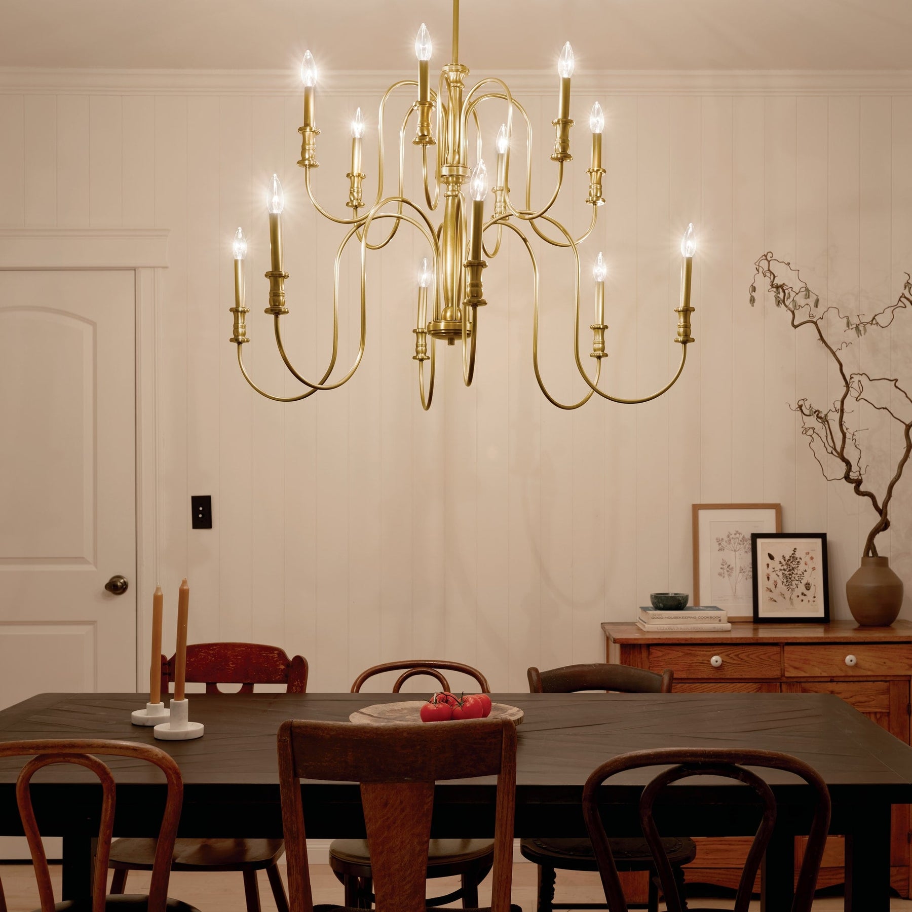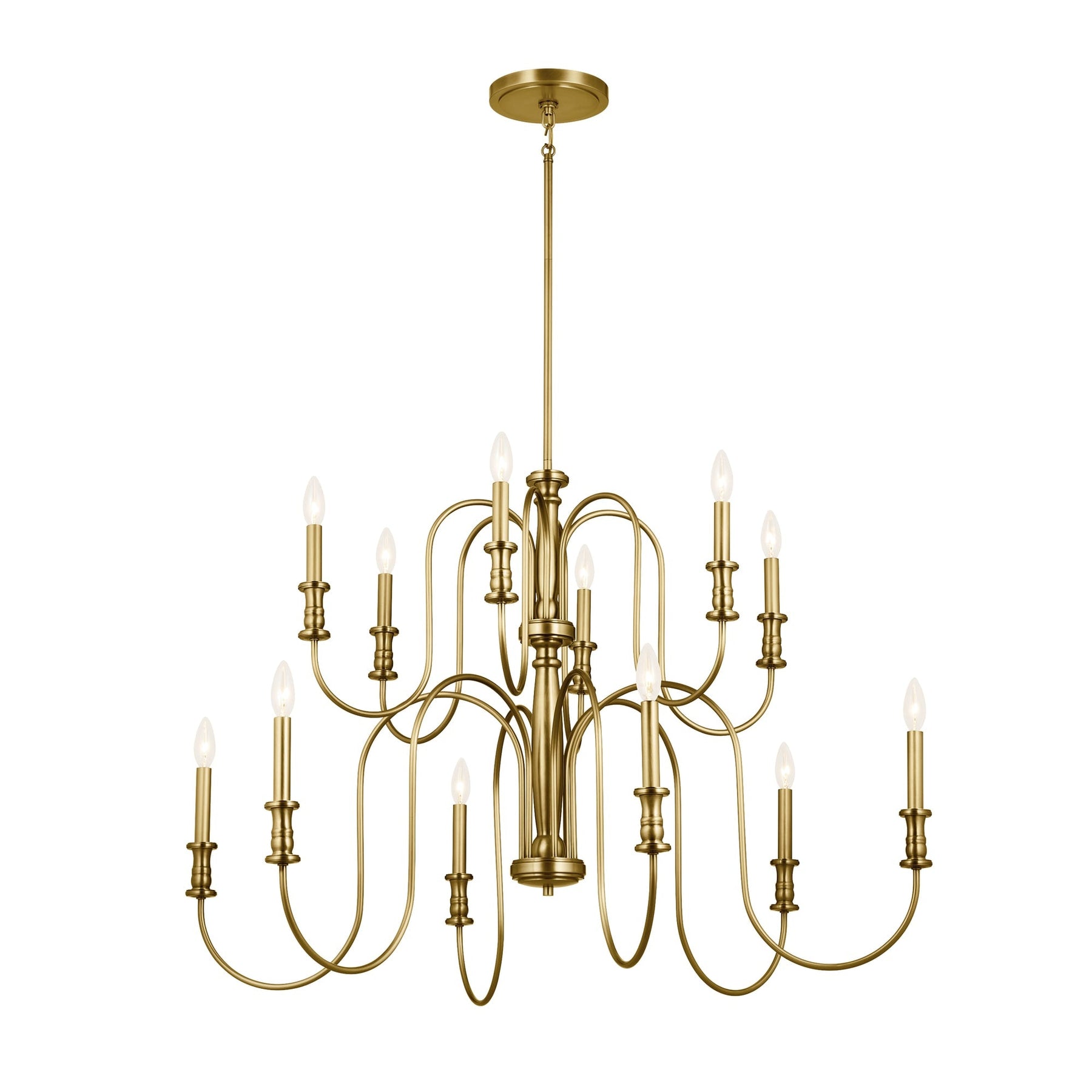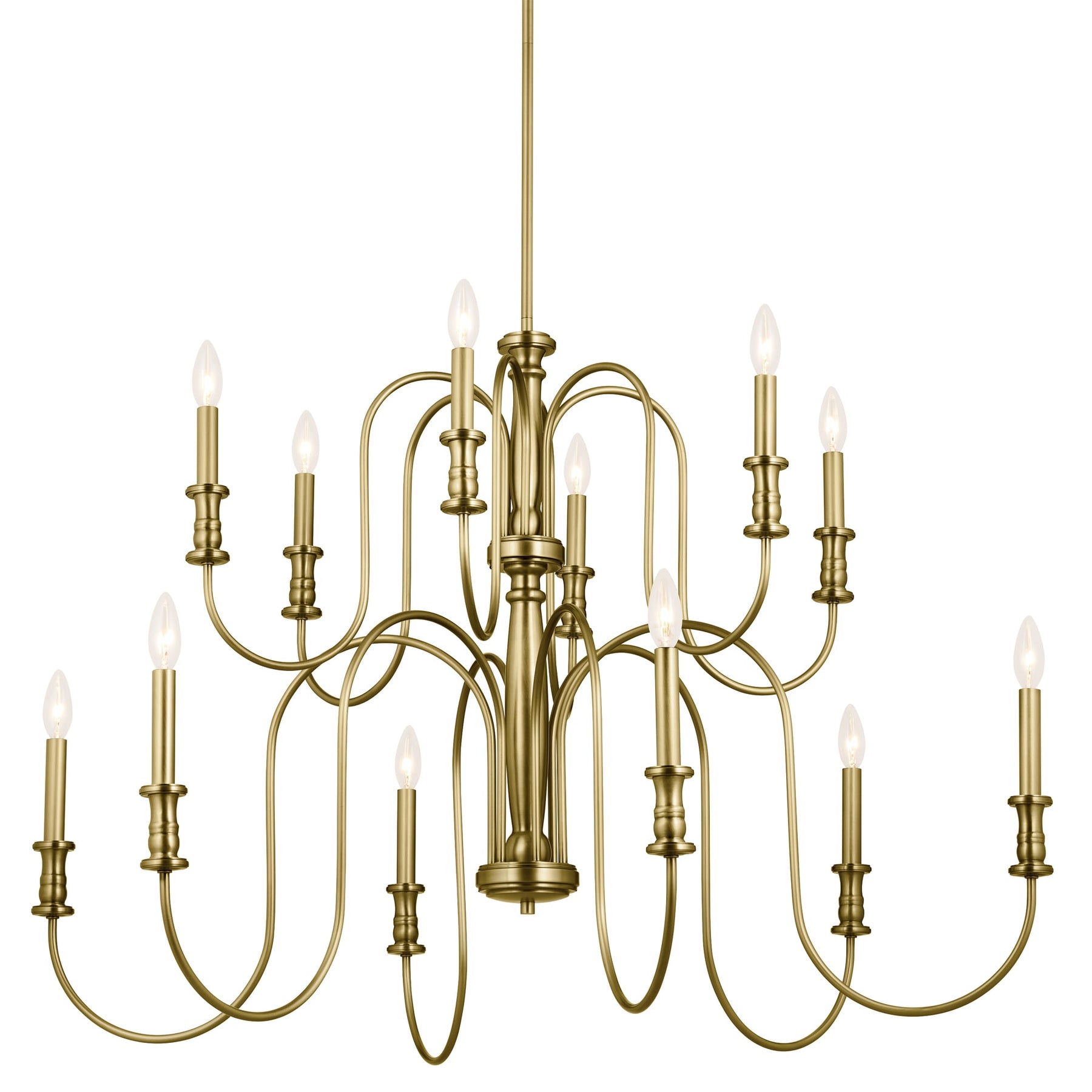 Illuminate your living space with the enduring beauty of the Kichler Karthe 12-Light Chandelier. Crafted to evoke the romance of a French countryside manor, its sweeping arms and natural brass finish create a dramatic yet sophisticated statement. The intricately turned spindle details enhance its vintage allure, casting light in an enchanting pattern. Perfect for a grand dining area or an opulent foyer, this chandelier becomes the centerpiece of a room, enveloping it in refined luxury and timeless charm.