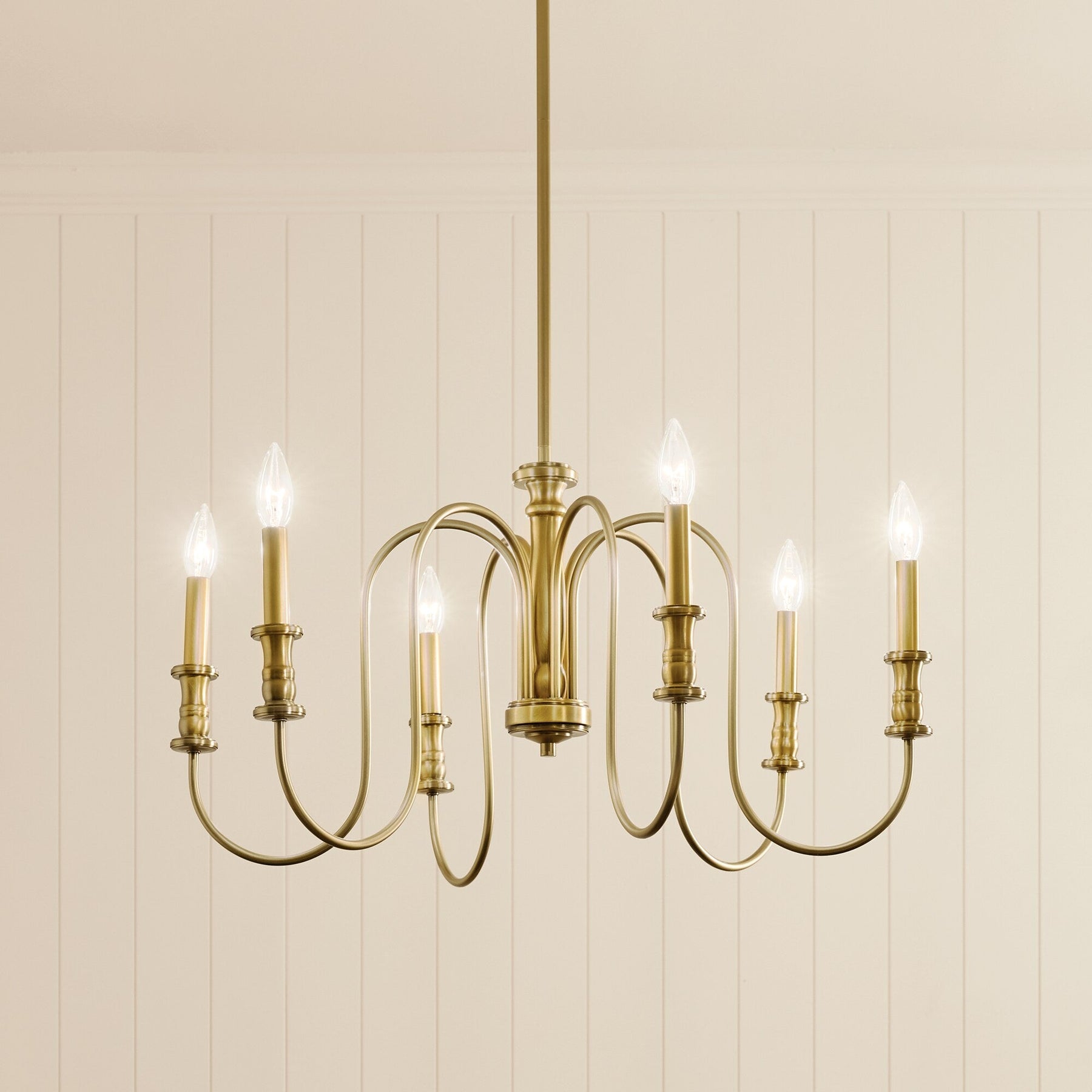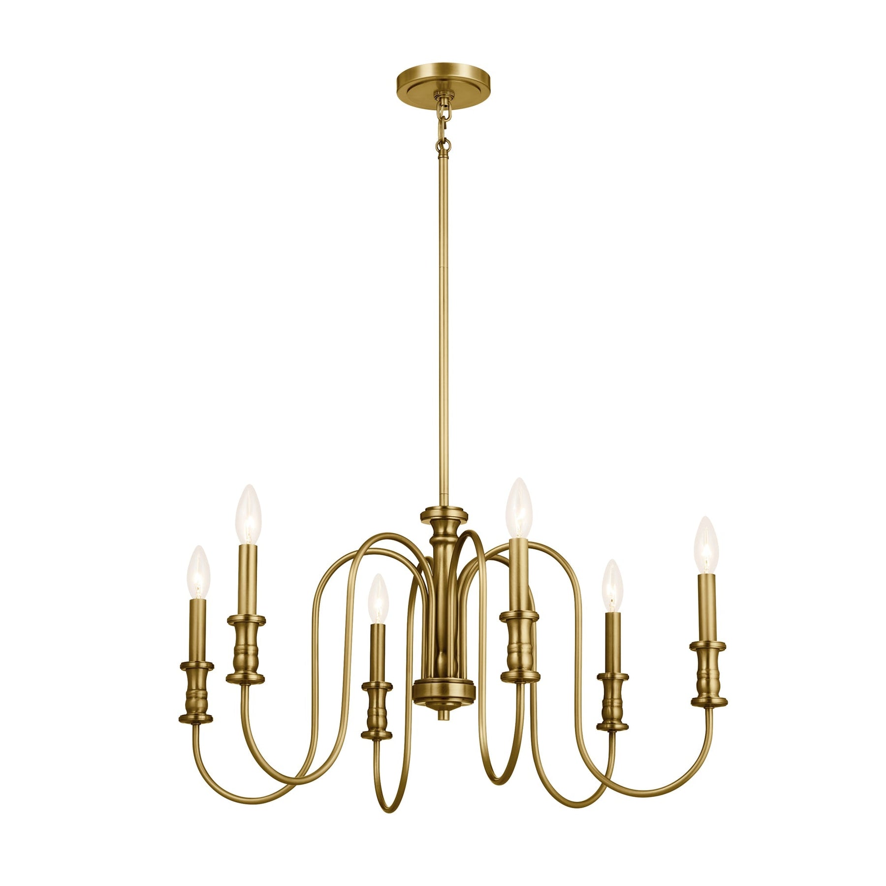Elevate your home's ambiance with the Kichler Karthe 6-Light Gold Chandelier, designed in an exquisite French Country style. Its warm, natural brass finish and refined detailing evoke the charm of vintage heirlooms, while offering versatile light with candelabra options. Perfect for dining areas, bedrooms, and more, this chandelier ensures cozy elegance.