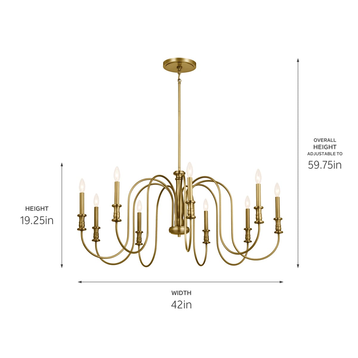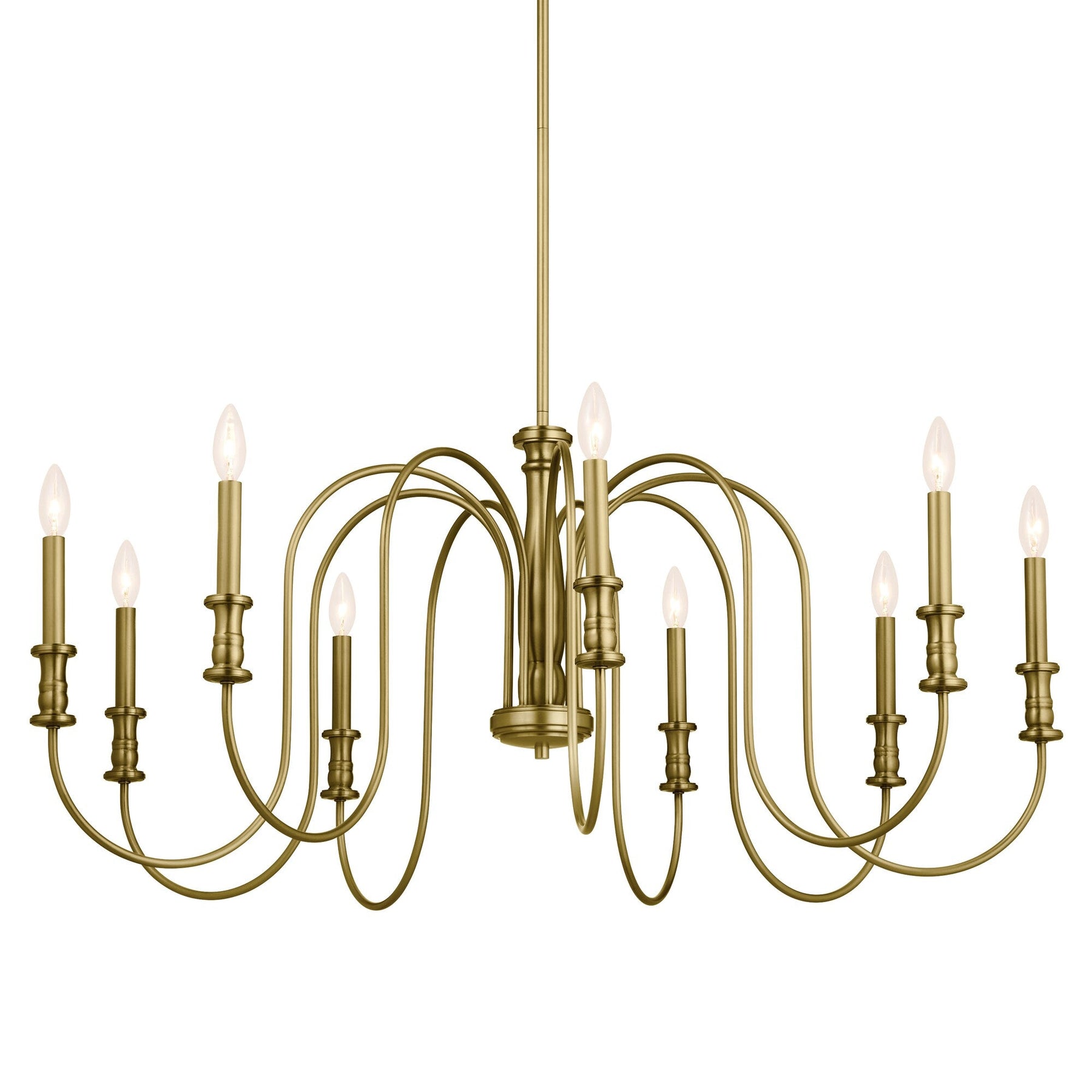 The Kichler Karthe 9-Light Gold Chandelier adds a touch of vintage charm to any space with its elegant French country design. Featuring a warm Natural Brass finish and versatile illumination options, it brings a refined, cozy atmosphere to dining rooms, foyers, and living areas. Perfect for creating ambient lighting with a dimmable function when paired with suitable bulbs and switches.