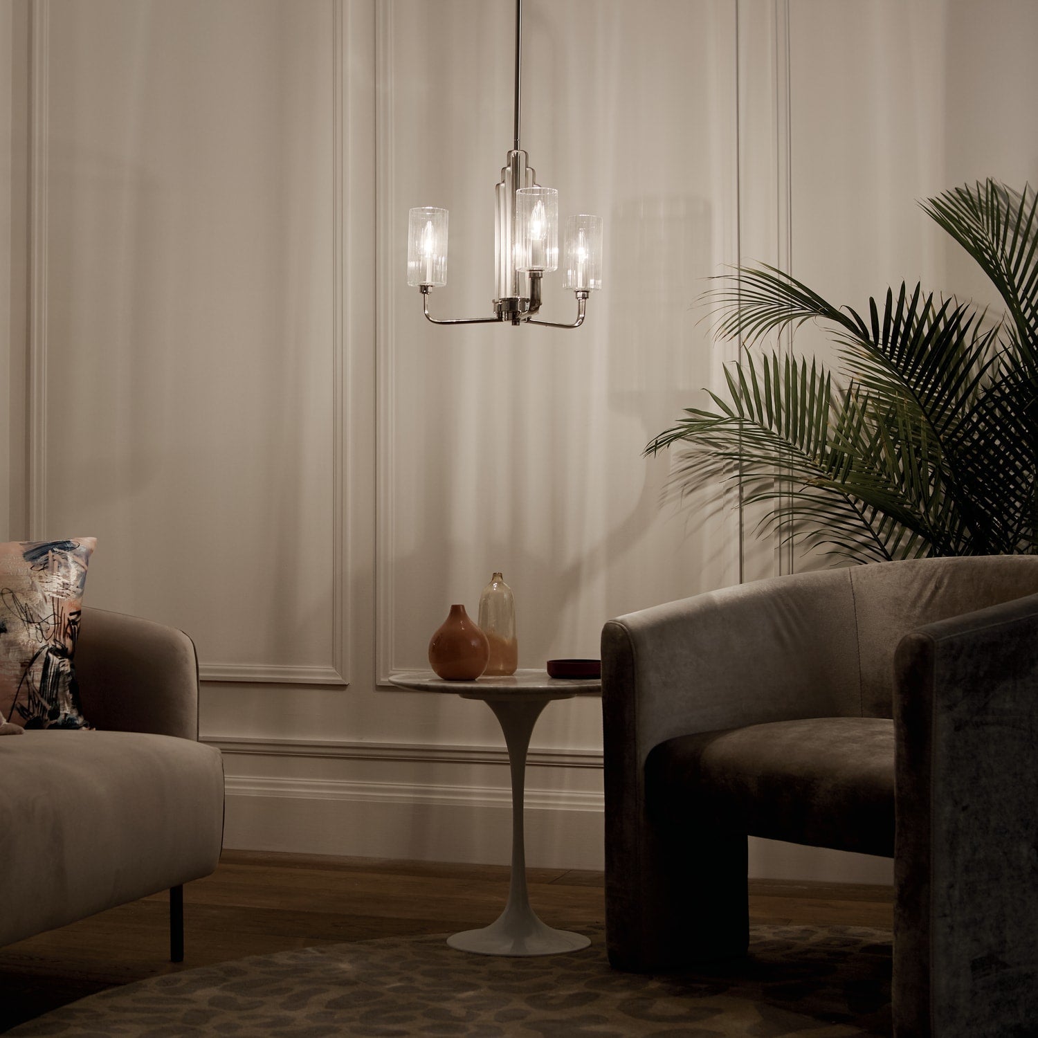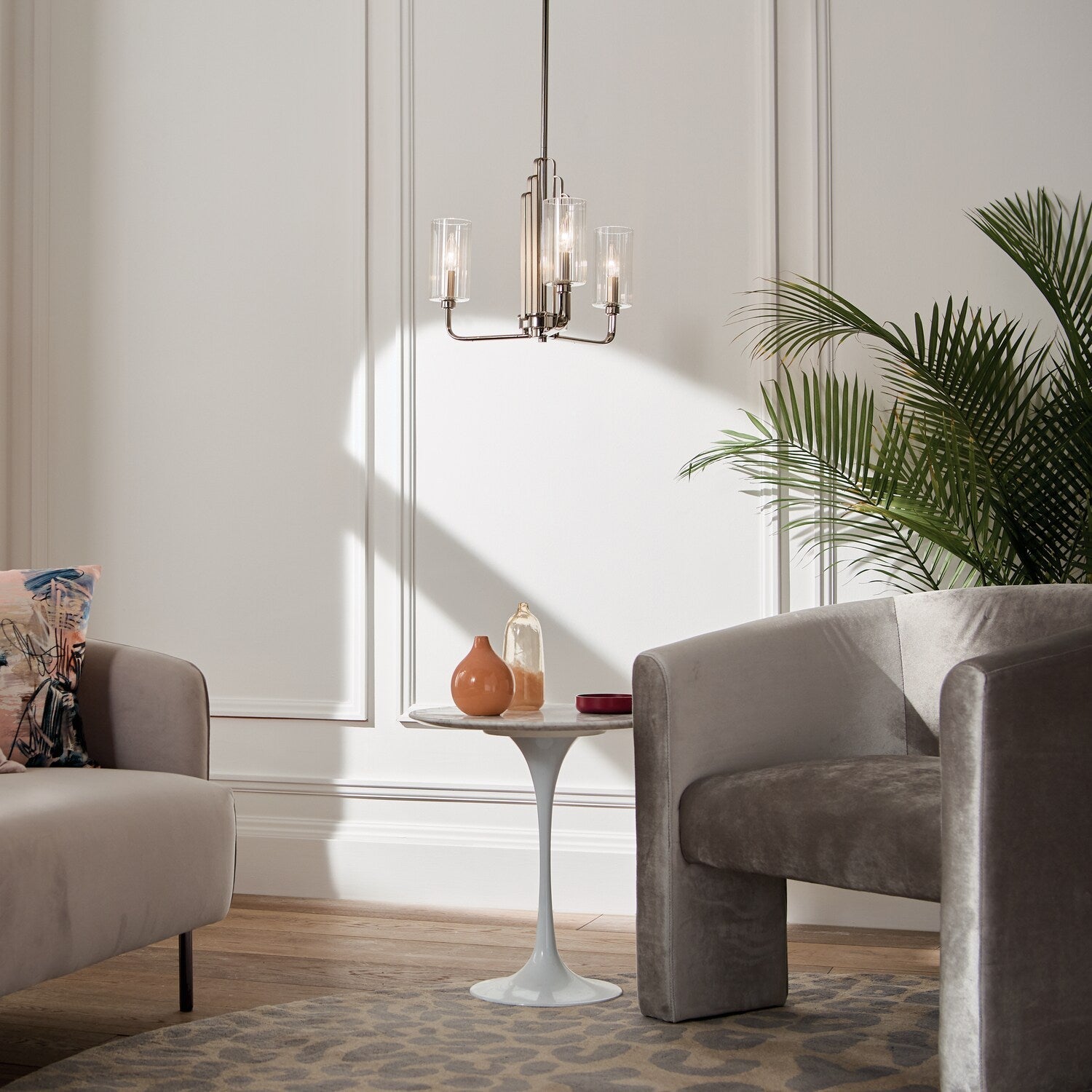 The Kimrose 3-Light Chandelier is a beacon of timeless sophistication that transforms any room with its luxurious decor. Its polished nickel finish combined with ribbed glass shades exudes a refined Art Deco charm – reminiscent of New York's historic glamour. This chandelier acts as a centerpiece above a statement dining table or bathes a living room with warm, inviting light, drawing the eye to its graceful geometry. Essential for those who embrace classic elegance, the Kimrose will redefine the ambiance of your space.