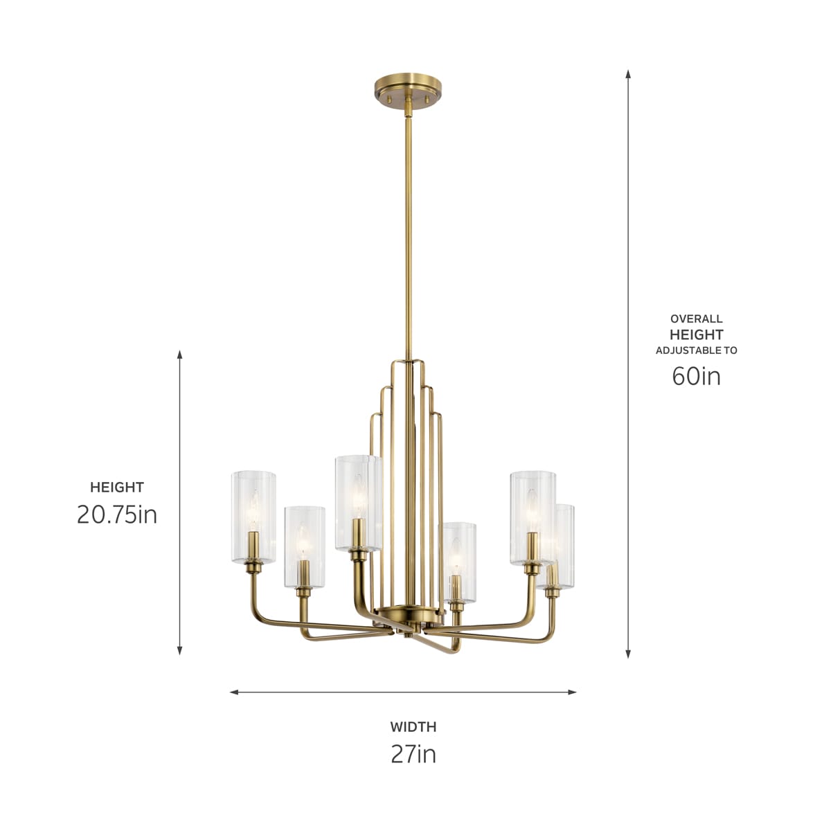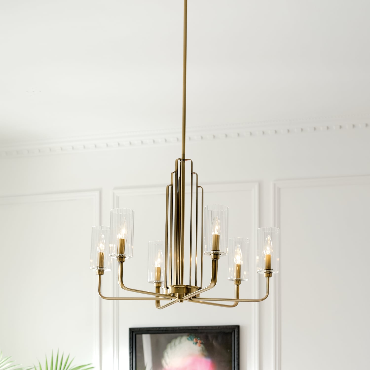 Illuminate your space with the luxurious allure of the Kichler Kimrose 6-Light Chandelier. This stunning fixture draws inspiration from Art Deco elegance, featuring geometric designs in a Brushed Natural Brass finish paired with Clear Fluted Glass shades. Ideal for dining rooms or kitchens, this chandelier brings a tasteful blend of vintage charm and modern style to any home.