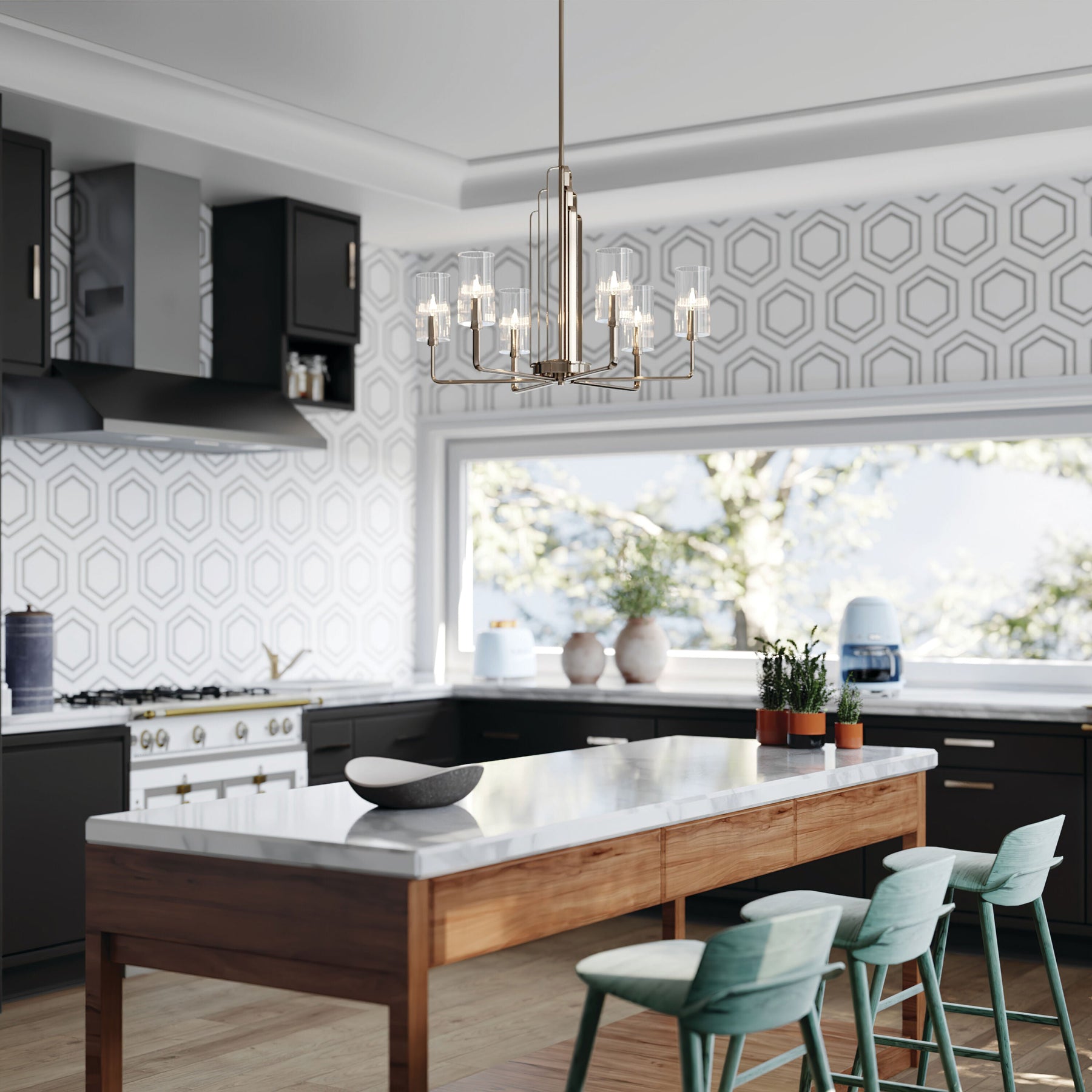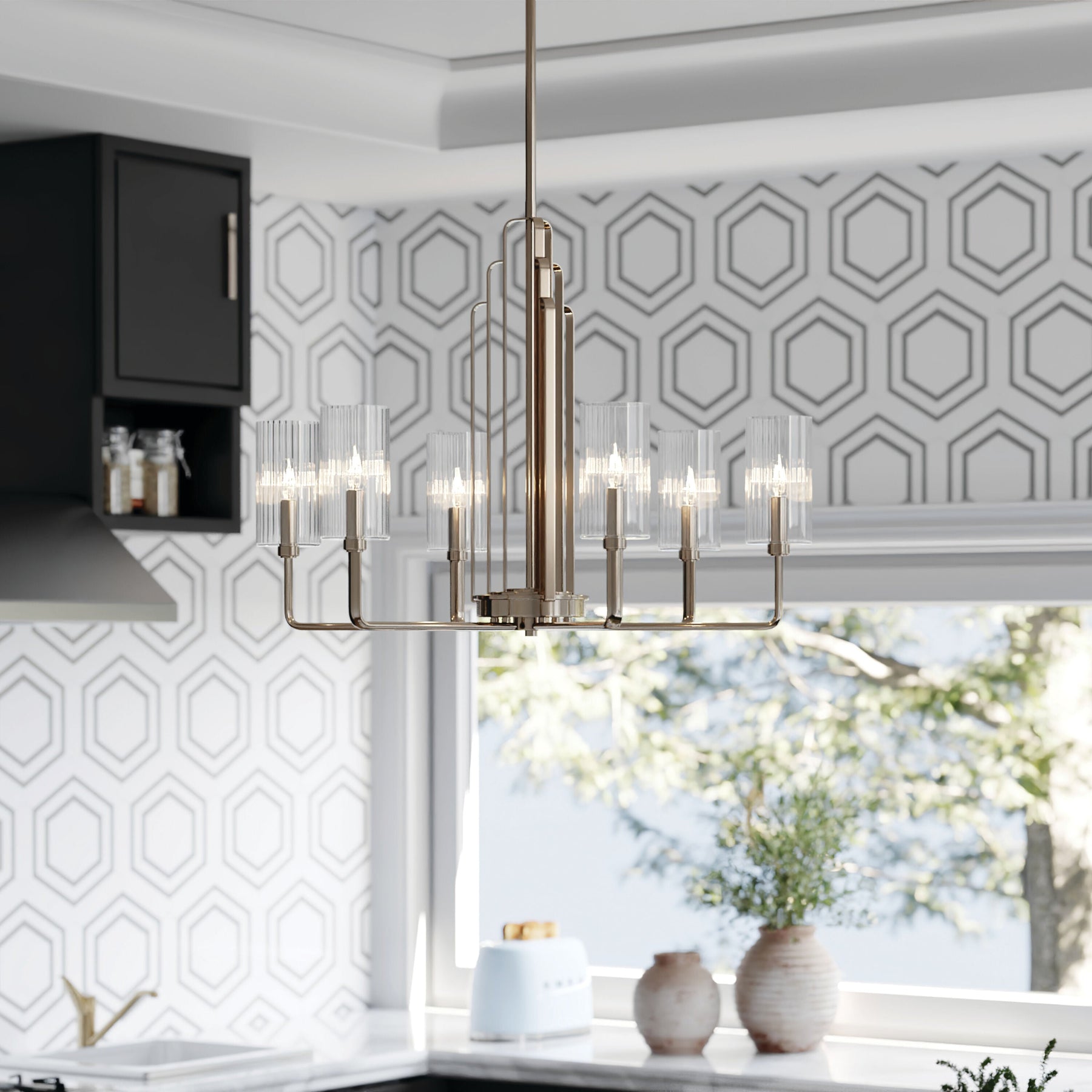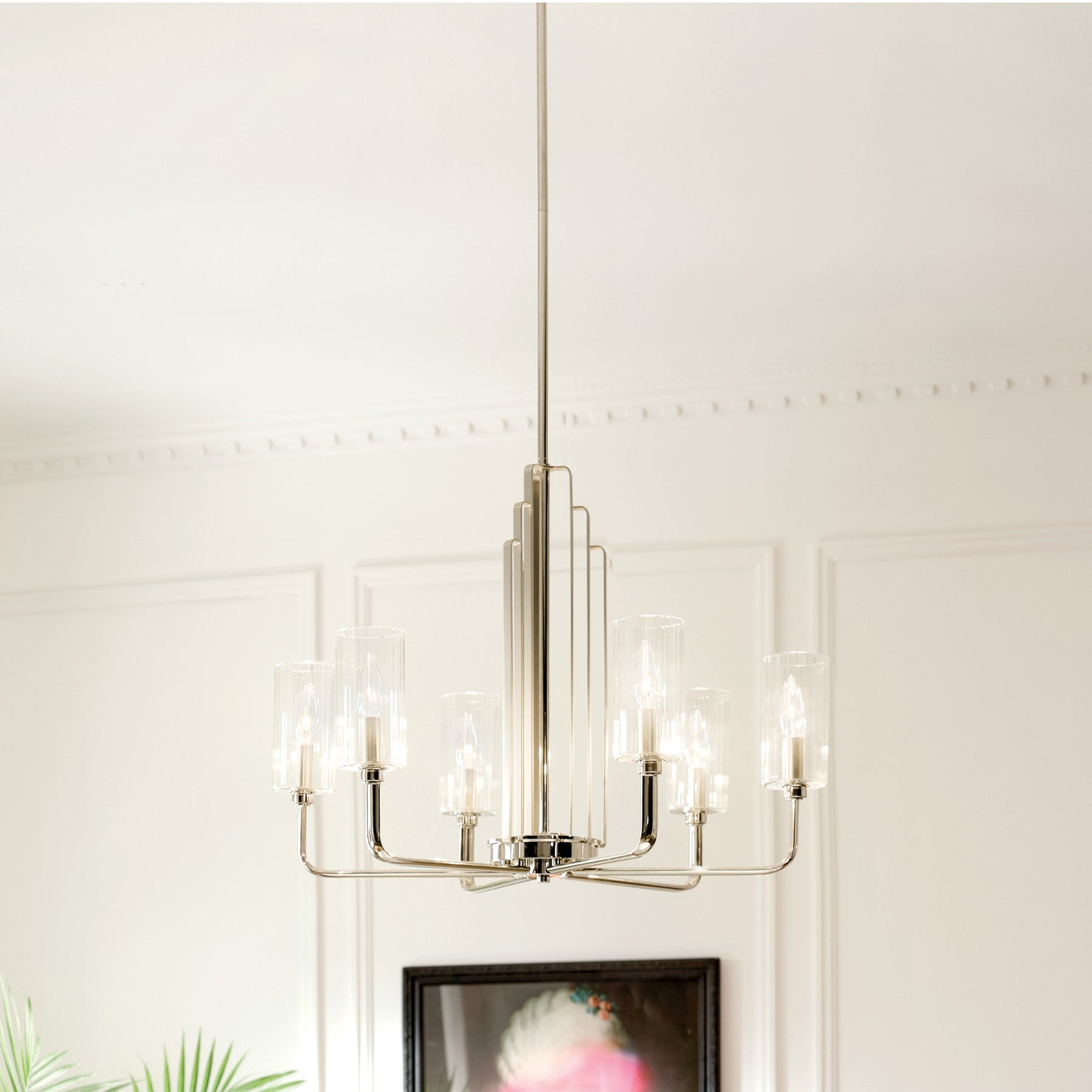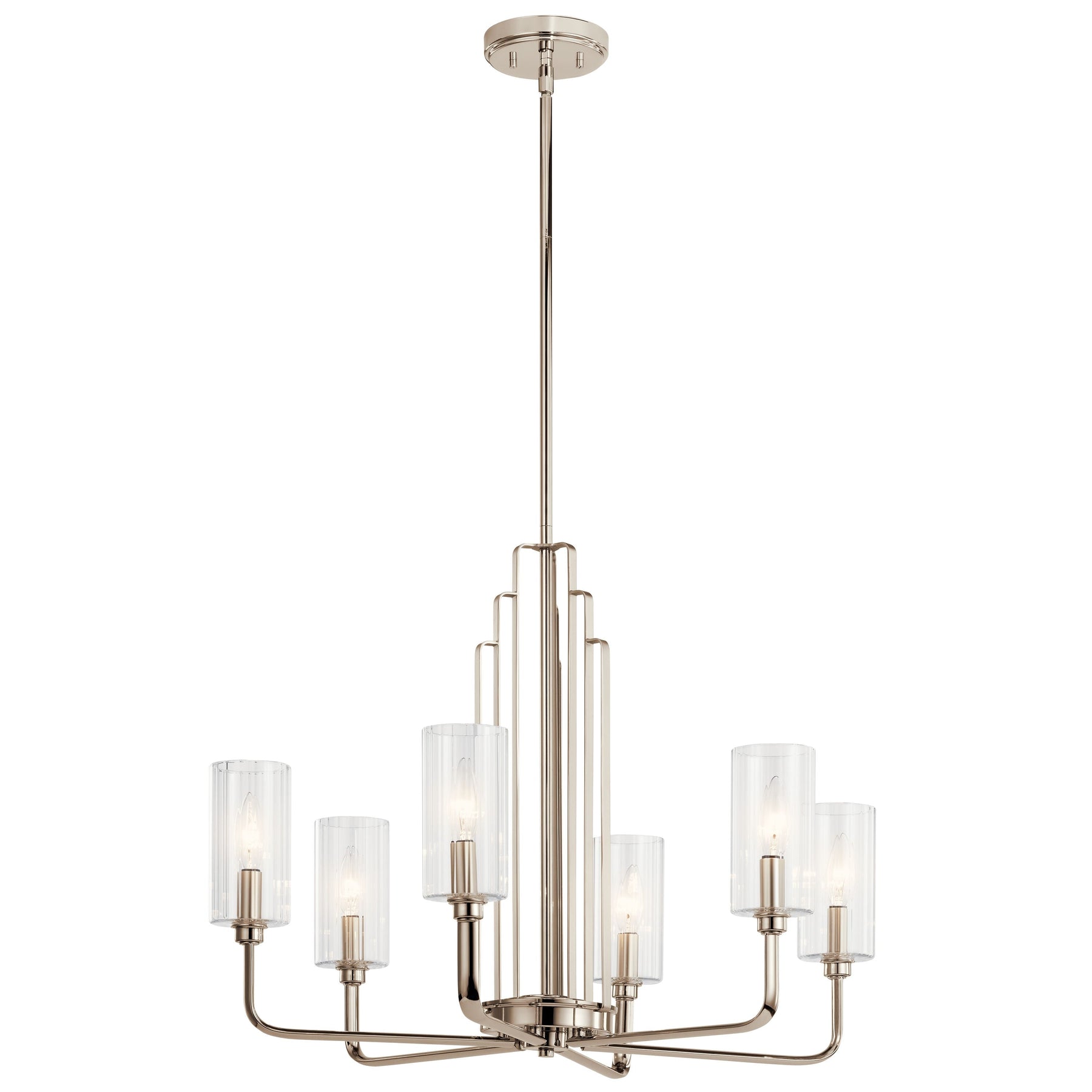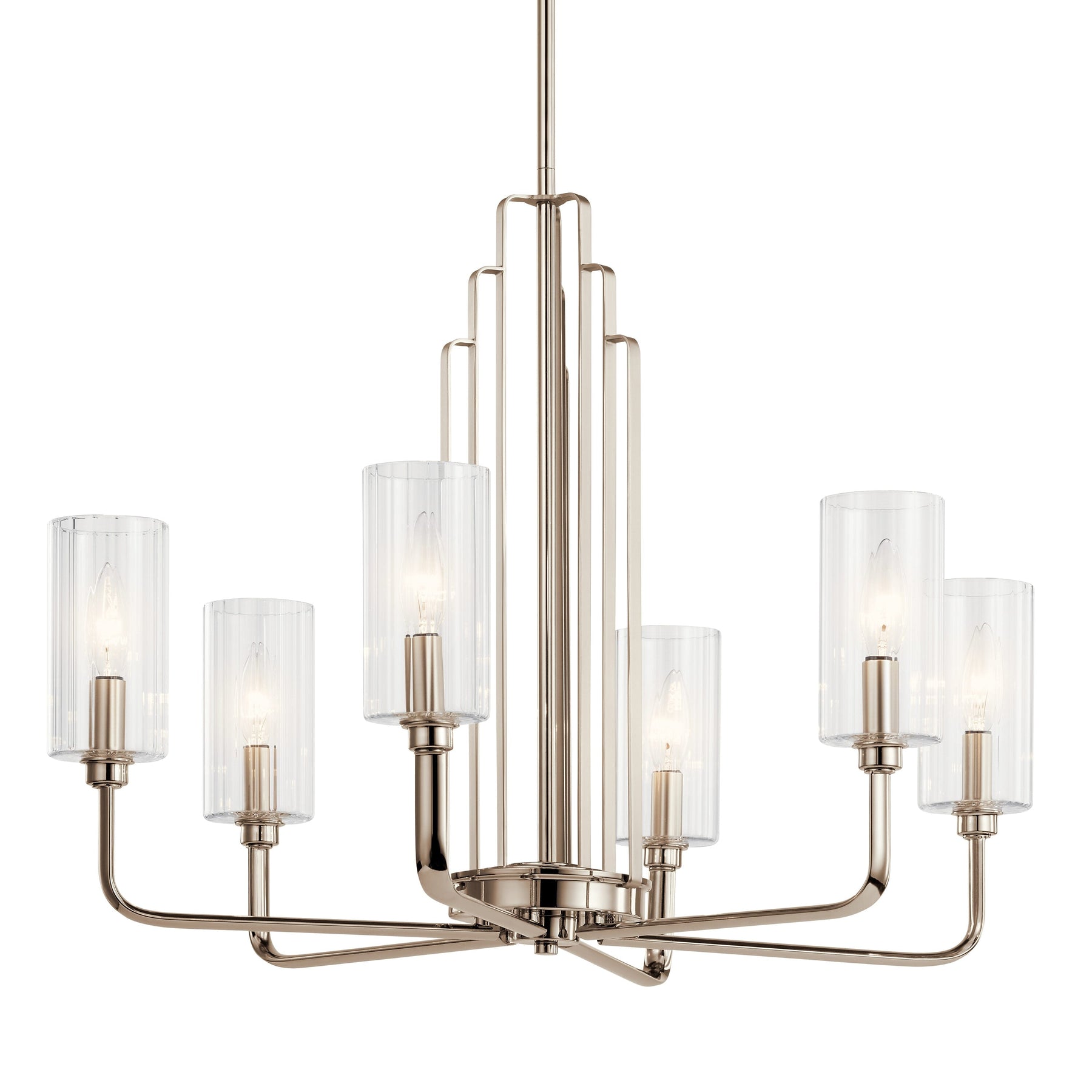 Elevate your space with the Kichler Kimrose 6-Light Polished Nickel Vintage Chandelier. This stunning fixture, inspired by Art Deco design, combines bold geometric shapes with a polished nickel finish and offers versatile lighting options with its clear ribbed glass shades. Perfect for dining rooms or foyers, it seamlessly blends timeless elegance with modern sophistication.