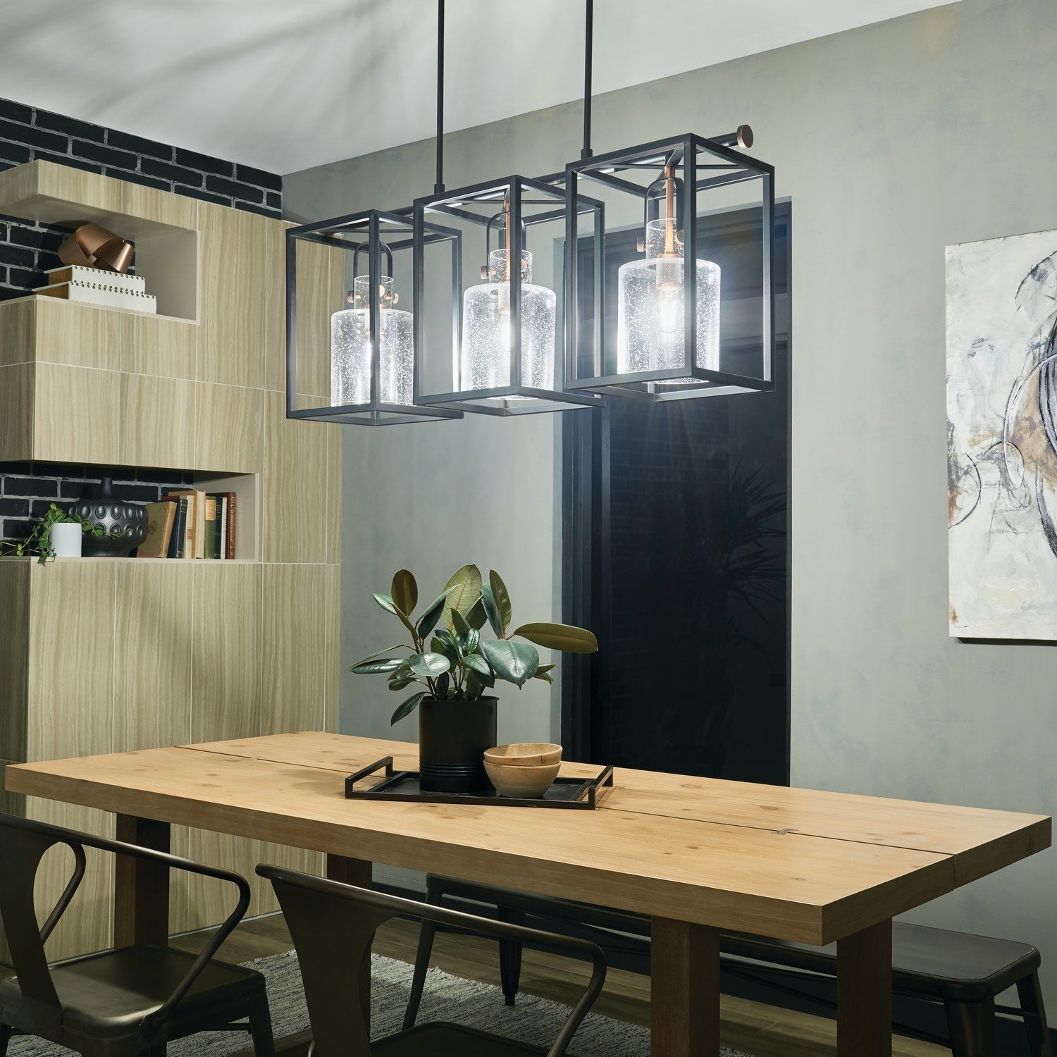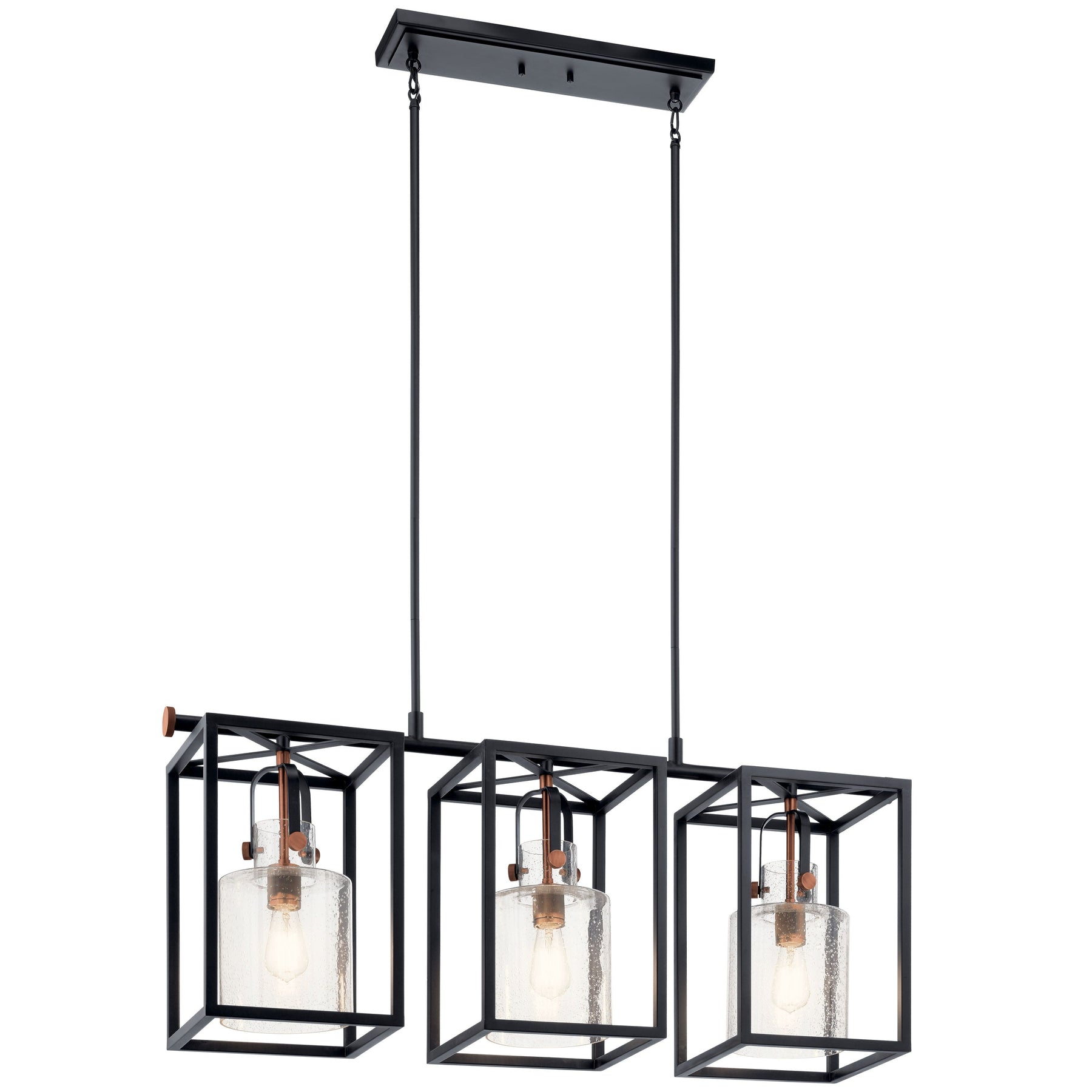 Elevate your space with the Kichler Kitner 3-Light Chandelier. Featuring a striking blend of black and antique copper finishes, this industrial-style chandelier is complemented by clear seeded glass shades, making it a perfect centerpiece for modern or transitional interiors.