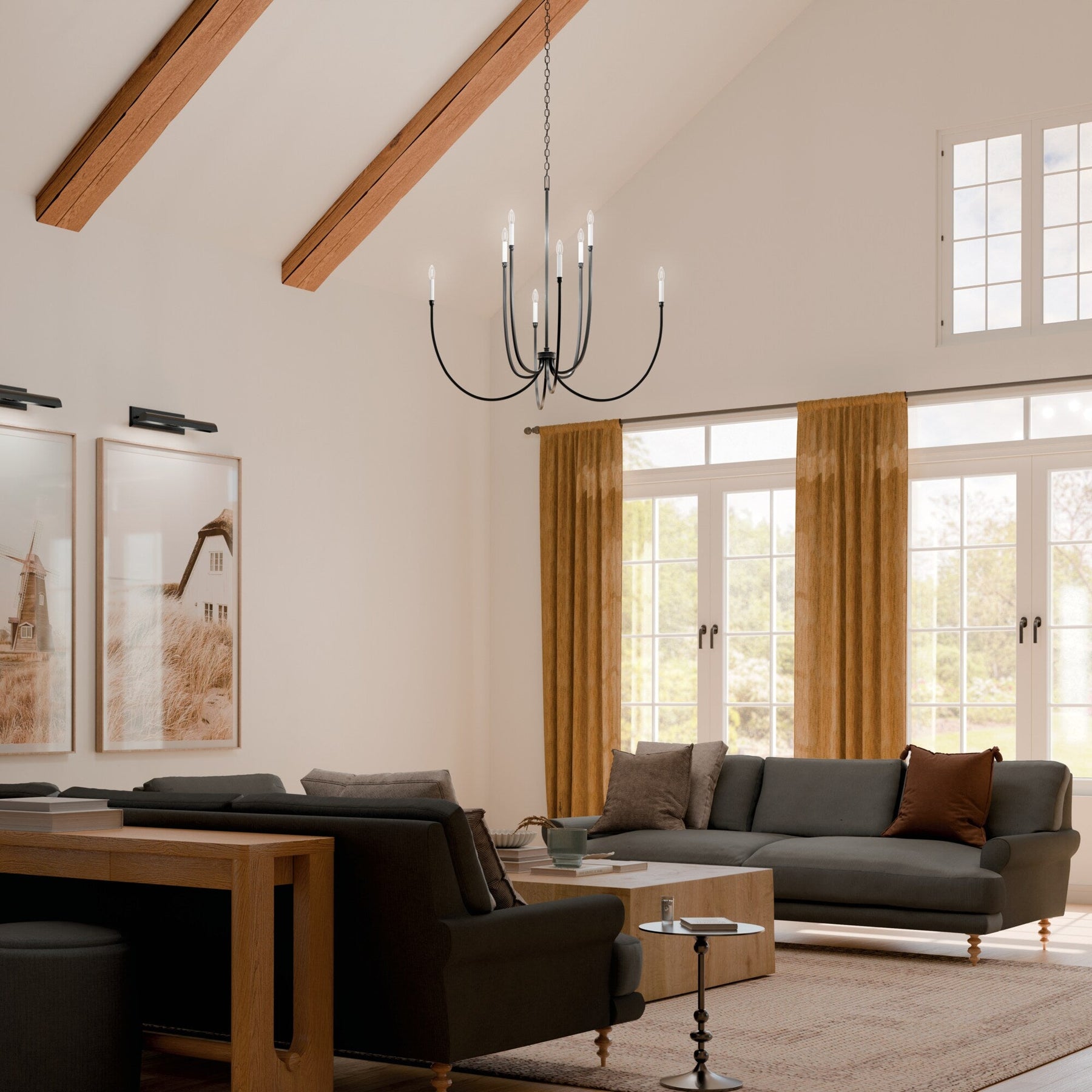 Illuminate your space with the Kichler Malene 8-Light Black Traditional Bare Bulb Chandelier, a versatile piece that enhances traditional aesthetics with a modern twist. Its elegant design, reminiscent of flowing water, brings both drama and subtlety, making it a perfect addition to your dining room, foyer, or living area.