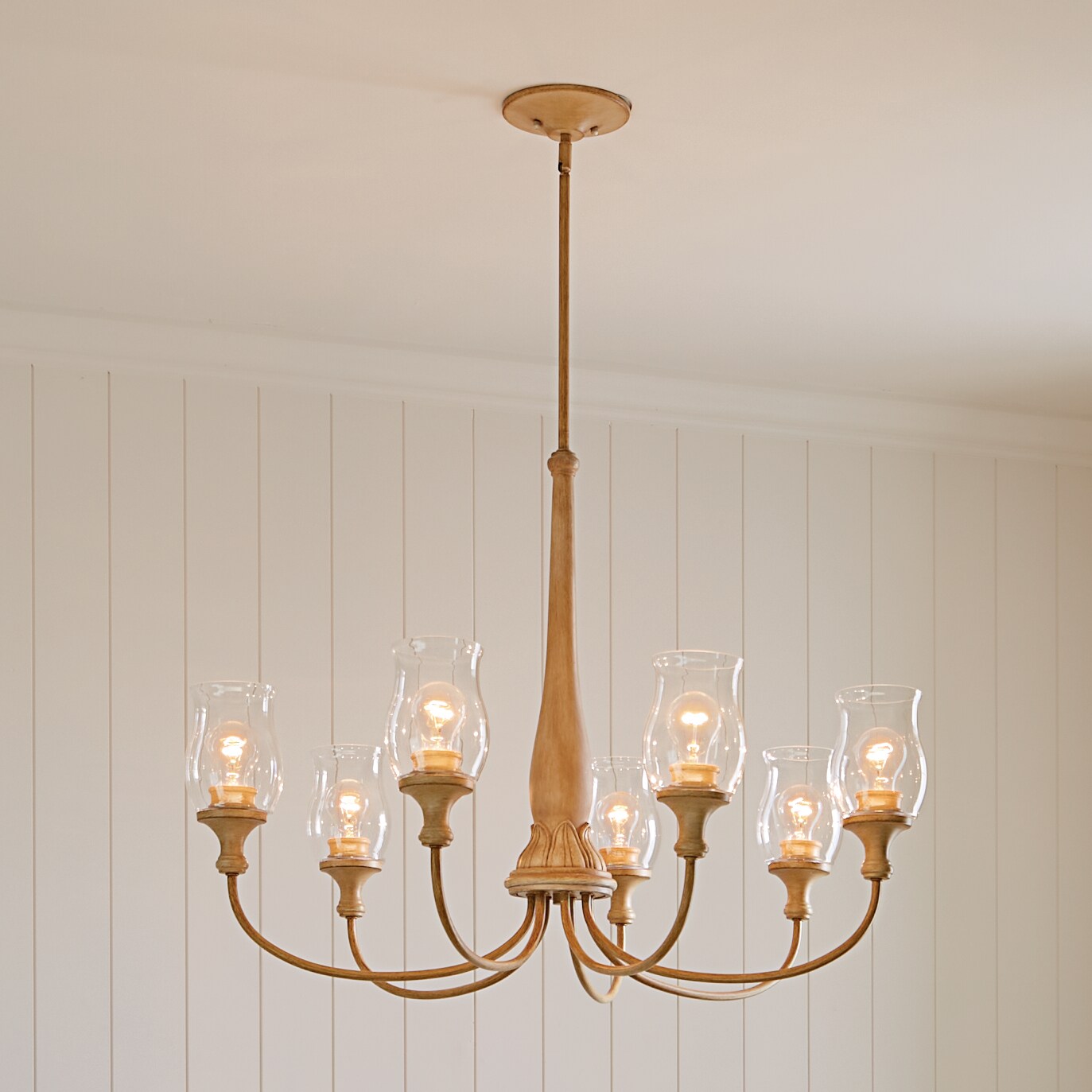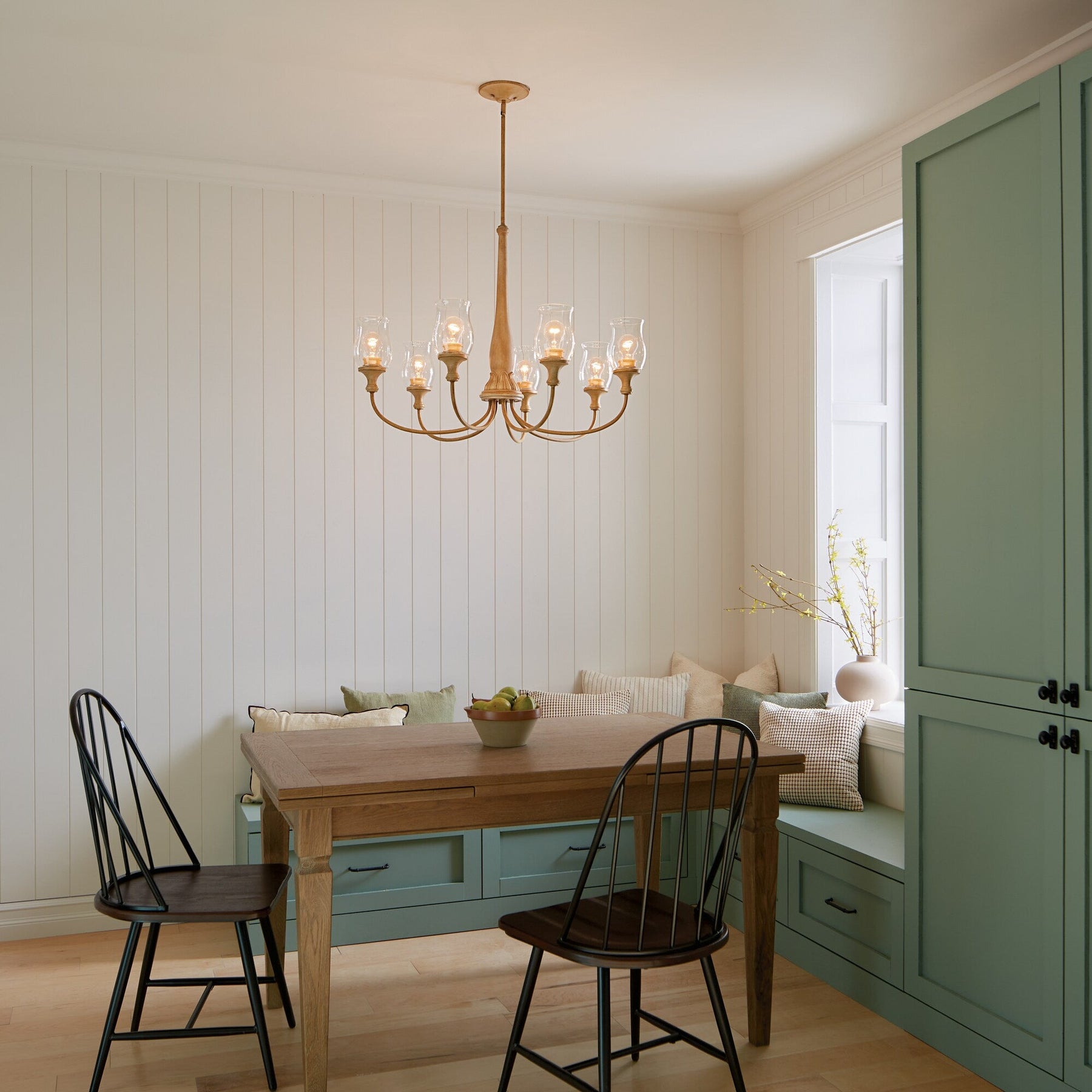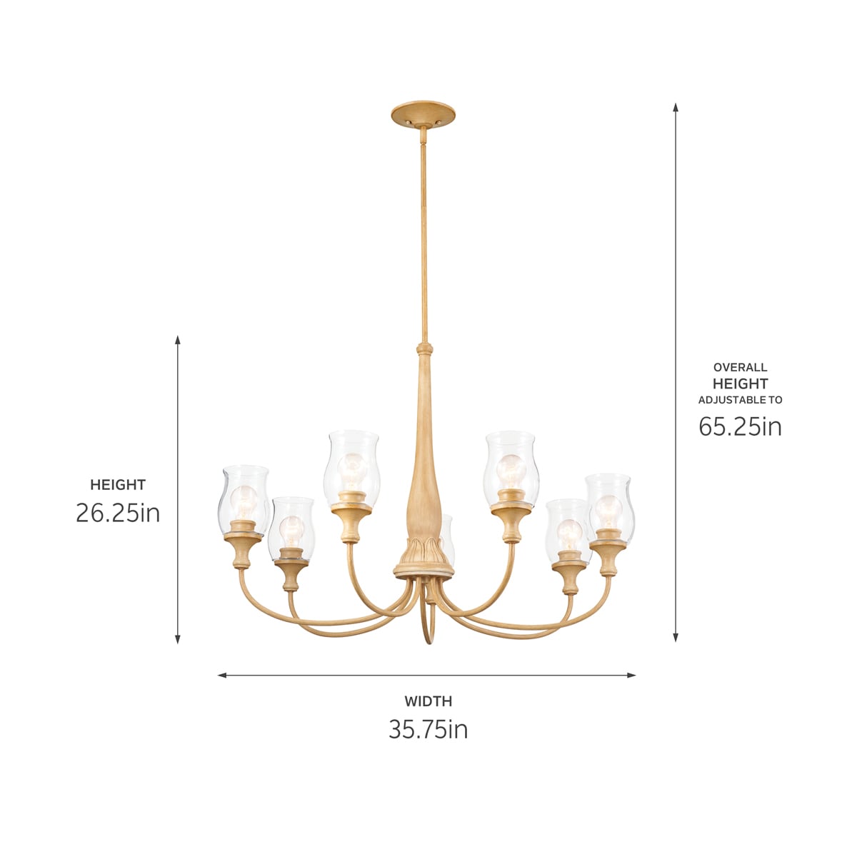 Illuminate your space with the Kichler Melis 7-Light Chandelier, a stunning blend of vintage design and modern elegance. Its Warm Maple wood finish and clear glass shades bring a natural, inviting warmth that perfectly accents farmhouse or cottagecore interiors. Ideal for kitchen or dining areas, this chandelier casts a gentle, ambient light that's both functional and chic.