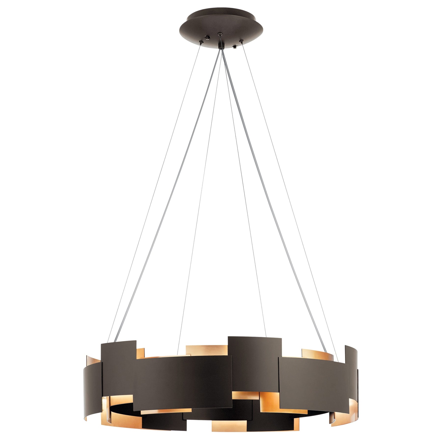 The Kichler Moderne Chandelier transforms any room with its captivating geometric design and warm Olde Bronze finish, casting an inviting glow that enriches and elevates your space. This fixture's interplay of suspended cables and bold panels commands attention while seamlessly integrating into modern interiors. Exude sophistication by placing it over a stylish dining table or as a showpiece in your living room. This chandelier is not just a lighting solution; it is a statement piece that defines luxury with a contemporary flair.