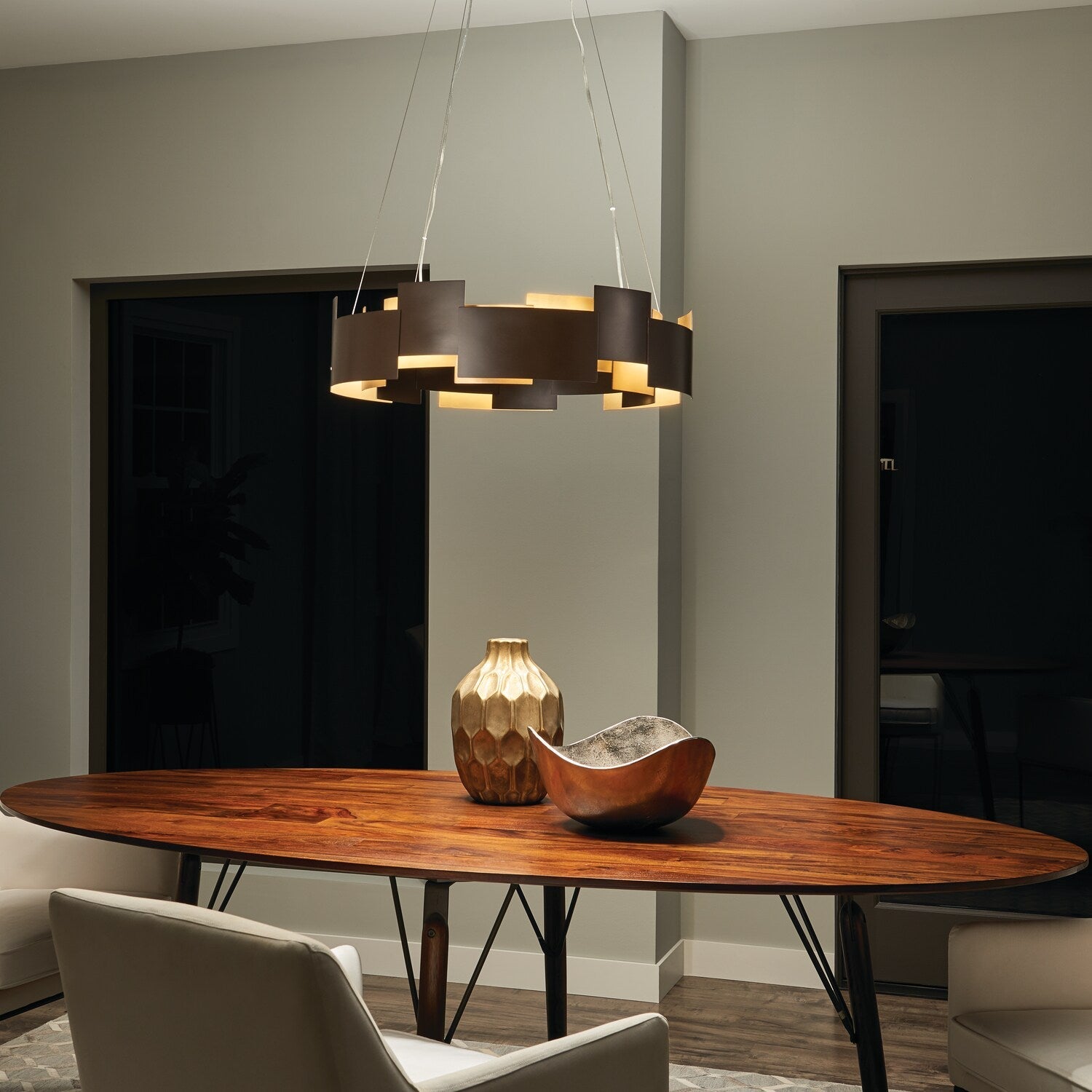 Illuminate your modern space with the Kichler Moderne LED Chandelier. This striking fixture features a contemporary geometric design in a warm Olde Bronze finish, powered by an integrated LED light source, delivering inviting and efficient lighting. Ideal for dining rooms, kitchens, or living areas, it embodies sophistication and energy efficiency.