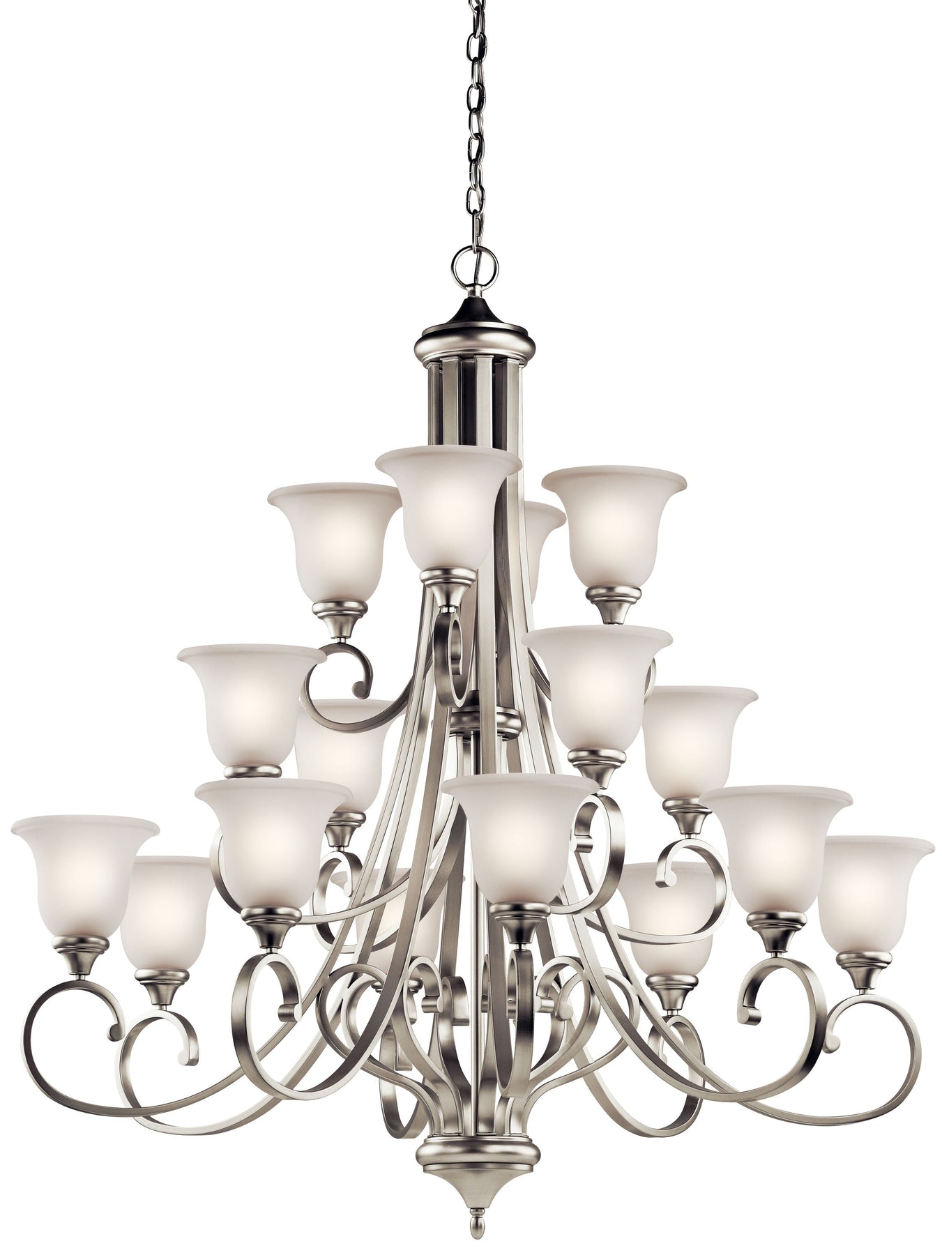 Illuminate your home with the Kichler Monroe 16-Light Brushed Nickel Chandelier, a blend of elegance and functionality. This traditional tiered fixture features sixteen lights and satin-etched glass shades, perfect for illuminating large spaces like a dining room or foyer. Its brushed nickel finish adds a contemporary touch to a classic design.
