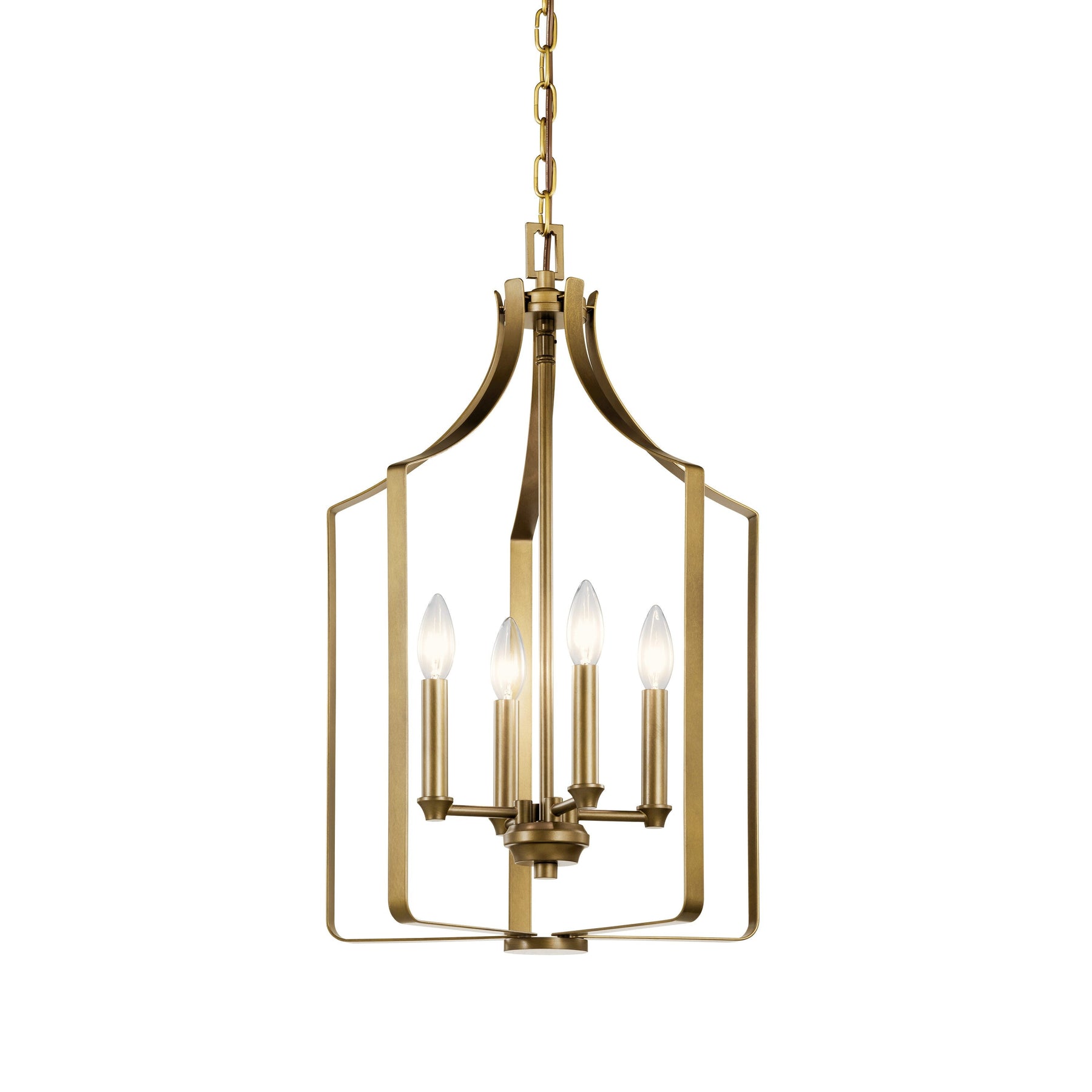 Illuminate your space with the Kichler Morrigan 4-Light Traditional Cage Chandelier. Crafted in elegant natural brass, this sophisticated fixture melds modern design with traditional charm, creating a captivating focal point in any room. Perfect for dining areas, foyers, or living rooms, this chandelier brings a touch of timeless elegance to your home.