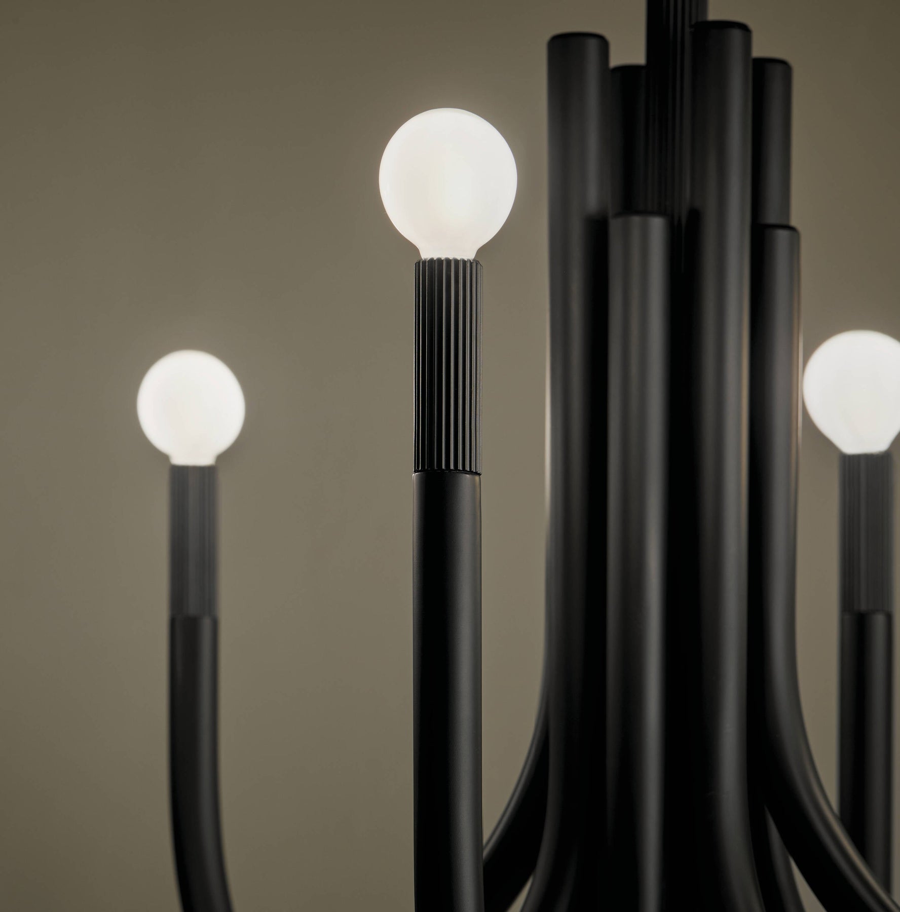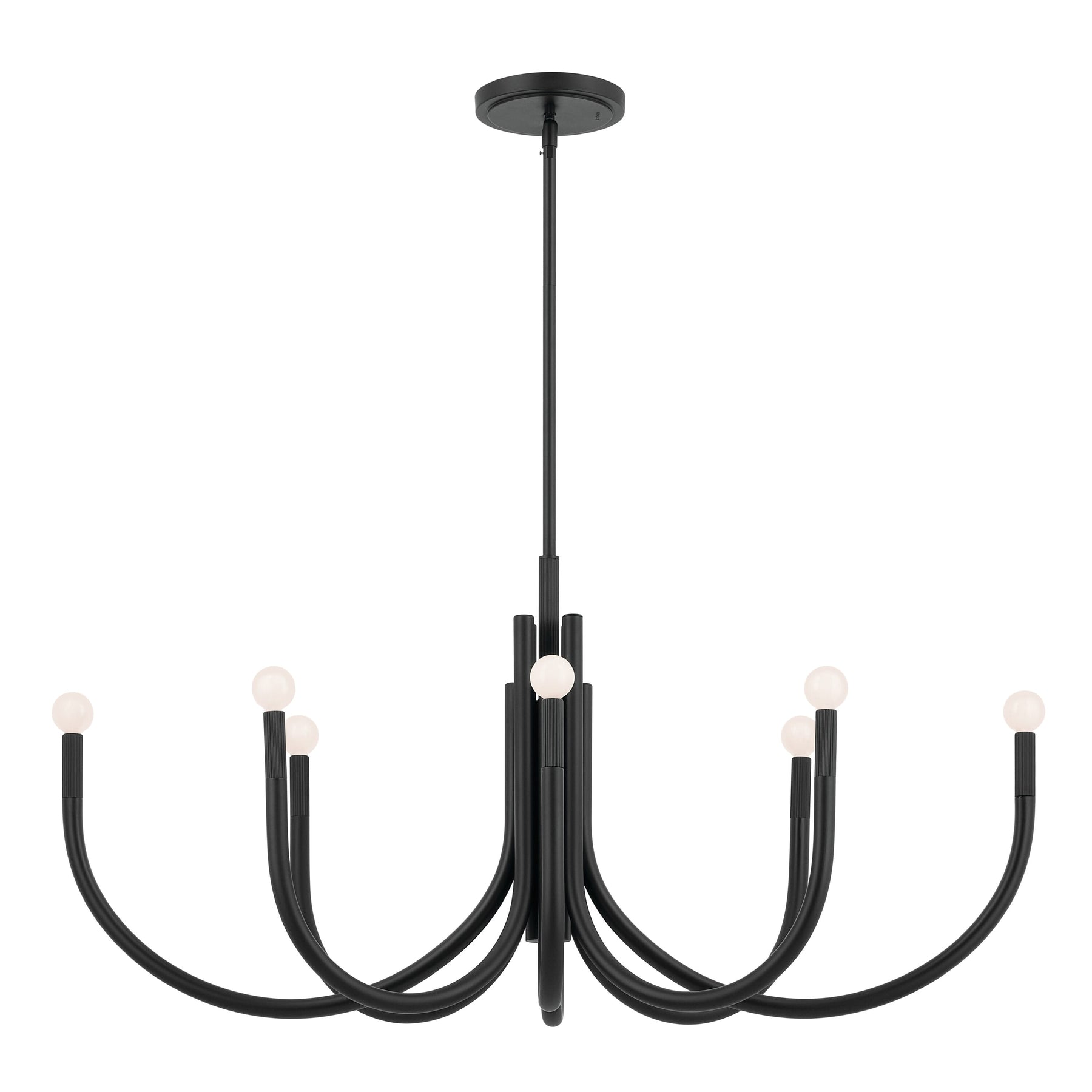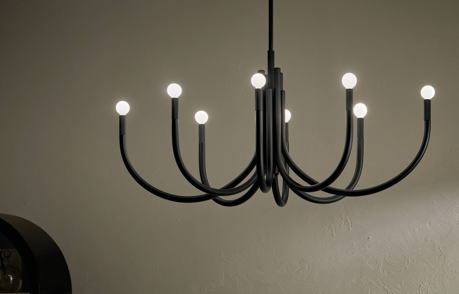 The Kichler Odensa Chandelier transforms any setting into a statement of refined modernity. Its sleek black finish and gracefully arching lines create a visual dance that breathes sophistication into any space. Style it with elegant white globe bulbs to accentuate its contemporary edge, making this chandelier an absolute must for those seeking luxury in illumination. The Odensa is more than just a light fixture—it's a gateway to elevated living, where every dinner becomes a stunning affair.