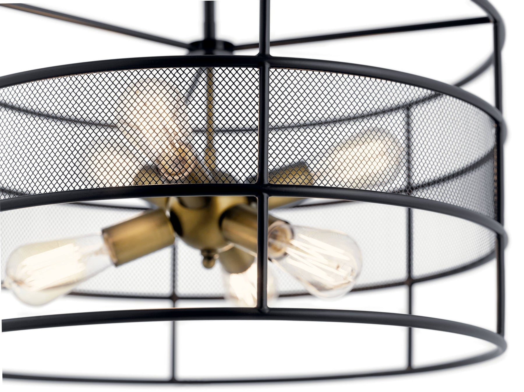 - Design: Features a modern, black mesh cage with natural brass accents for a transitional look.