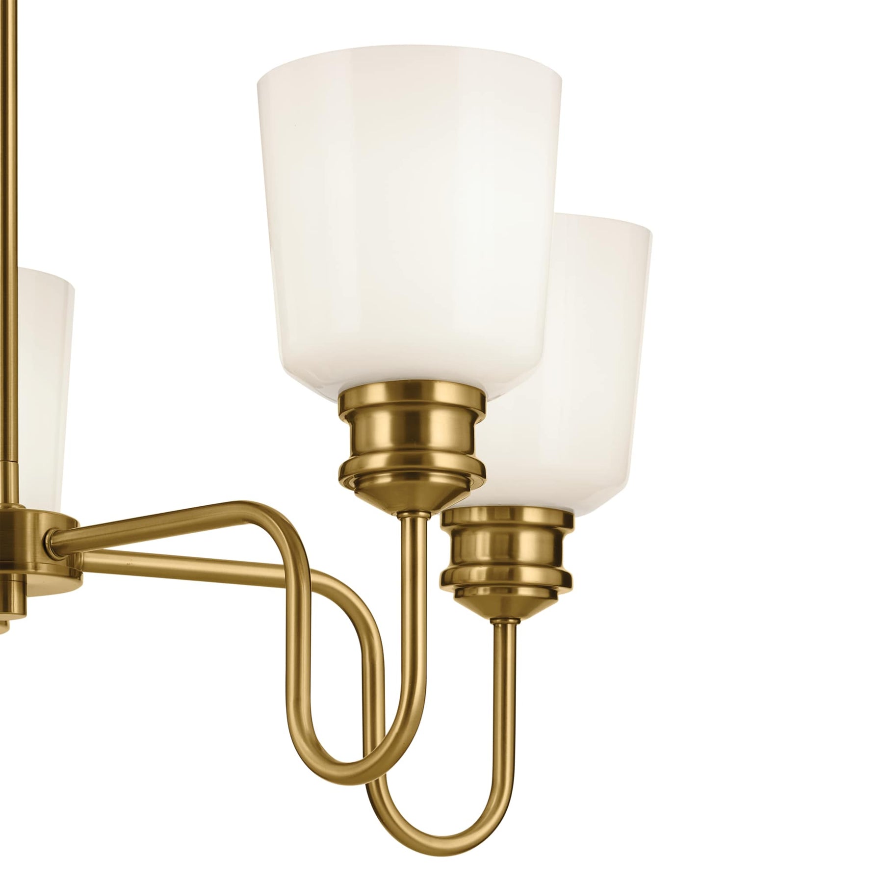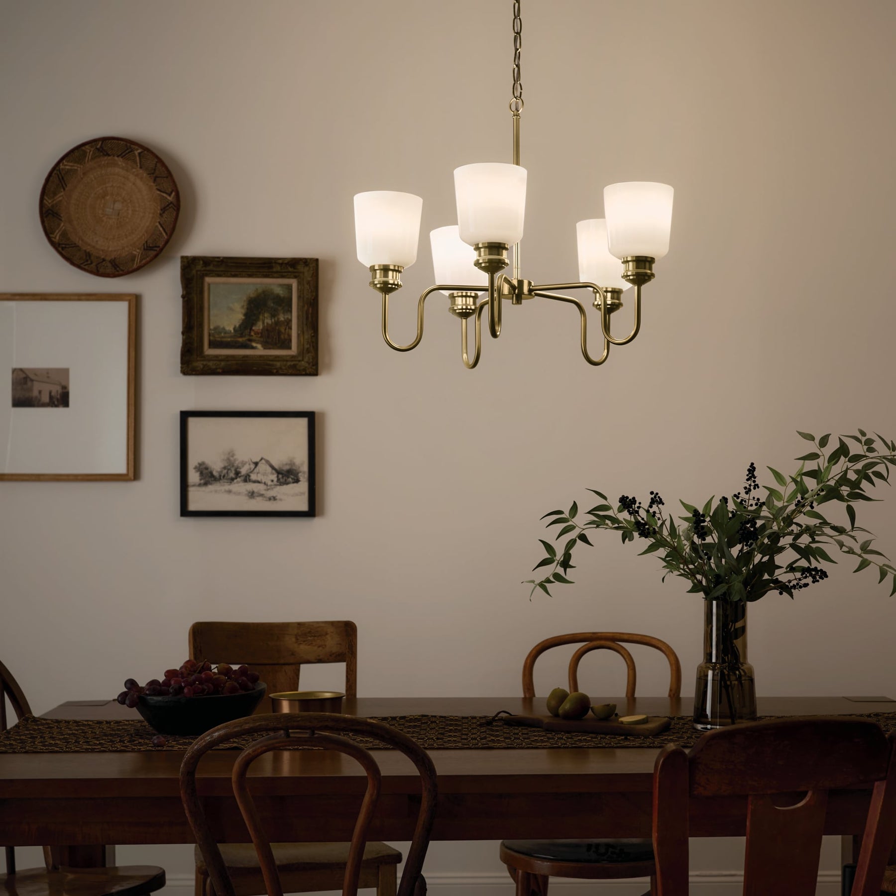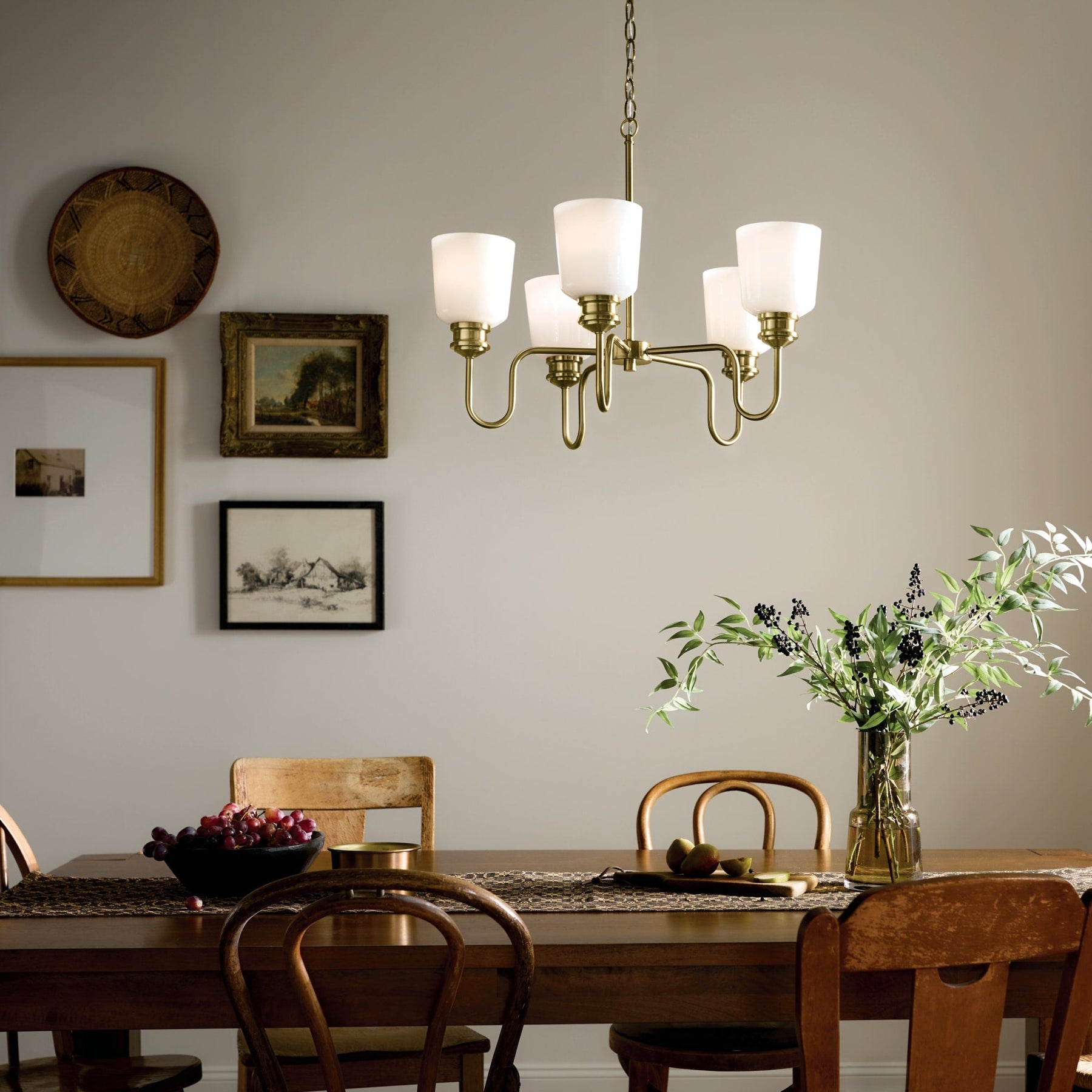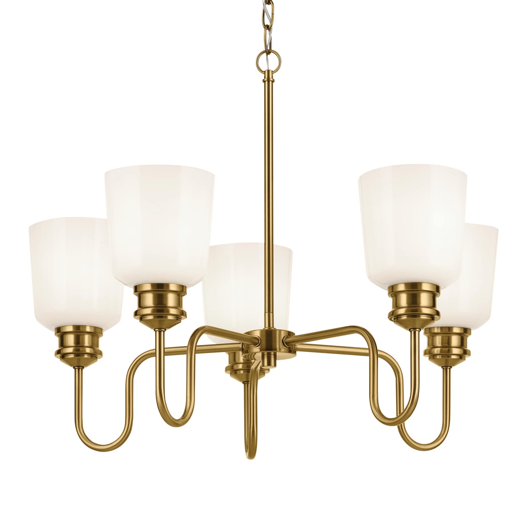 Illuminate your space with the Kichler Renneker 5-Light Vintage Chandelier, a captivating blend of vintage elegance and modern craftsmanship. This chandelier effortlessly combines a brushed natural brass finish with opal glass shades to create a warm, inviting ambiance perfect for any dining room or foyer.