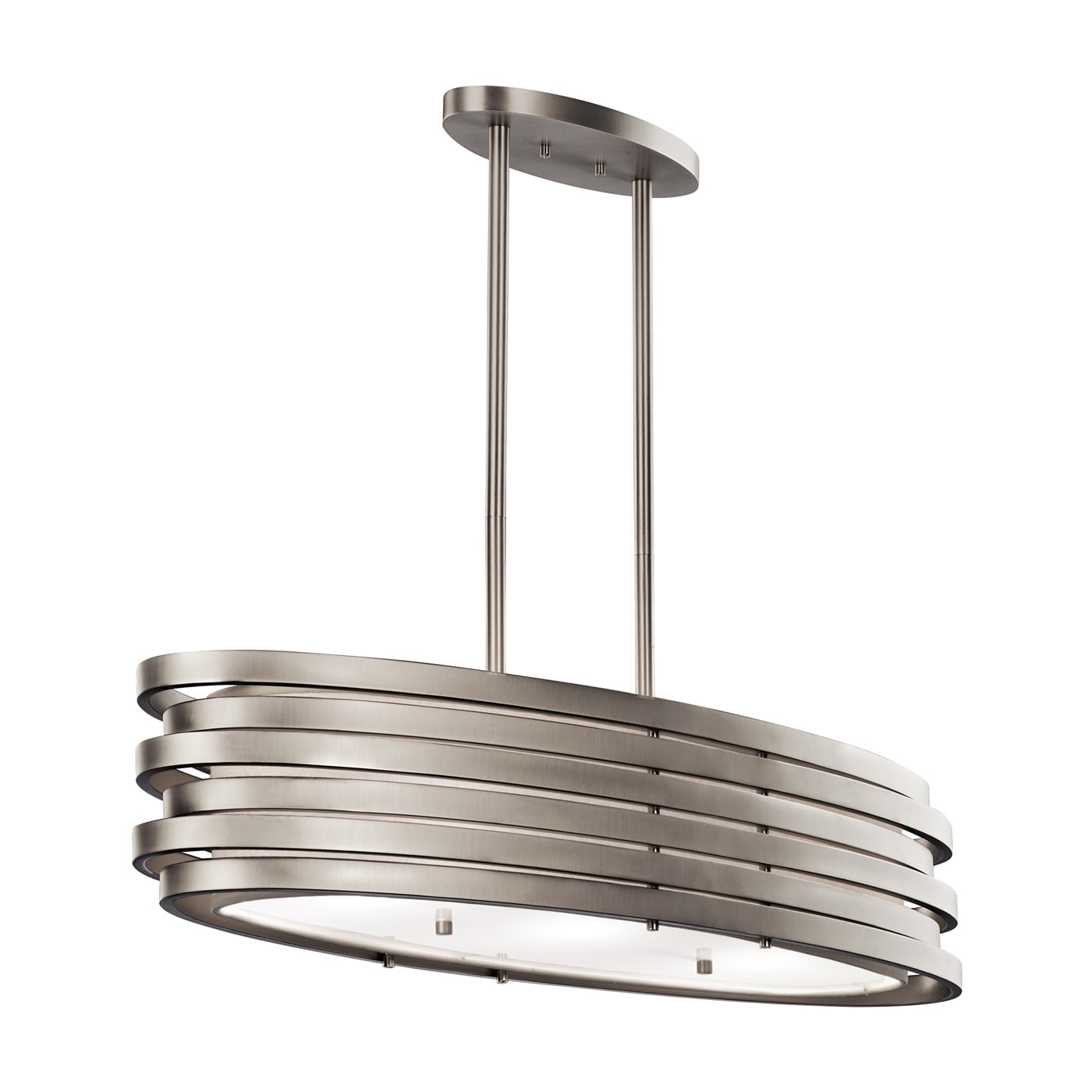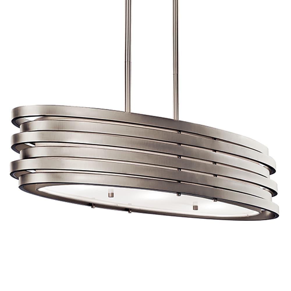 Elevate your interior with the Kichler Roswell 3-Light Chandelier, featuring a sleek brushed nickel finish and a contemporary linear design. This striking chandelier is perfect for adding modern elegance to your dining or kitchen spaces, blending seamlessly with transitional decor.