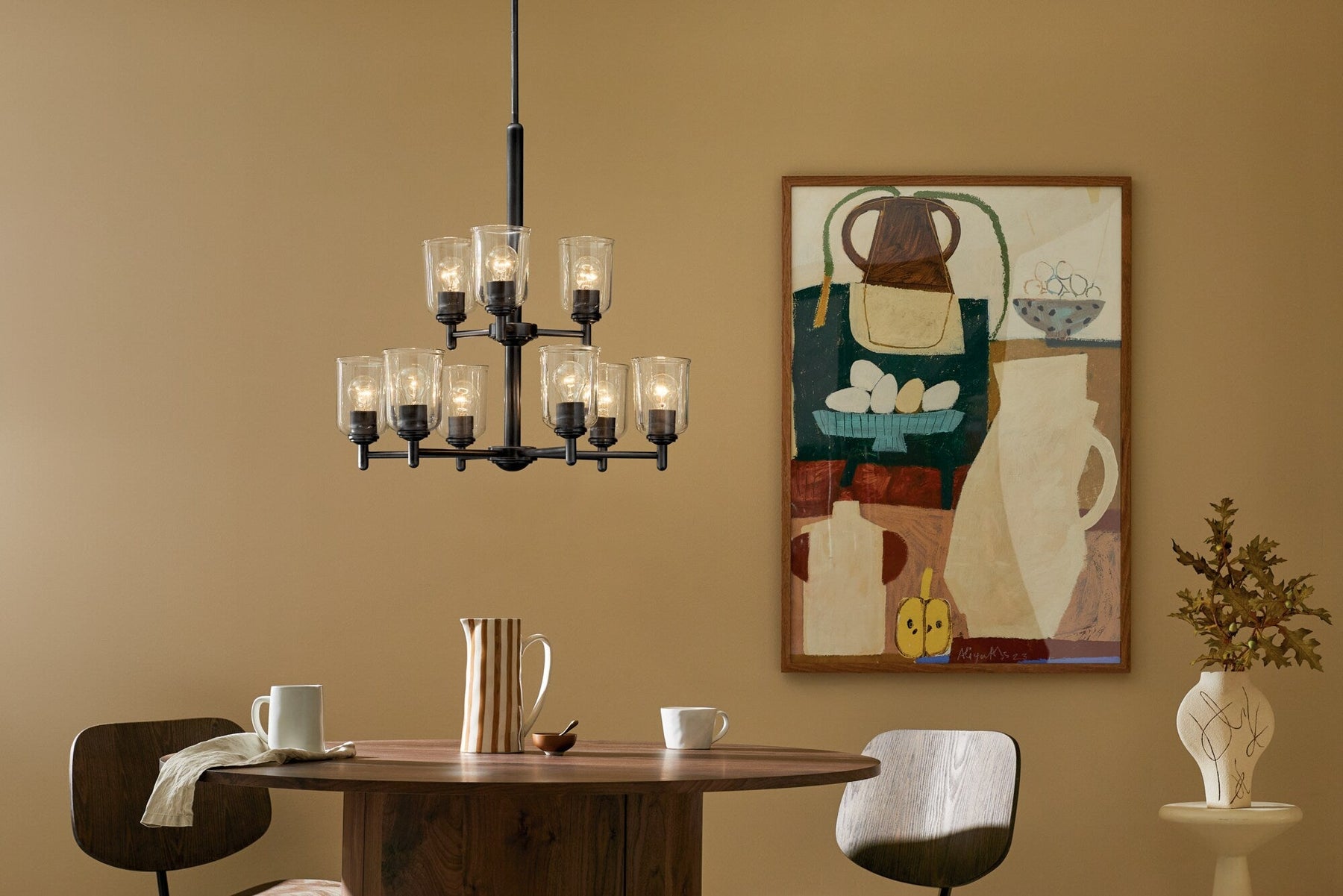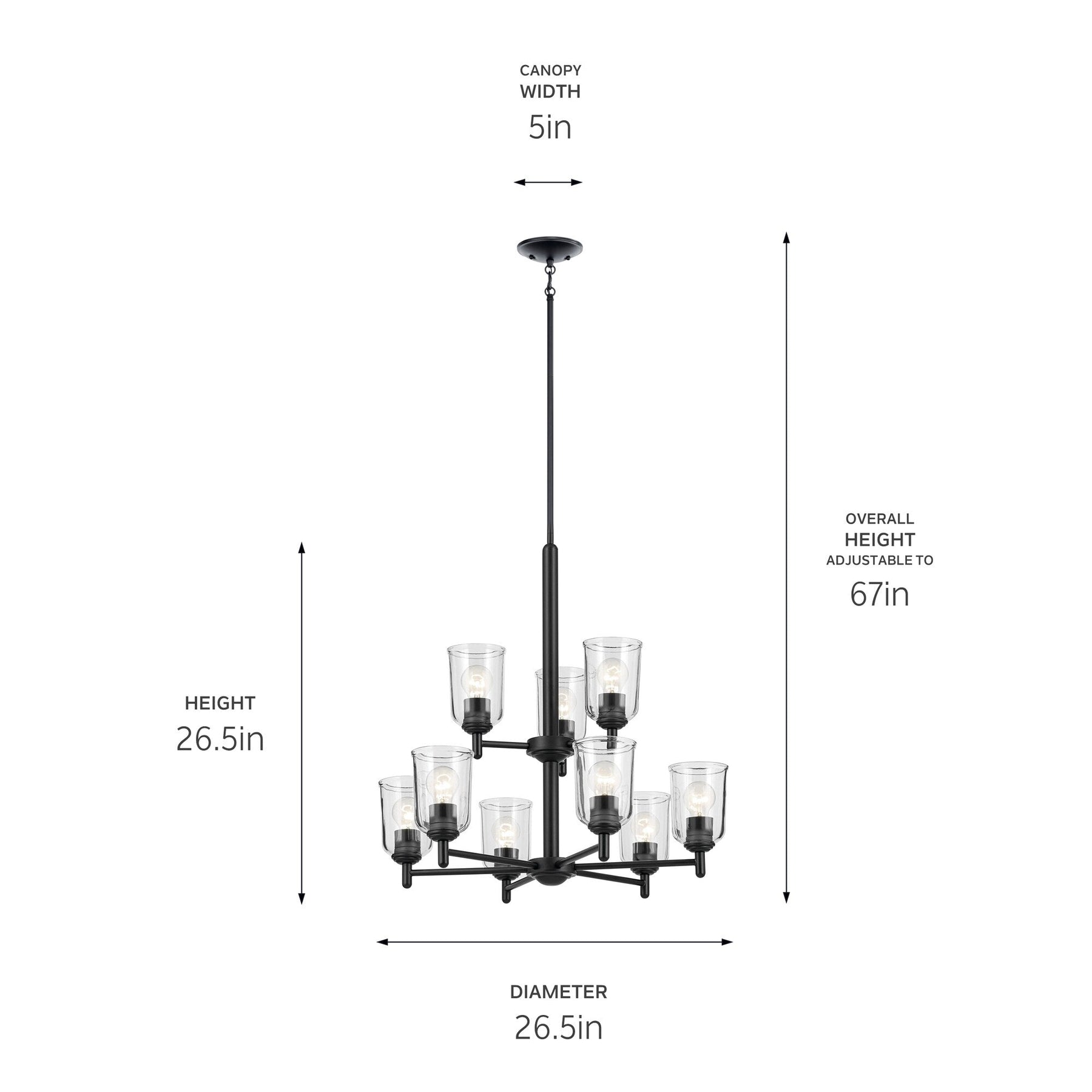 Illuminate your space with the timeless elegance of the Kichler Shailene 9-Light Black Chandelier. This traditional chandelier provides a captivating glow, featuring a durable steel frame with a sleek, black finish that complements any decor. The clear glass shades contribute to its sophisticated allure, making it a perfect addition to foyers or dining areas.