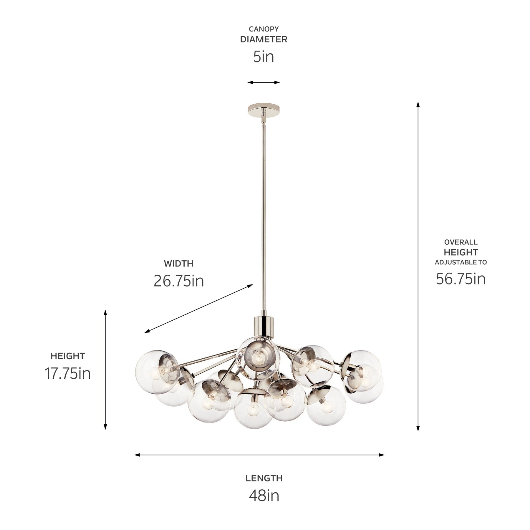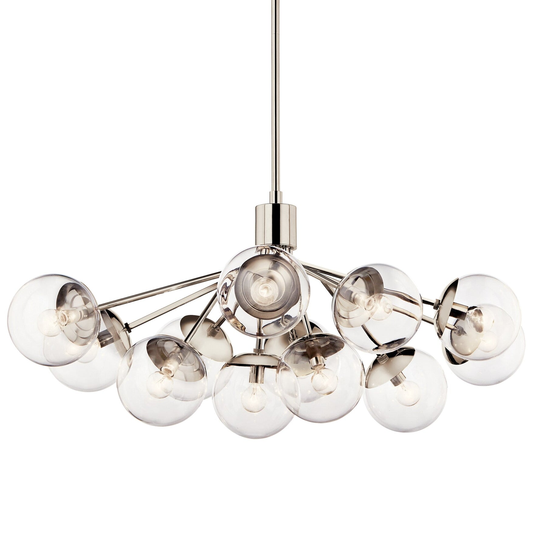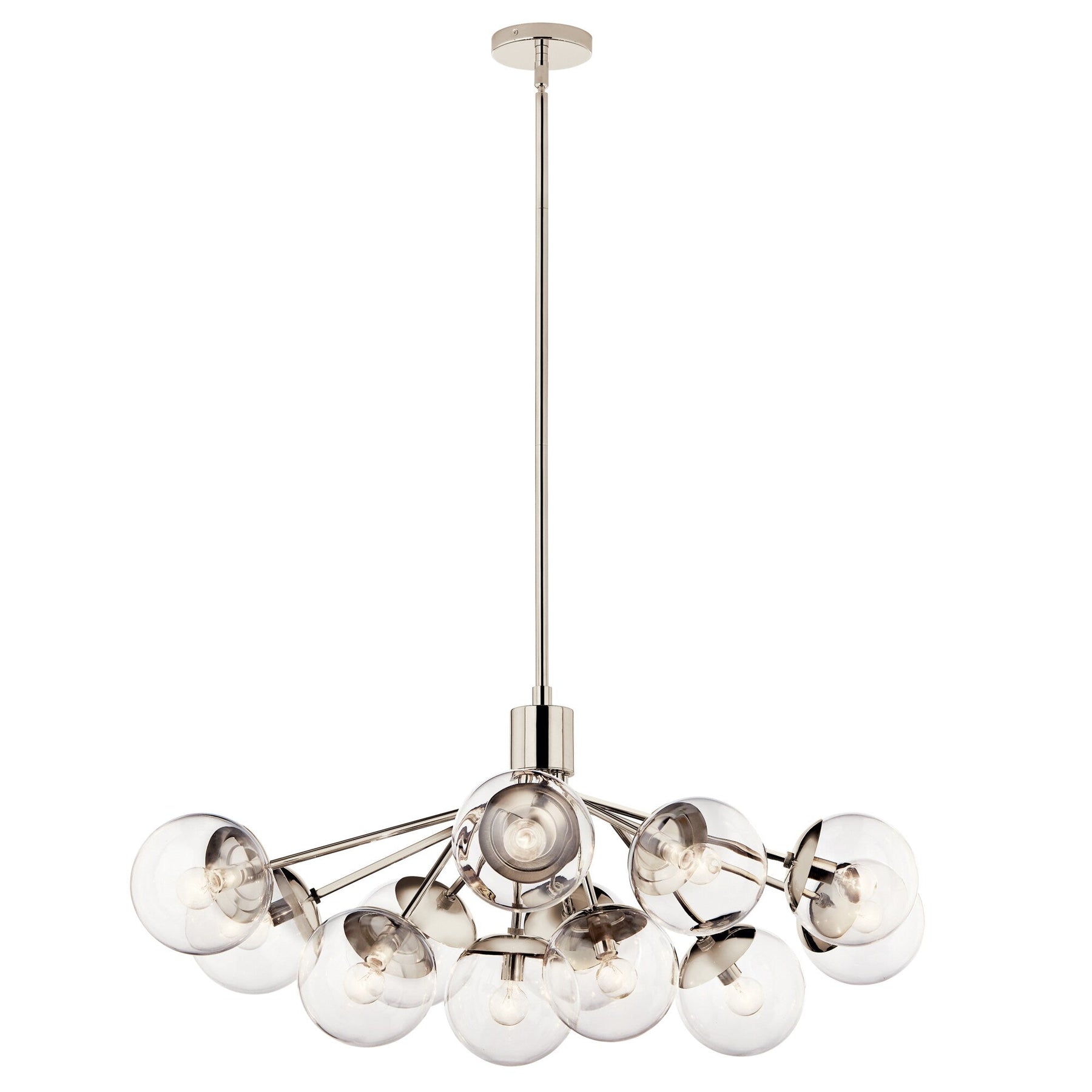 The Kichler Silvarious 12-Light Chandelier is a captivating centerpiece that embodies modern elegance with its sputnik-inspired design and polished nickel finish. Clear glass shades enhance its illumination, making it a stunning addition to any contemporary living or dining space.