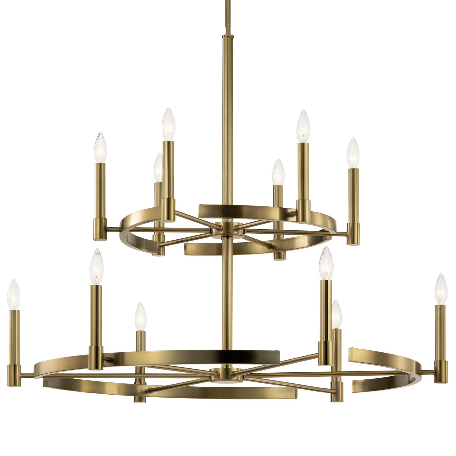 The Tolani 12-Light Chandelier by Kichler redefines modern elegance with its stunning ribbed center column and striking double-tiered wagon wheel design. Finished in brushed natural brass, it provides an ambient glow that's perfect for larger spaces like foyers or dining rooms, combining contemporary style with hints of Hollywood glamour.