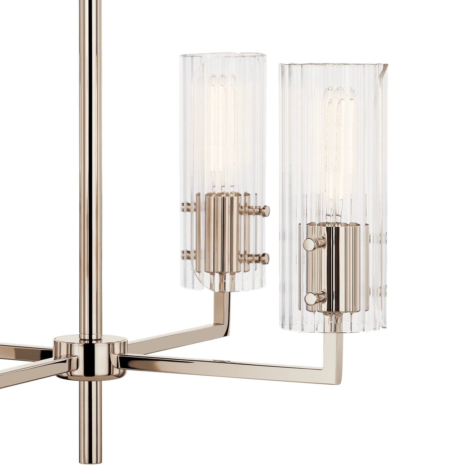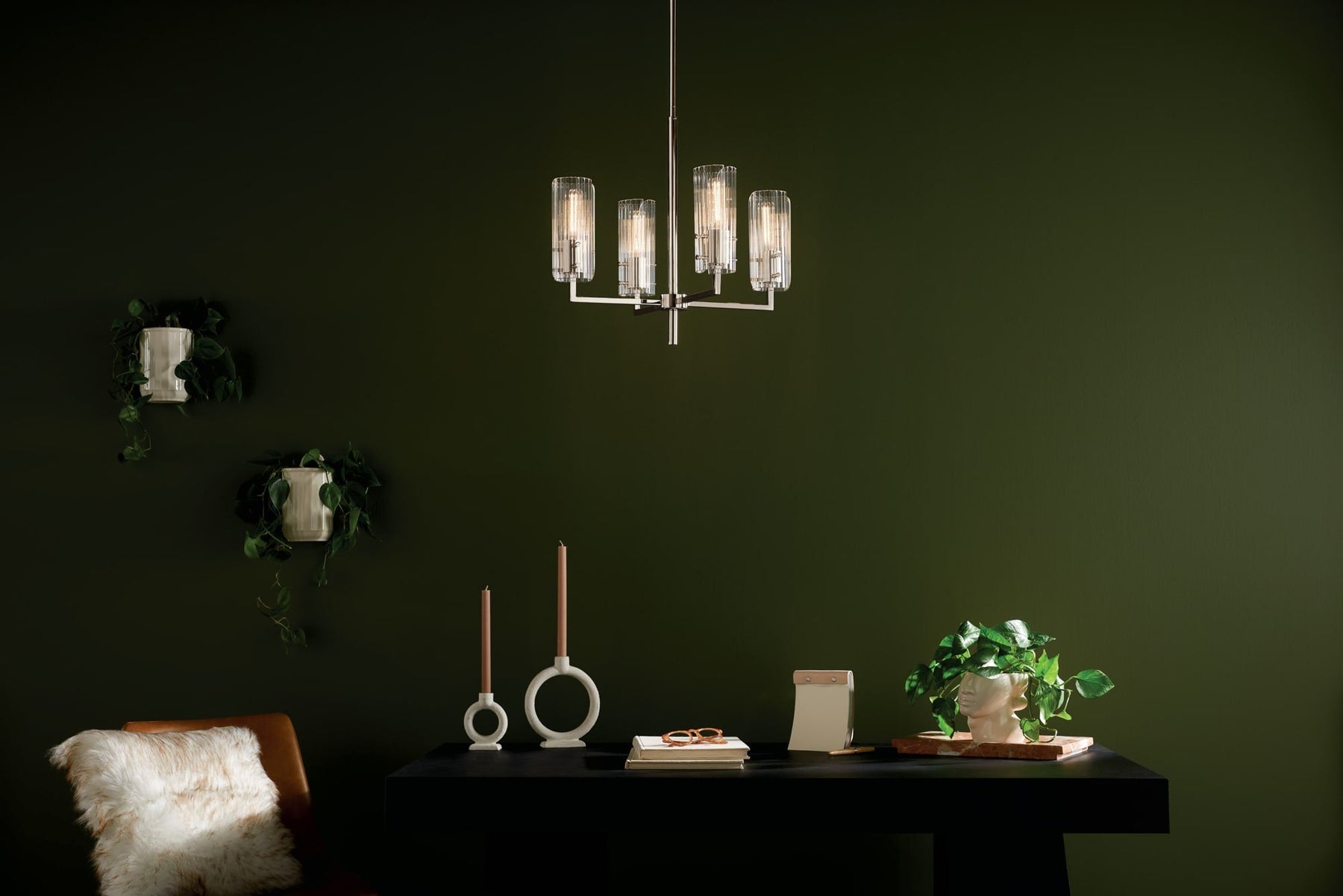 Elevate your interior with the Kichler Velestino 4-Light Chandelier, a blend of modern refinement and organic fluidity. This chandelier's polished nickel finish and unique fluted glass shades offer both style and functional lighting, transforming any room into a contemporary haven.