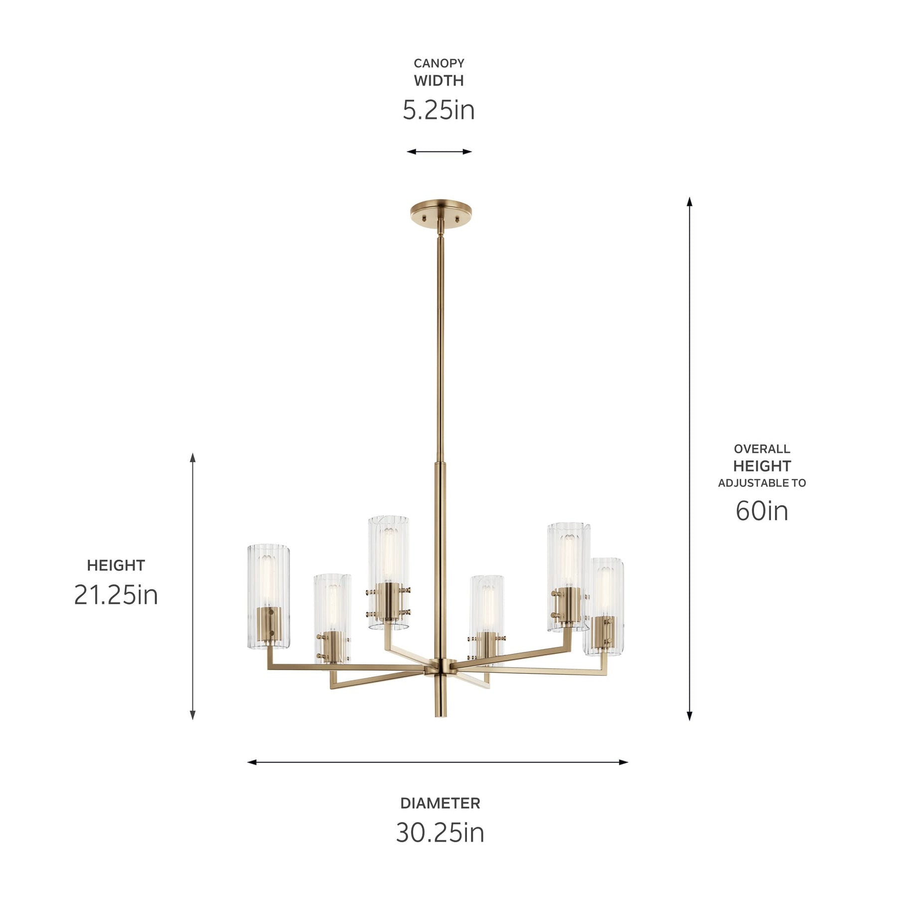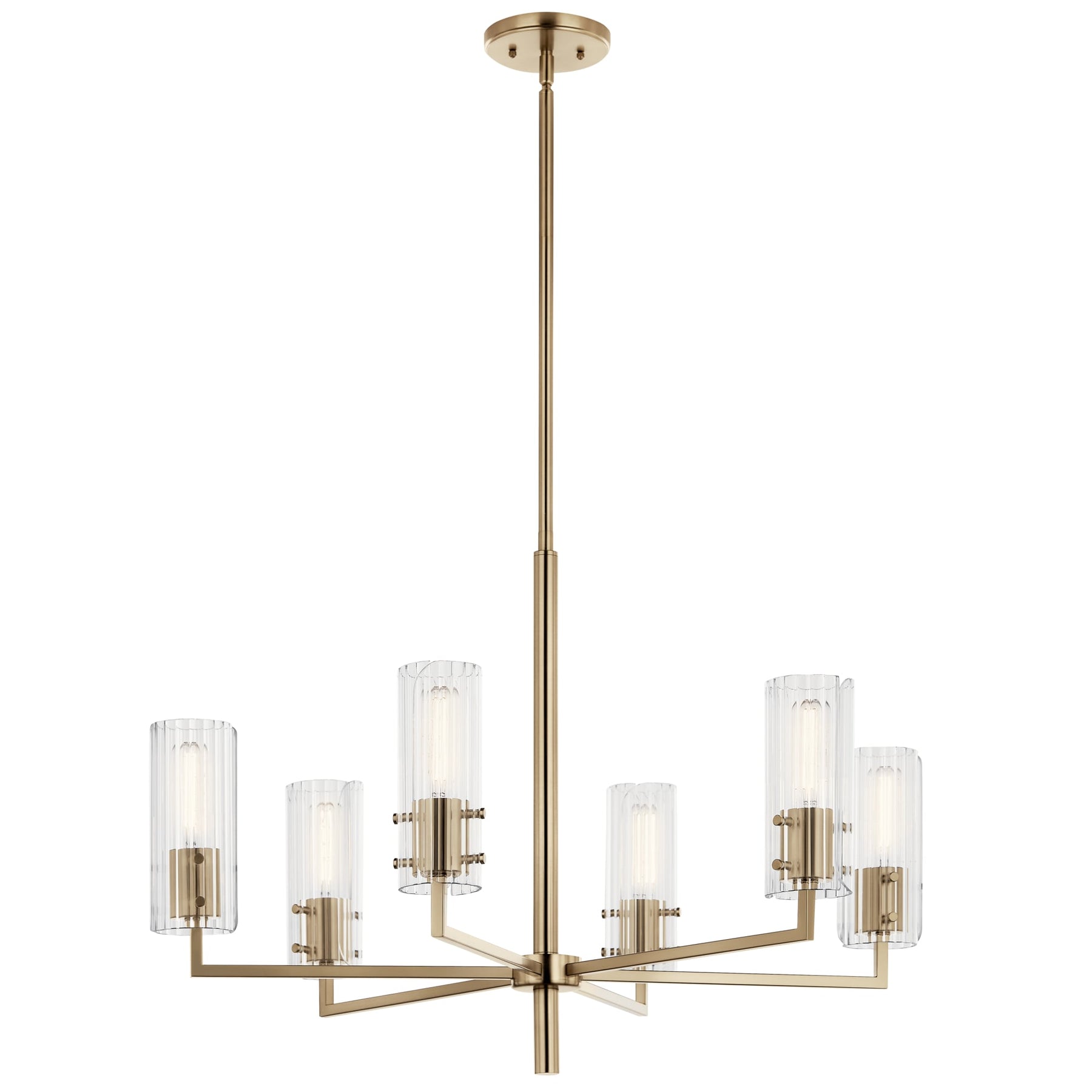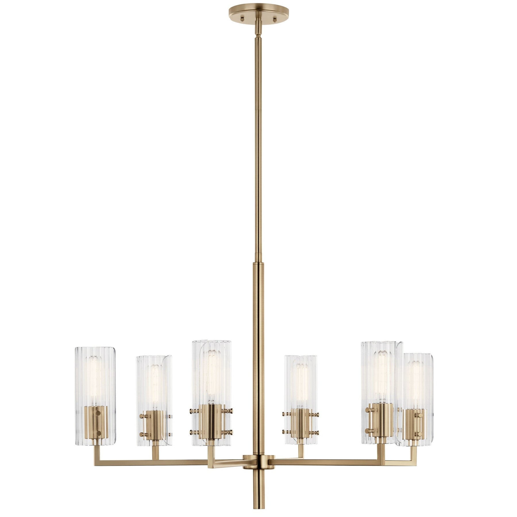 Illuminate your space with the Kichler Velestino 6-Light Chandelier in a warm, brushed gold finish. This modern masterpiece combines clean lines with elegant curves, highlighted by its unique fluted glass that diffuses light beautifully. Perfectly suited for dining and living areas, it adds a sophisticated touch to any interior.