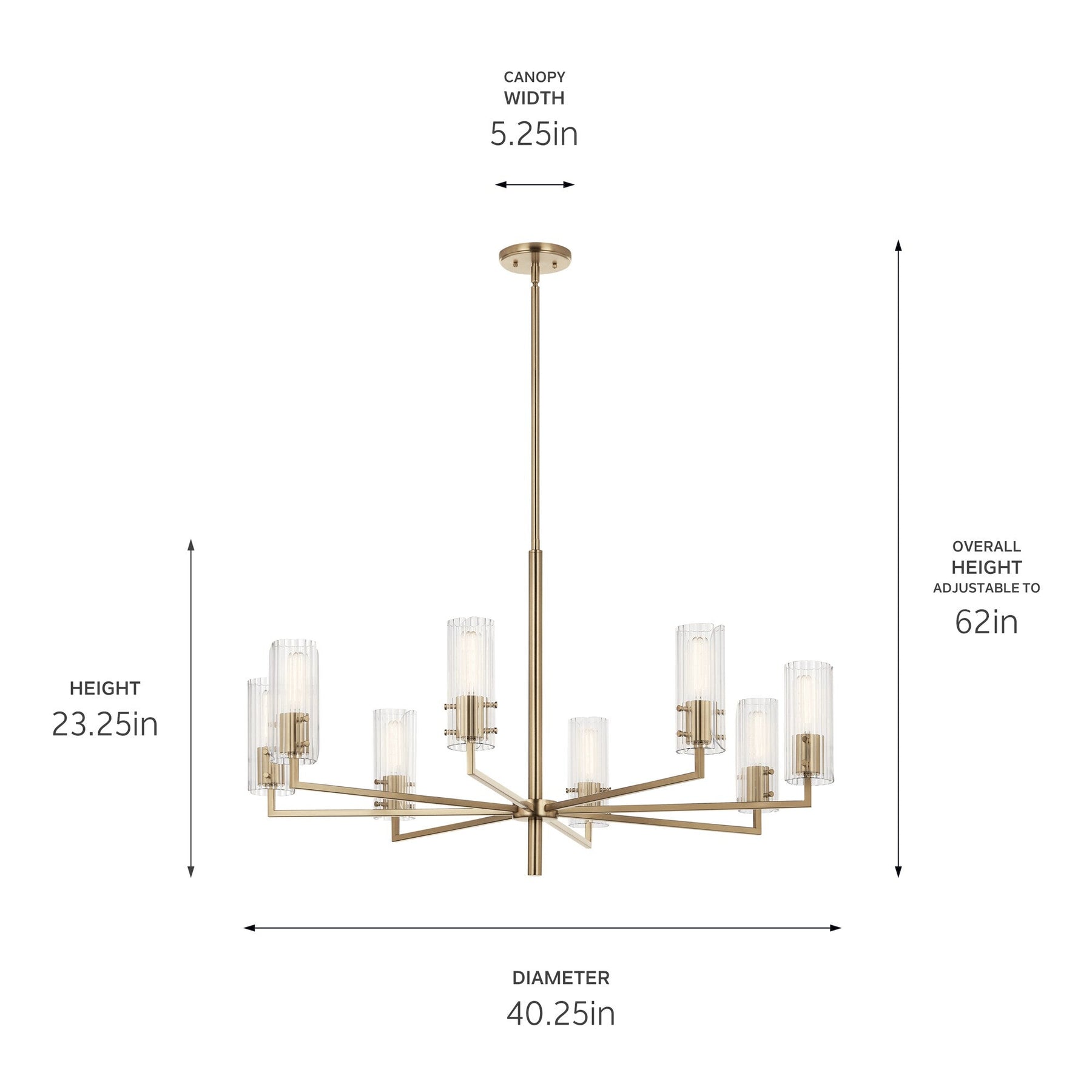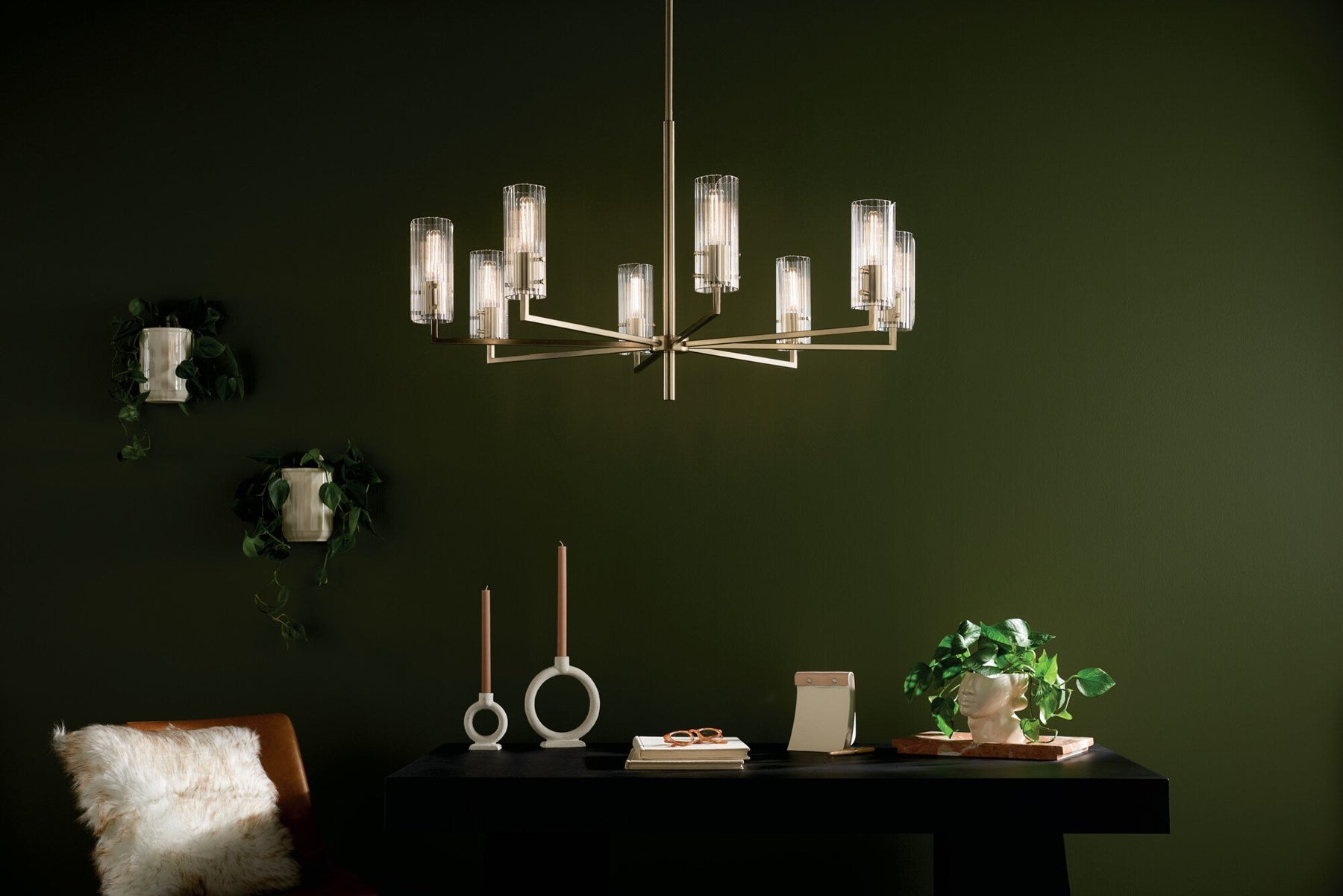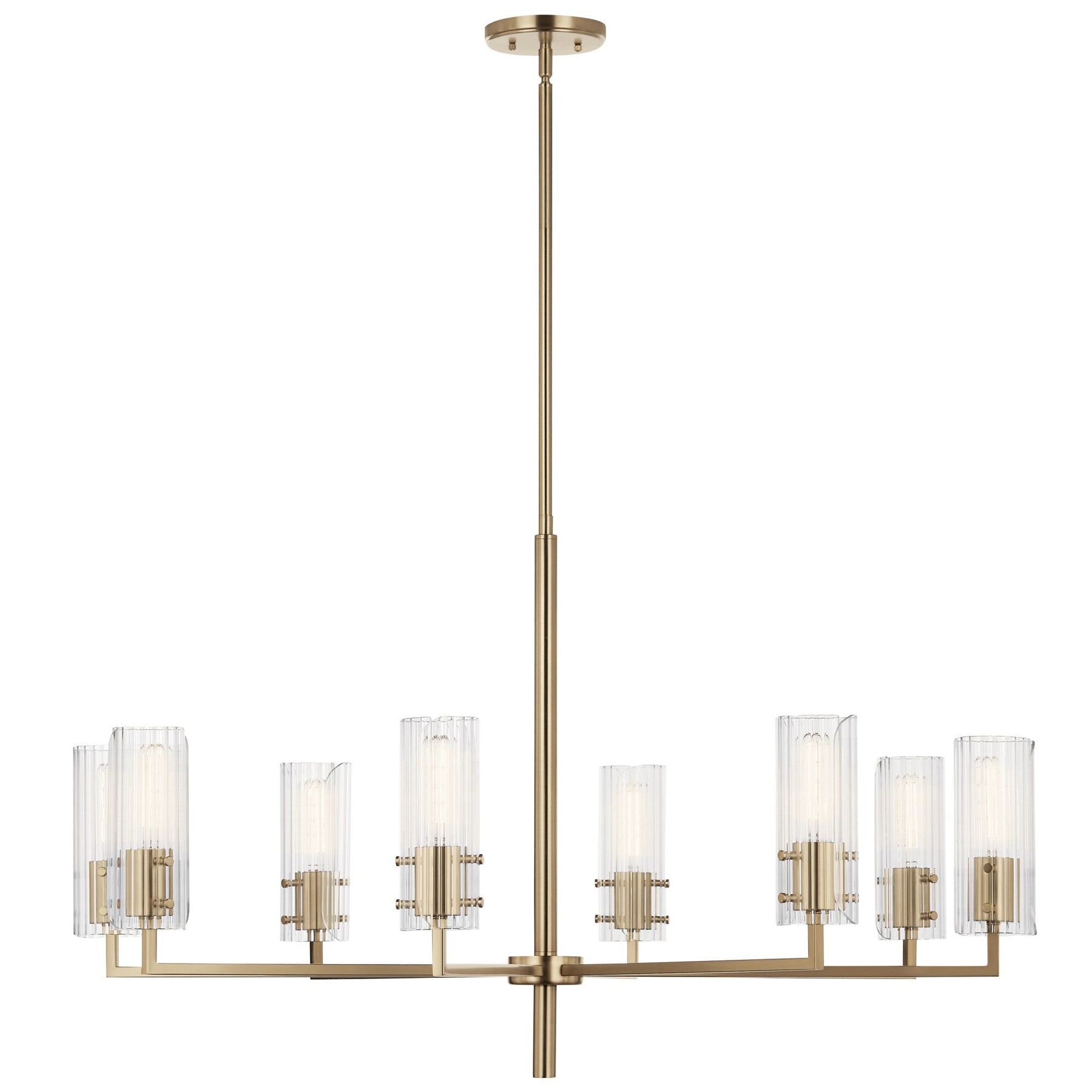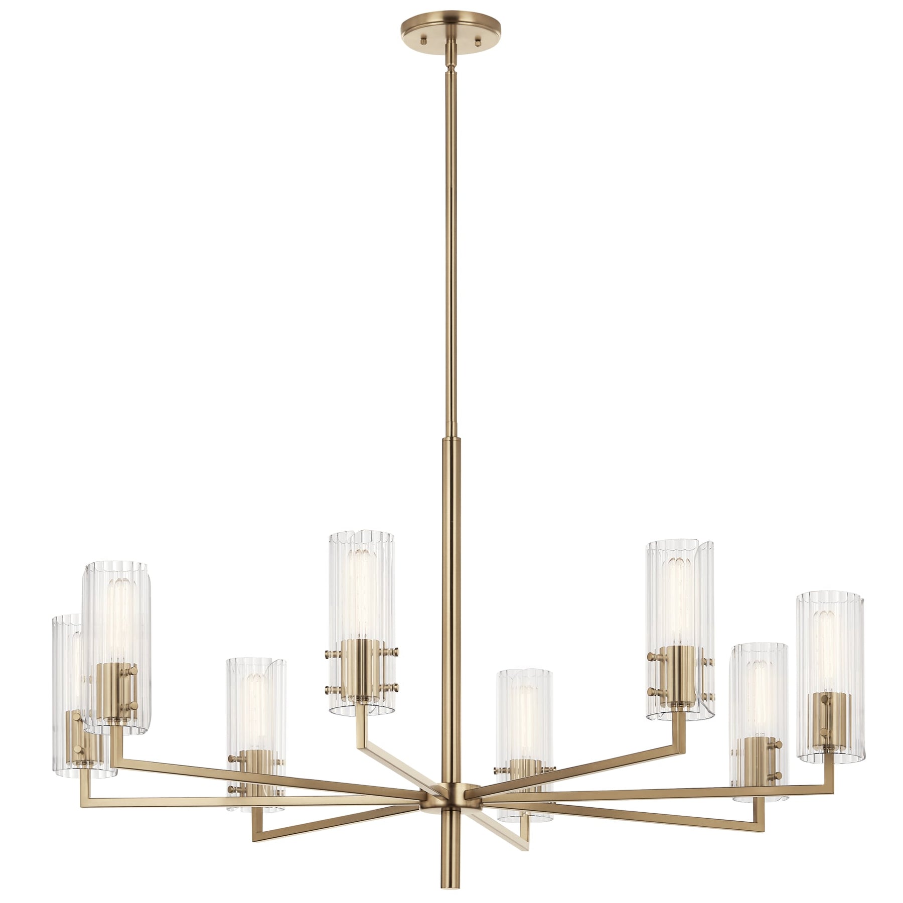 The Kichler Velestino 8-Light Chandelier beautifully combines minimalist design with contemporary elegance. Its champagne bronze finish highlights its durable steel frame, while clear fluted glass shades cast a mesmerizing glow across any space, perfect for dining rooms and living areas.