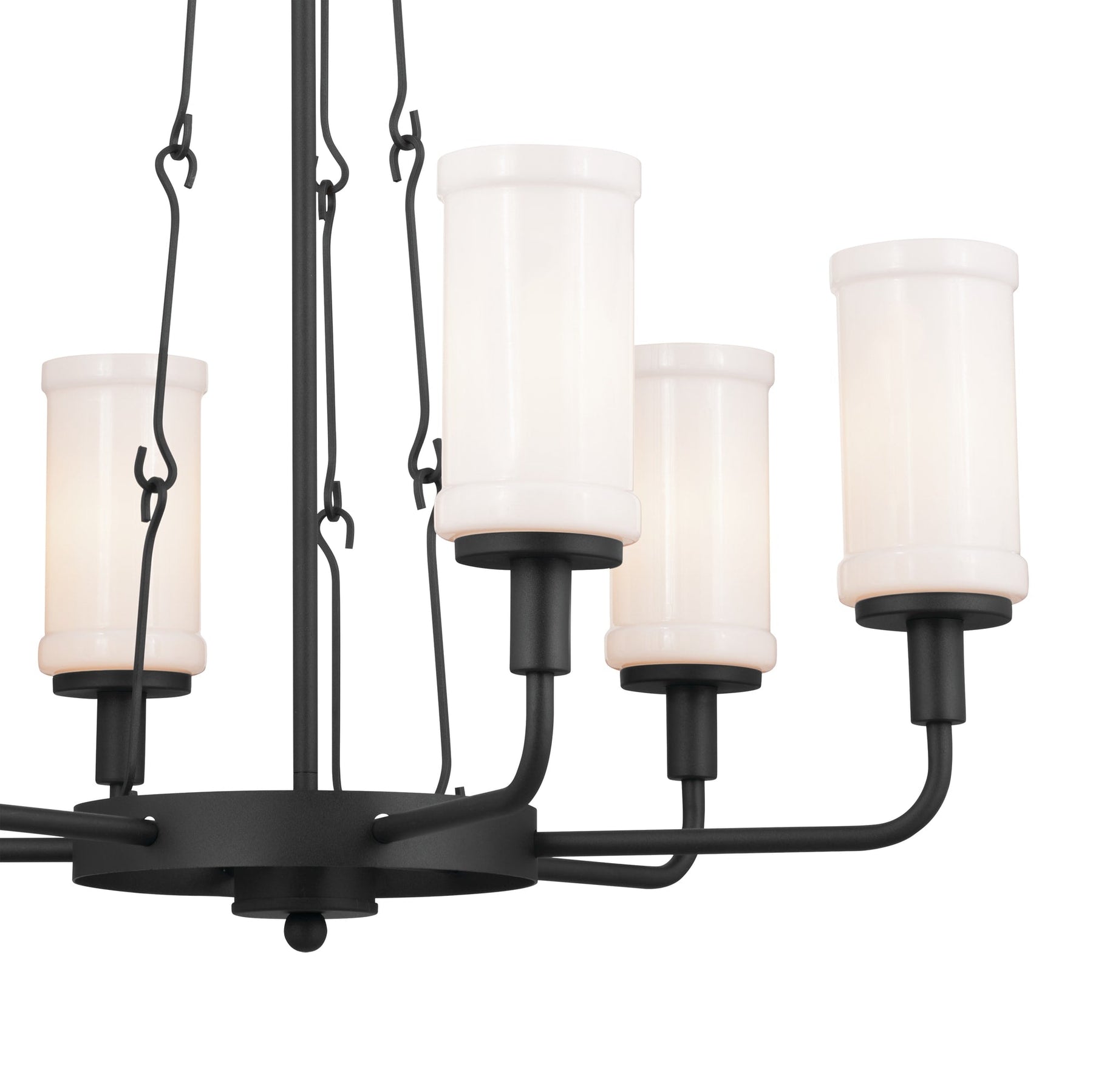 The Kichler Vetivene 6-Light Black Farmhouse Chandelier beautifully merges vintage appeal with contemporary versatility. Featuring a textured black finish and opal glass shades, this fixture illuminates any room with nostalgic charm. Perfect for living spaces, dining areas, and kitchens, it offers adjustable hanging options to suit any style.