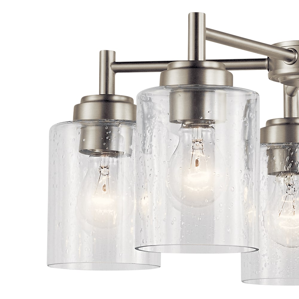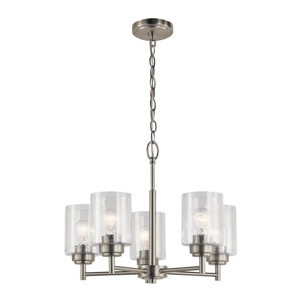 The Kichler Winslow 5-Light Chandelier merges modern elegance with a touch of timeless sophistication. Featuring a brushed nickel finish and clear seeded glass, this chandelier elevates dining rooms, kitchens, and living rooms alike, offering both aesthetic appeal and practical illumination.