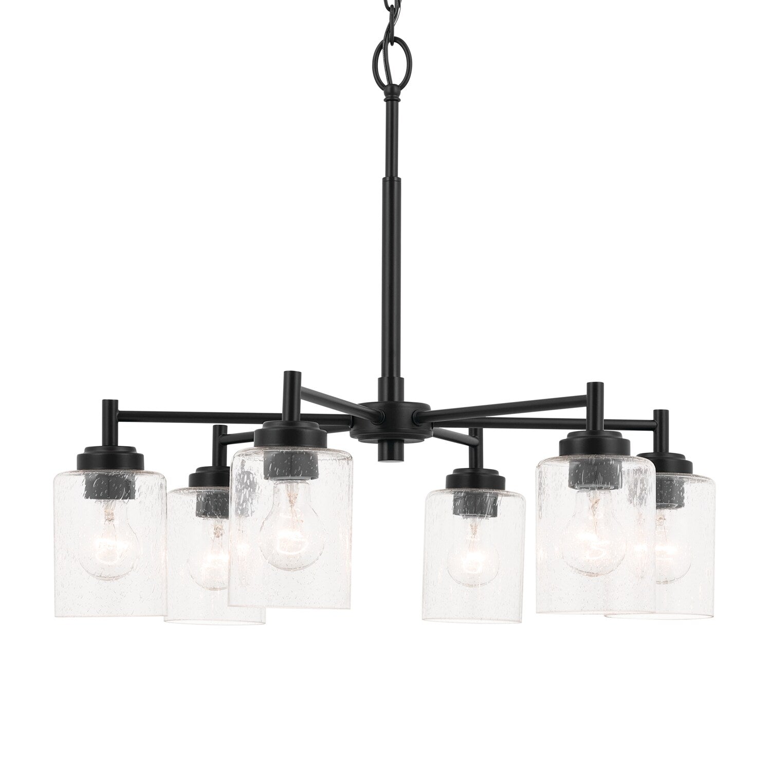 Illuminate your space with the Winslow 6-Light Black Industrial Chandelier by Kichler. This stunning fixture combines classic design with modern versatility, featuring sleek black steel tubing and clear seeded glass that complements a range of décor styles. Ideal for kitchens, dining rooms, or any space needing an elegant touch, this chandelier's adjustable height and customized glass orientation make it a uniquely adaptable lighting solution.
