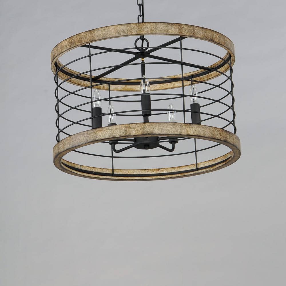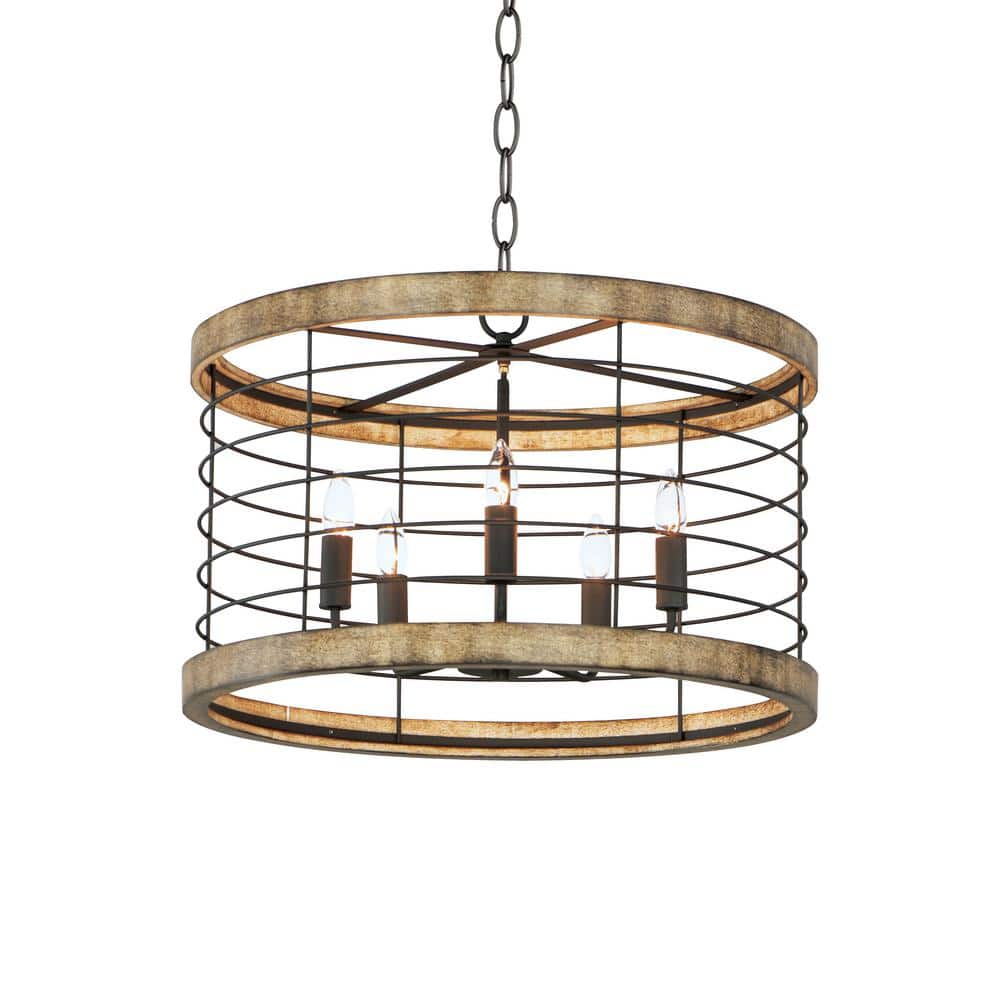 A modern-rustic chandelier blending steel with driftwood accents. The open geometric cage highlights five lights to stylishly illuminate dining rooms or living spaces.