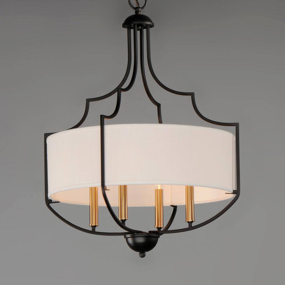 A sculptural steel frame in bronze with antique brass accents cradles a white linen drum shade, delivering warm, elegant illumination. This 4-light chandelier brings refined style to dining rooms and entryways with a clean, geometric silhouette.
