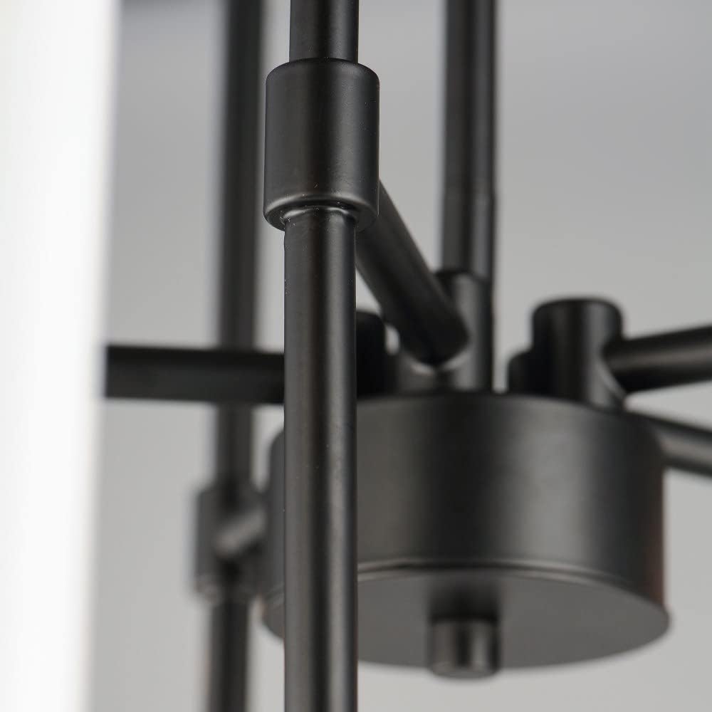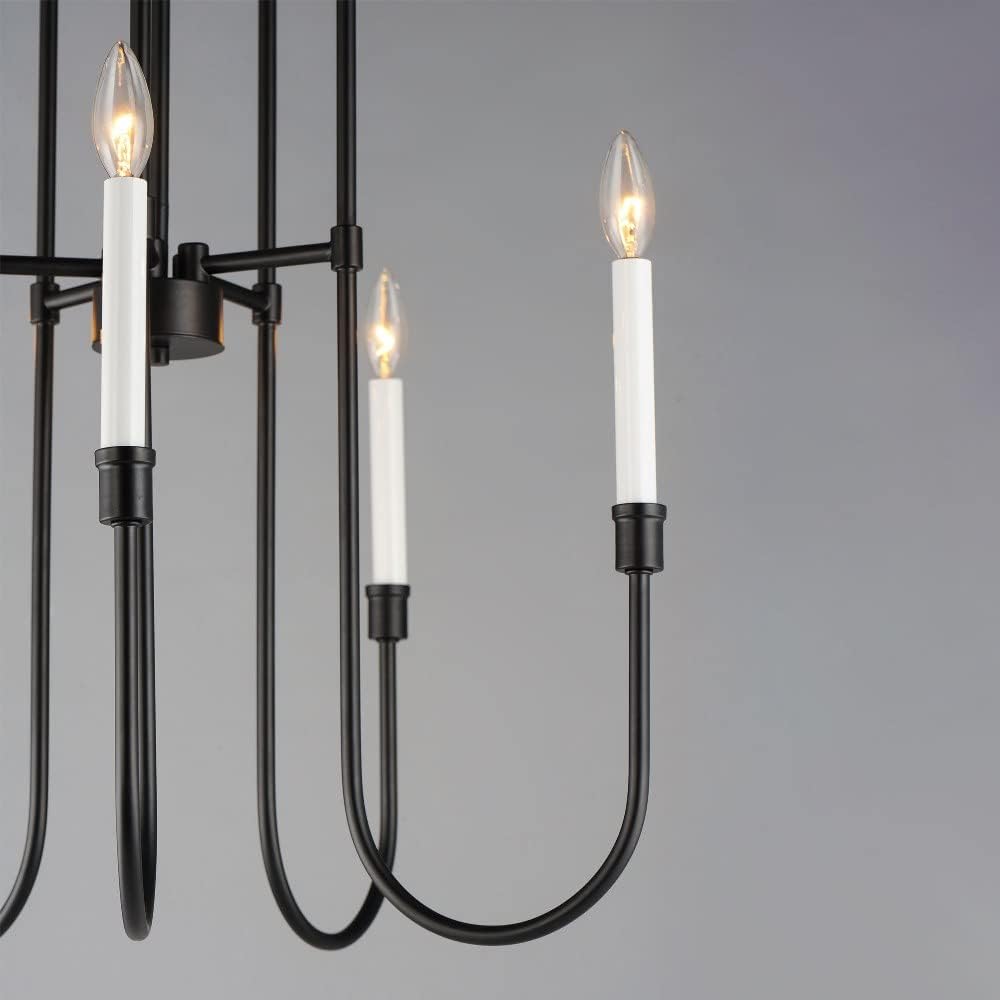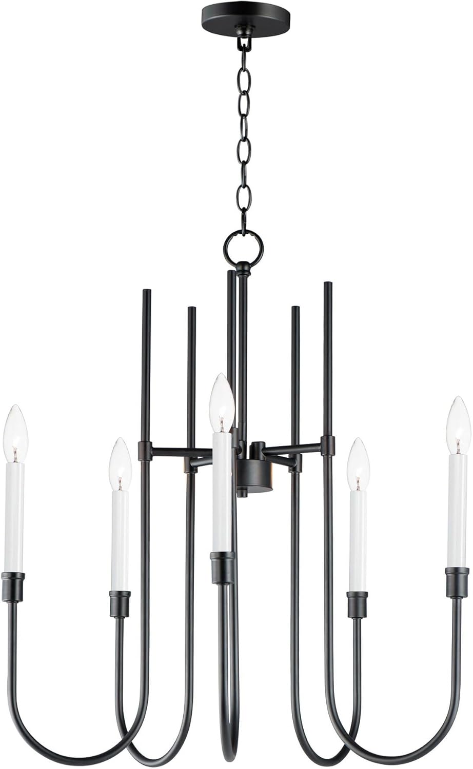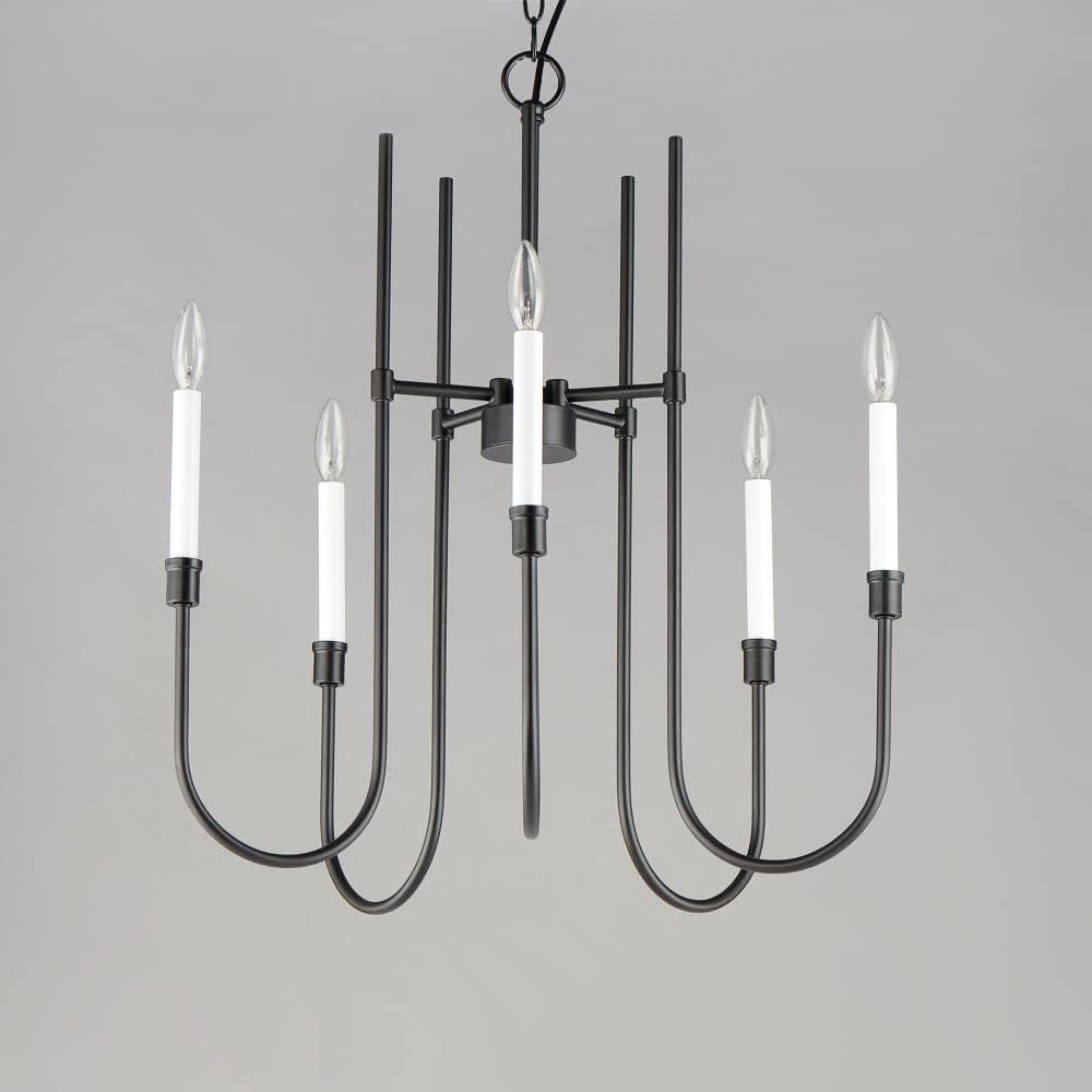 A minimalist 5-light chandelier from Maxim Lighting’s Tux collection, featuring sweeping black steel lines and candelabra-style lamping. Designed for indoor spaces, it includes a 36-inch chain, is dimmable, and adapts to sloped ceilings.