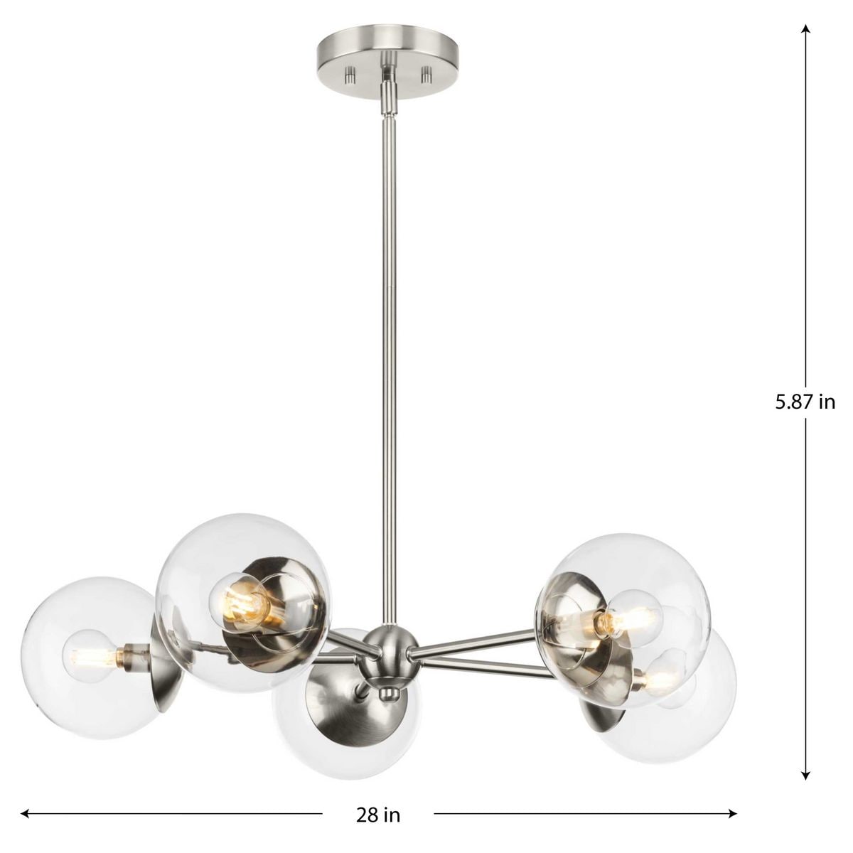 Illuminate your space with the Atwell 5-Light Chandelier from Progress Lighting. This mid-century masterpiece boasts a brushed nickel finish and clear glass globe shades, creating a sleek yet warm atmosphere ideal for modern and contemporary settings. Perfect for adding flair to any room, from kitchens to living rooms.