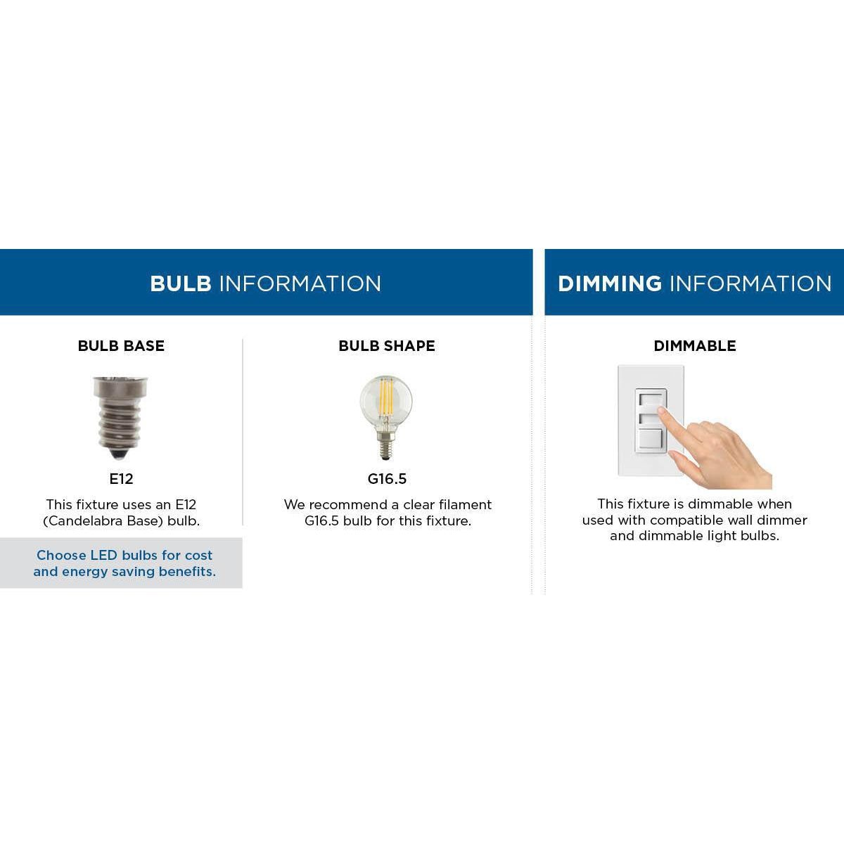A: The chandelier uses five 60-watt maximum candelabra (G16.5) base bulbs, or an LED equivalent. Please note that bulbs are sold separately.