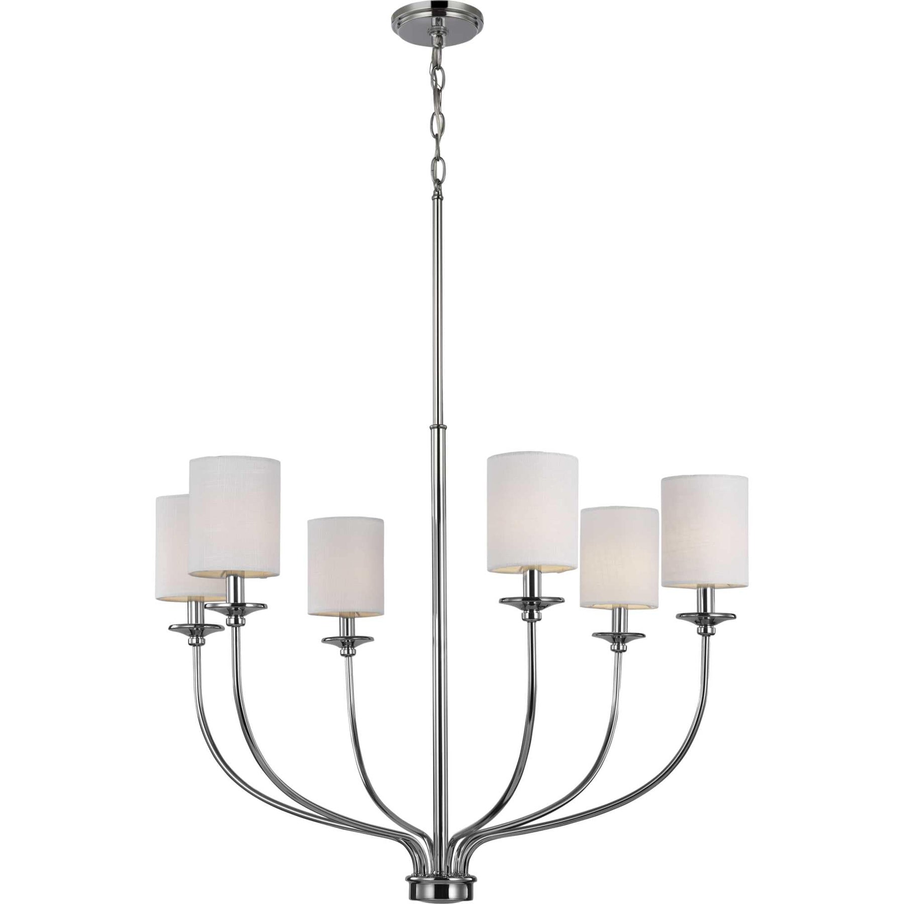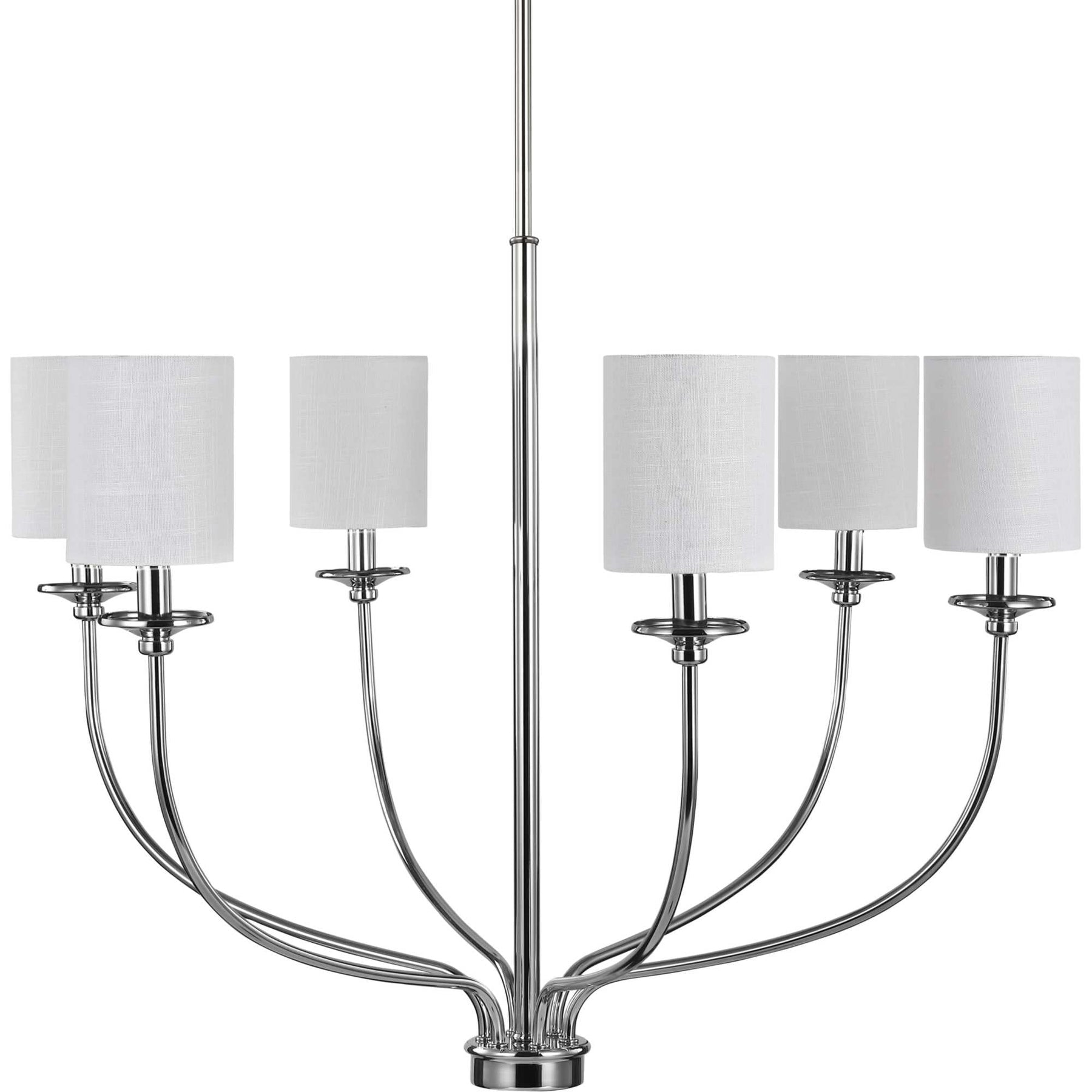 The Bonita 6-Light Traditional Chandelier by Progress Lighting elevates any room with its polished chrome finish and elegant design. Perfect for dining rooms, kitchens, or foyers, this chandelier enhances traditional and transitional spaces with its luxurious aesthetic. It features crisp white linen shades that beautifully diffuse light for a soft, ambient glow.