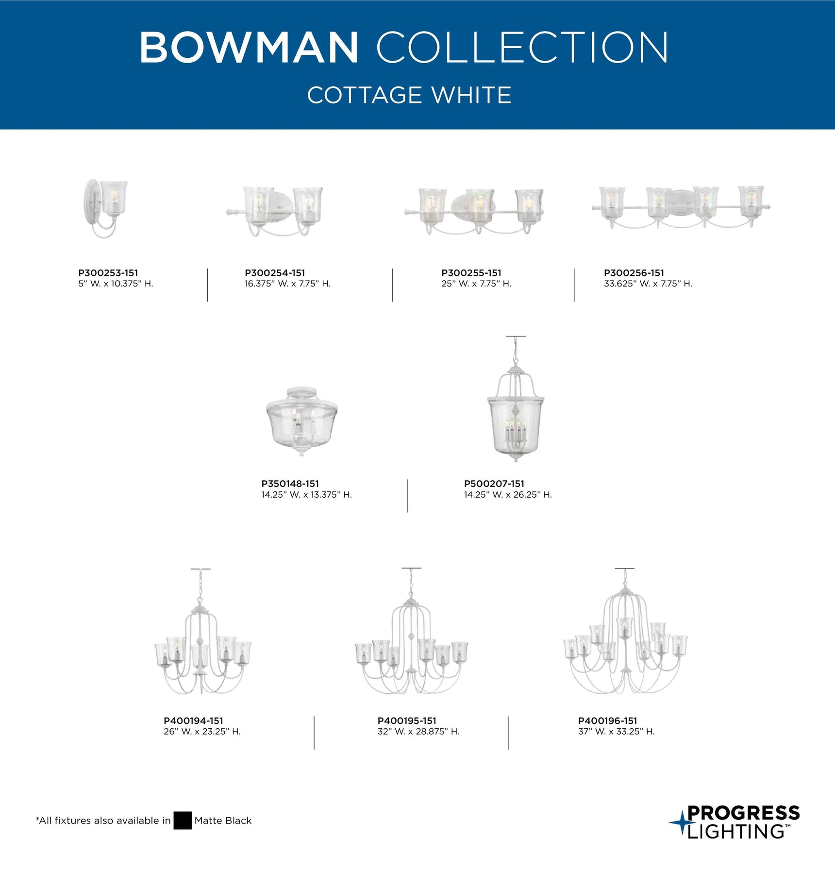 The Bowman 5-Light Coastal Chandelier by Progress Lighting exudes a crisp, coastal elegance with its cottage white finish and clear chiseled glass shades. Perfect for extending your style from the dining room to the kitchen, its classic design complements a variety of decor themes, including coastal, farmhouse, and rustic.