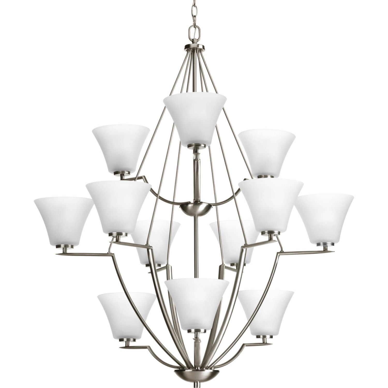 The Bravo 12-Light Brushed Nickel Chandelier by Progress Lighting brings a touch of elegance and sophistication to modern and transitional spaces. This dramatic, tiered fixture features twelve etched glass shades contrasted beautifully against a brushed nickel finish, perfect for illuminating dining rooms or great rooms with style and grace.