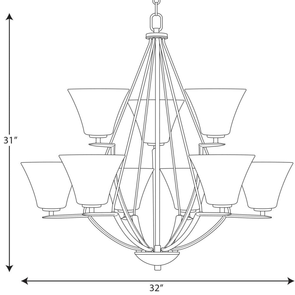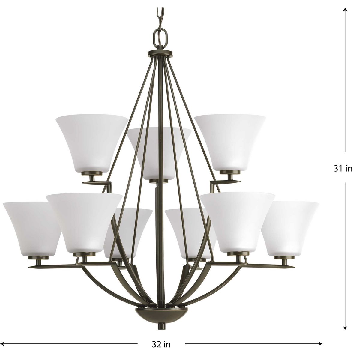 The Progress Lighting Bravo 9-Light Antique Bronze Chandelier enhances any room with its transitional style and elegant etched glass shades that offer warm, inviting illumination. Its antique bronze finish and two-tier design make it an ideal choice for dining rooms, foyers, or halls, blending classic elegance with modern sophistication.