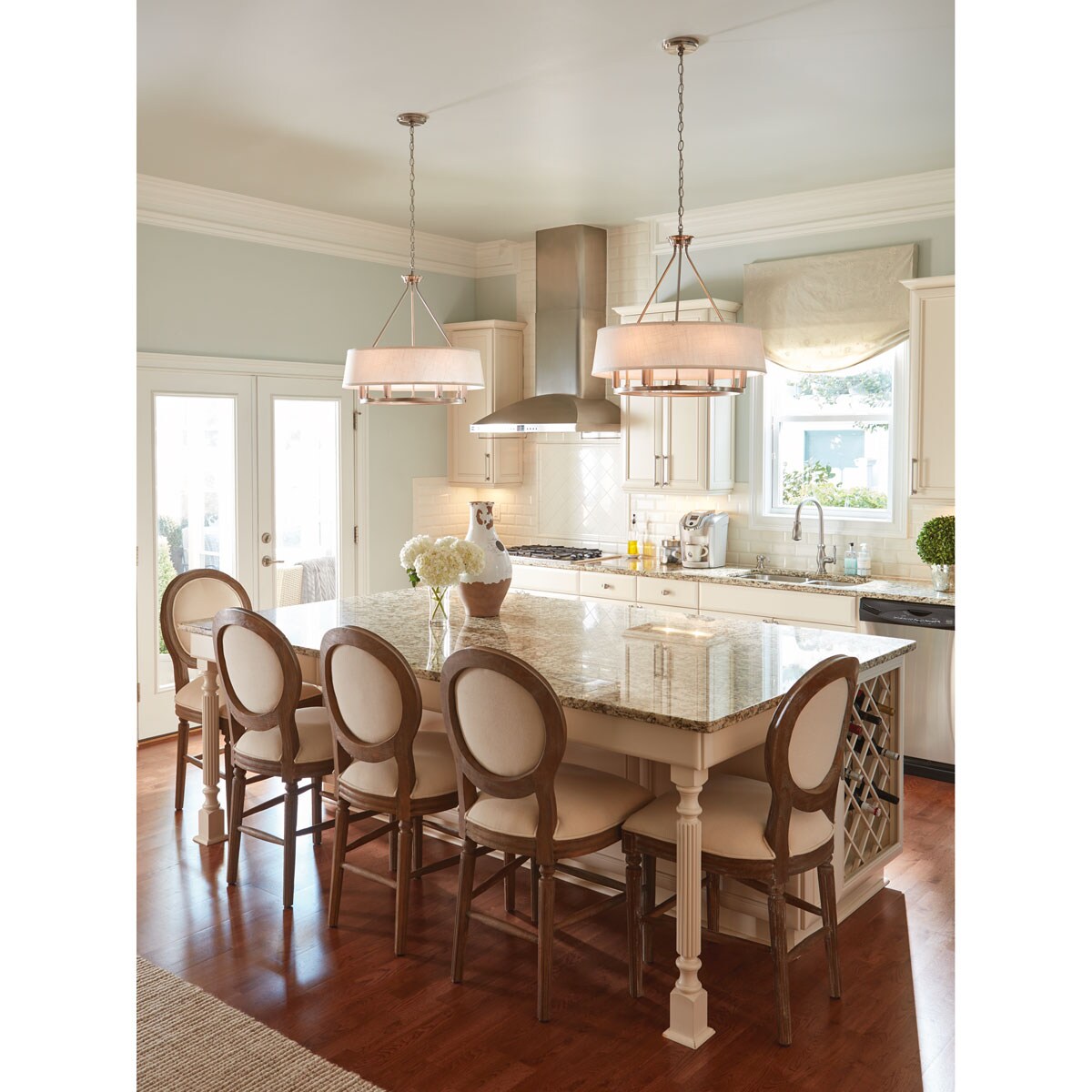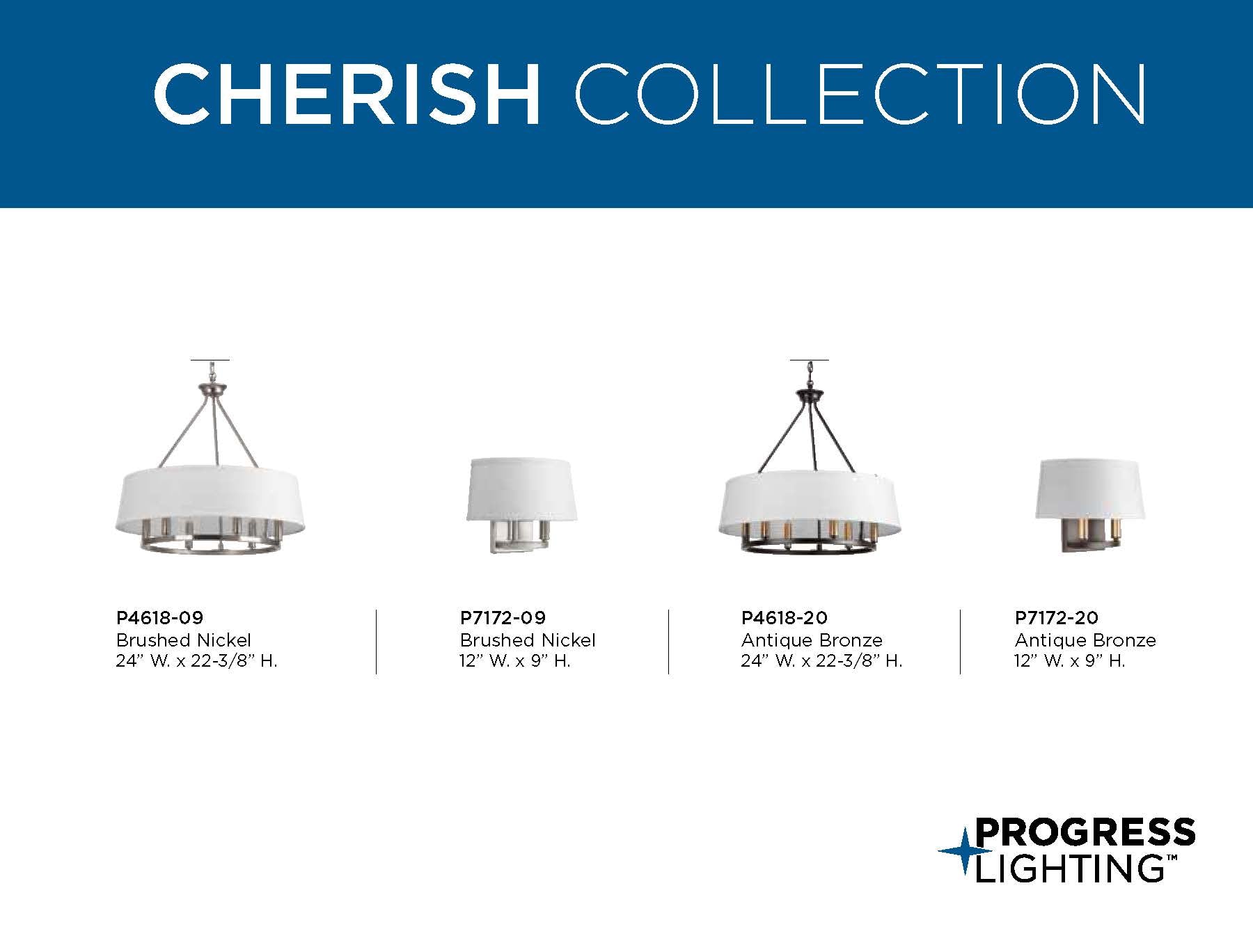 Illuminate your home with the Cherish 6-Light Chandelier from Progress Lighting. This stunning fixture boasts a contemporary brushed nickel finish and a crisp white linen shade to create a warm, inviting glow. Perfect for dining rooms, kitchens, and more, this chandelier is ideal for bringing modern elegance to any space.