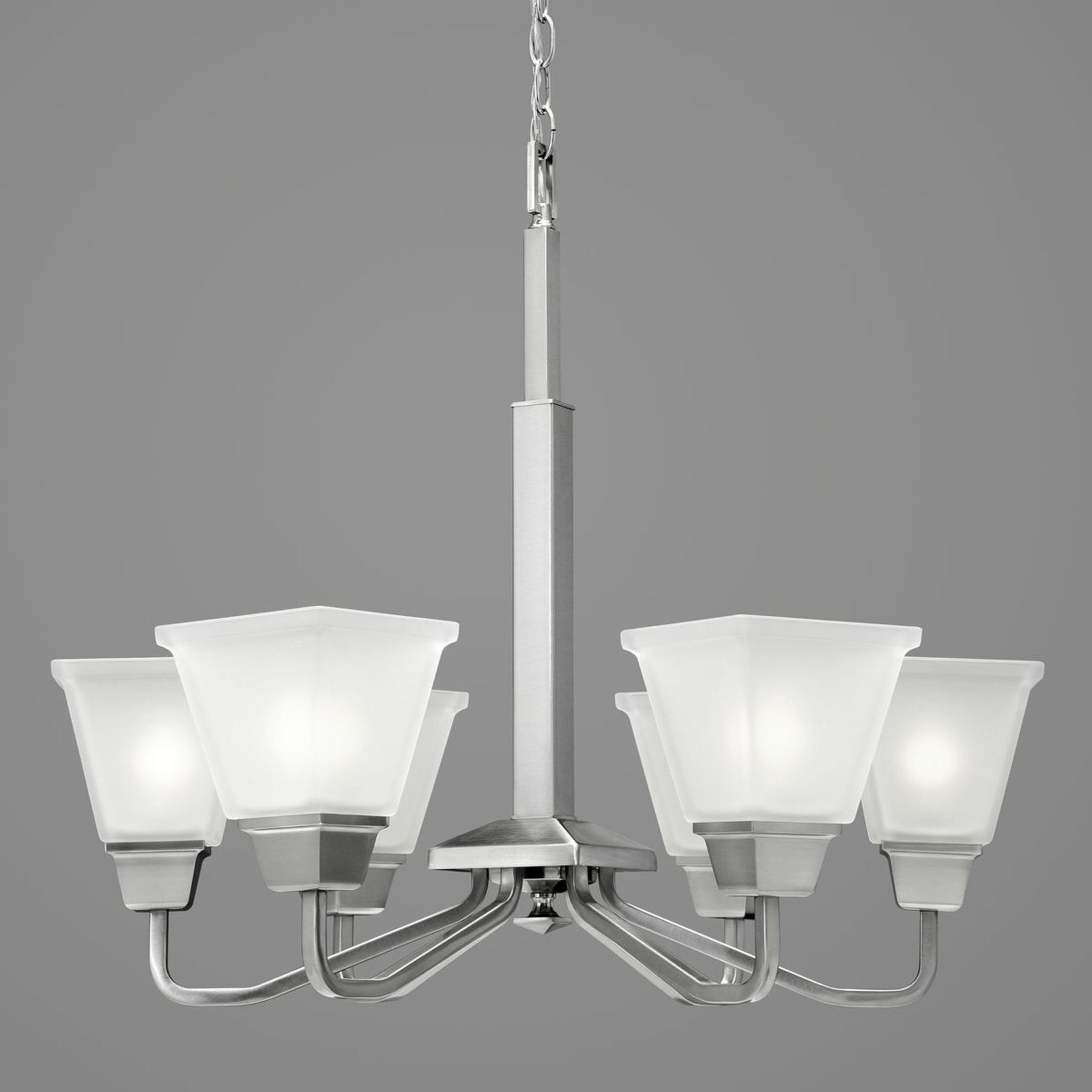 Illuminate your space with heritage craftsmanship through the Clifton Heights 6-Light Chandelier. This elegant fixture boasts a brushed nickel finish that complements its etched glass shades, adding a refined touch to any modern, farmhouse, or craftsman setting. With adjustable hanging potential, it adapts gracefully to your ceiling height needs.