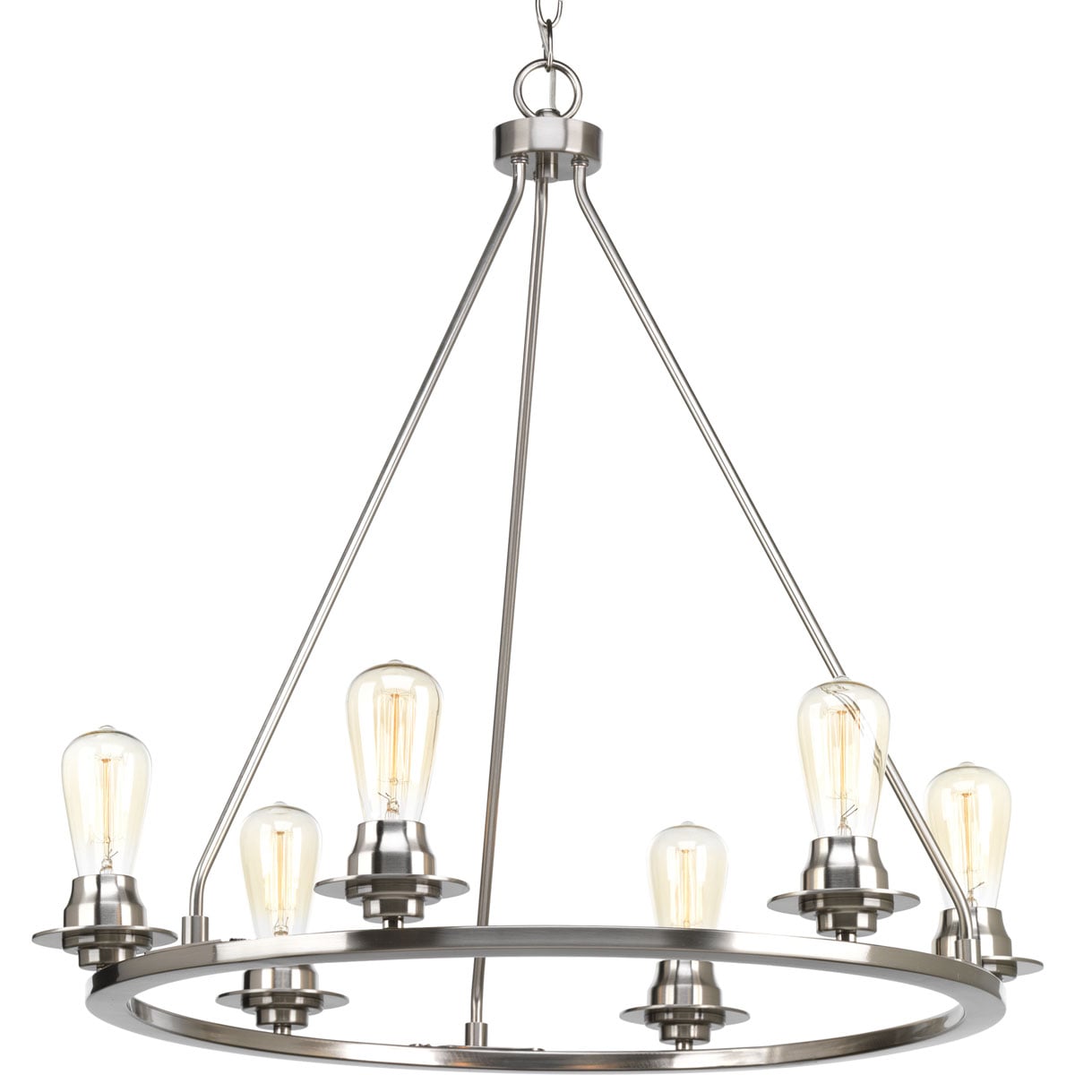 Illuminate your space with the timeless charm of the Debut 6-Light Brushed Nickel Farmhouse Chandelier by Progress Lighting. This sophisticated piece combines vintage modern aesthetics with a stunning brushed nickel finish, making it an ideal centerpiece for dining rooms, great rooms, or bedrooms. The chandelier's adjustable chain allows customization to fit any ceiling height, adding a touch of elegance to urban industrial or farmhouse-style settings.