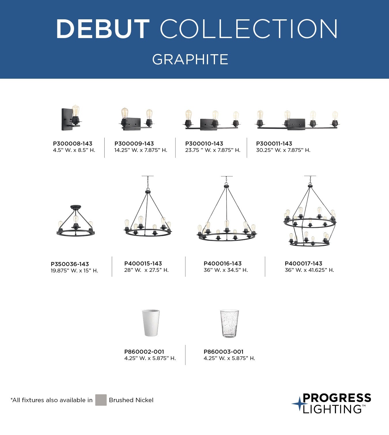 A: No, glass accessory shades are not included but are available for purchase separately in clear or frosted seeded finishes.