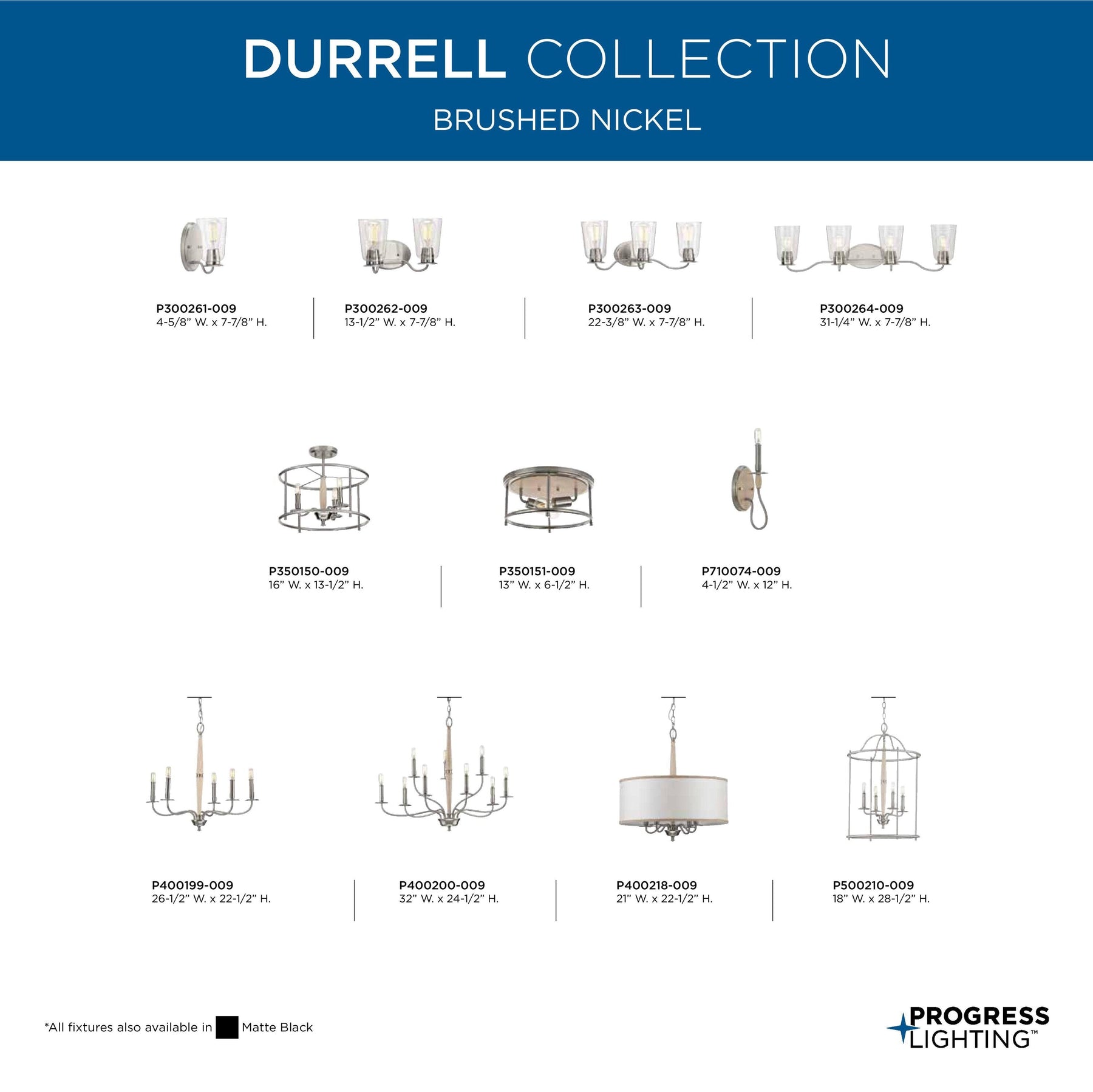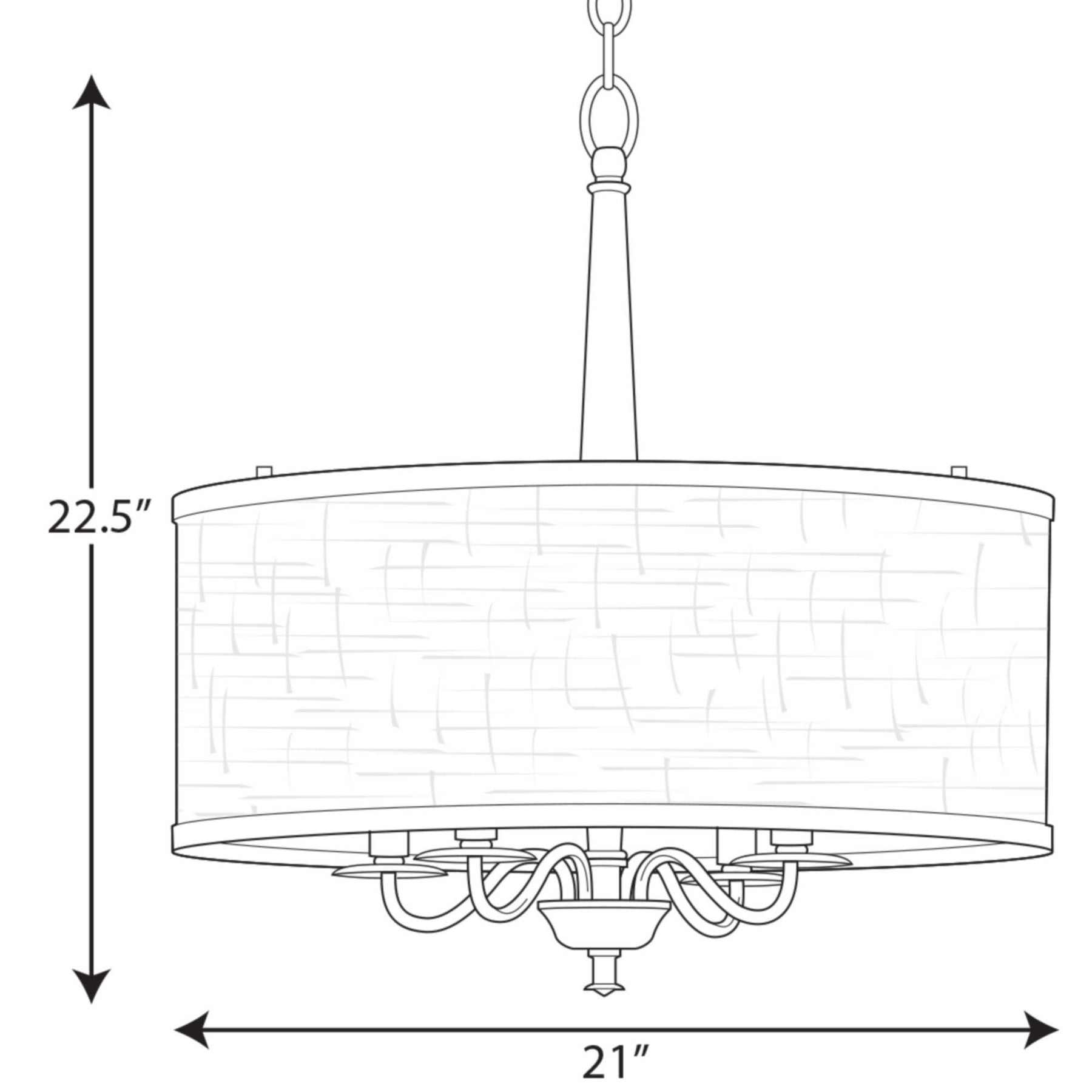 Illuminate your space with the elegant Durrell 4-Light Chandelier by Progress Lighting, perfect for enhancing coastal, farmhouse, or rustic interiors. Featuring a sleek brushed nickel finish and an exquisite sailcloth linen drum shade, this chandelier adds a soft, inviting glow to any room. With a 72-inch adjustable chain, it offers flexible hanging options to suit various ceiling heights.
