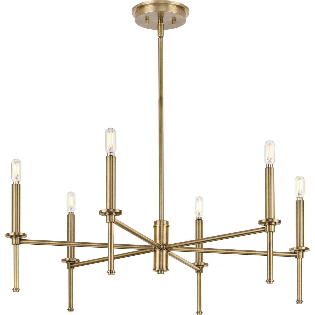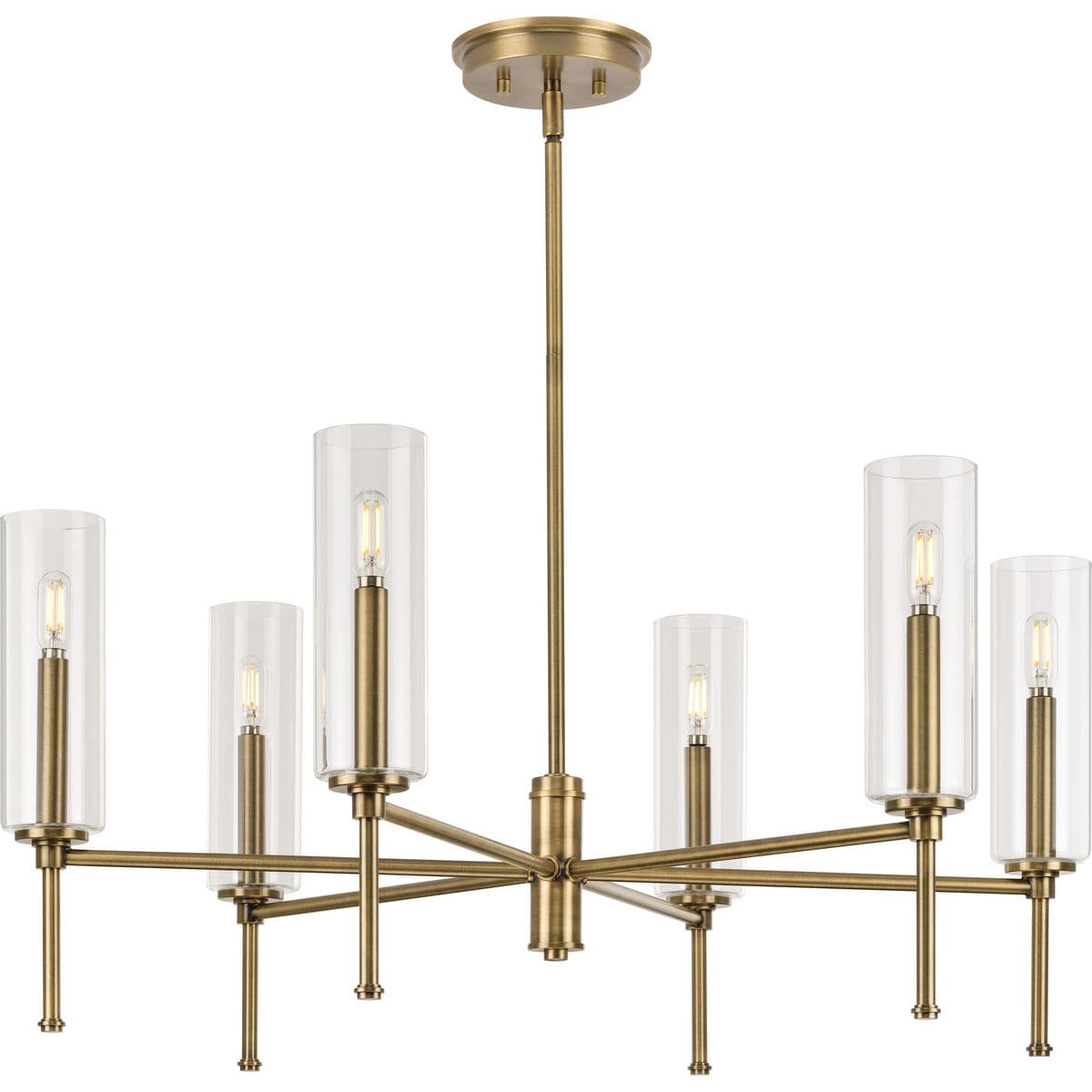 Elevate your space with the Elara 6-Light Chandelier from Progress Lighting. This chandelier features an elegant, modern design with a vintage brass finish, perfect for transitional interiors. Its timeless appeal, combined with customizable shade options, offers both style and lighting flexibility for any home.