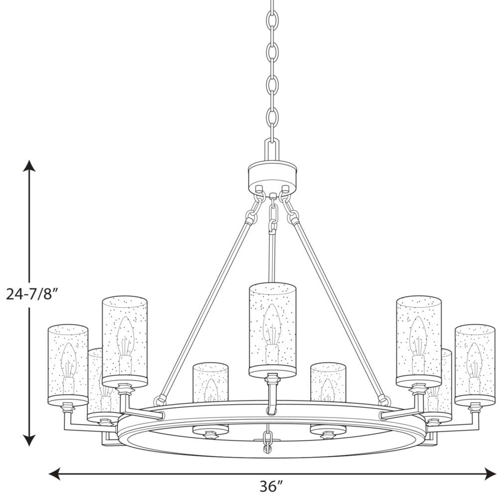 Elevate your space with the Gresham 9-Light Black Transitional Chandelier by Progress Lighting. This striking fixture combines traditional iron-inspired design with modern elegance, featuring rustic clear seeded glass shades that add texture and depth. Ideal for dining rooms and great rooms, it perfectly complements farmhouse, modern, and rustic interiors.