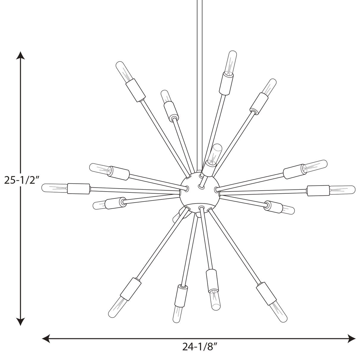 The Ion 16-Light Polished Nickel Chandelier by Progress Lighting offers a stunning fusion of mid-century modern style and contemporary flair. With its polished nickel finish and striking space-age starburst design, this chandelier instantly elevates any space with elegance and bold style. Perfect for dining rooms, great rooms, or any setting that demands a statement piece, this fixture effortlessly combines aesthetics and practicality.