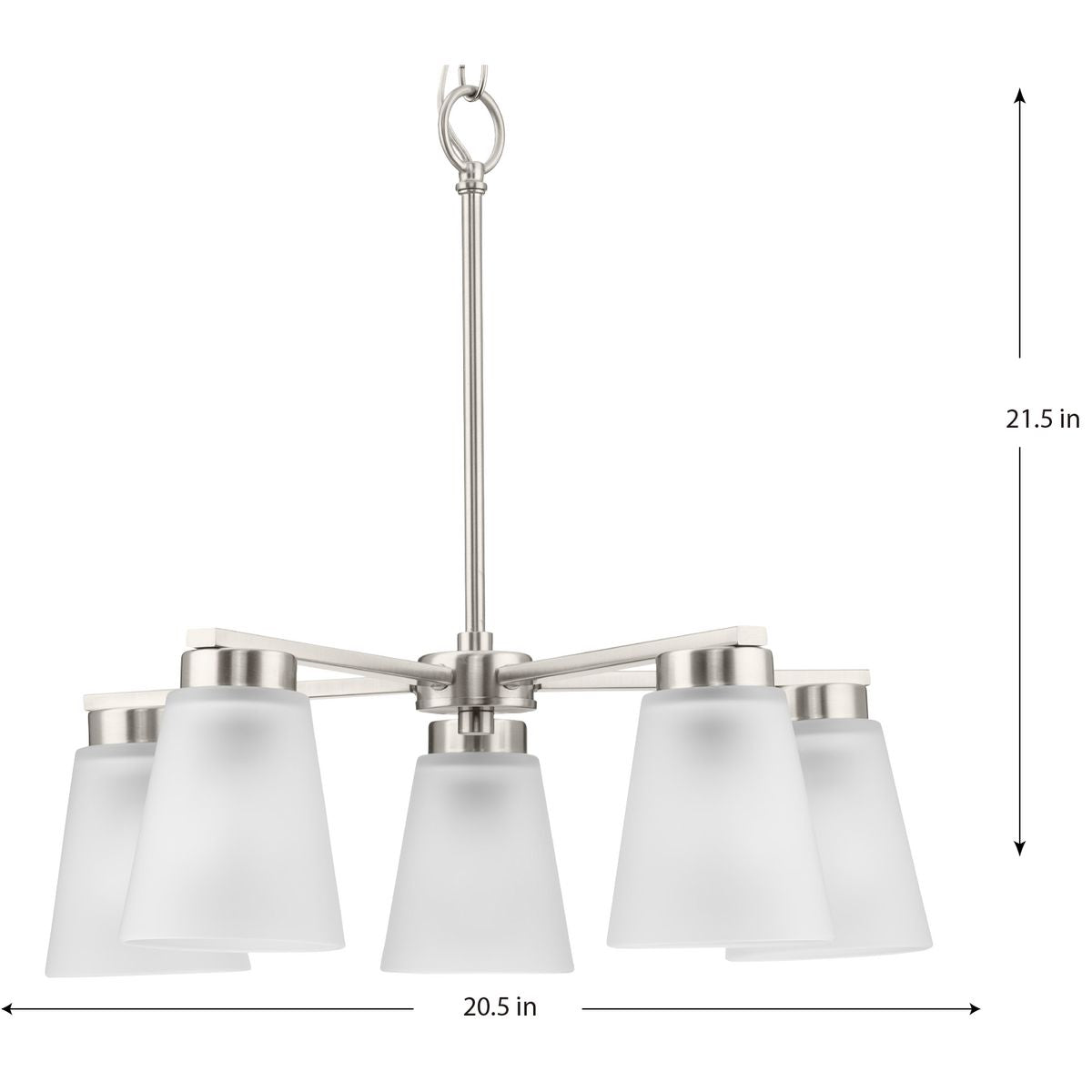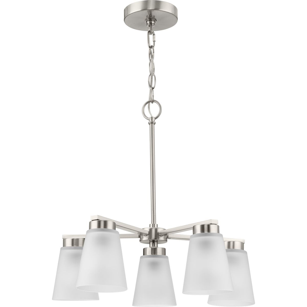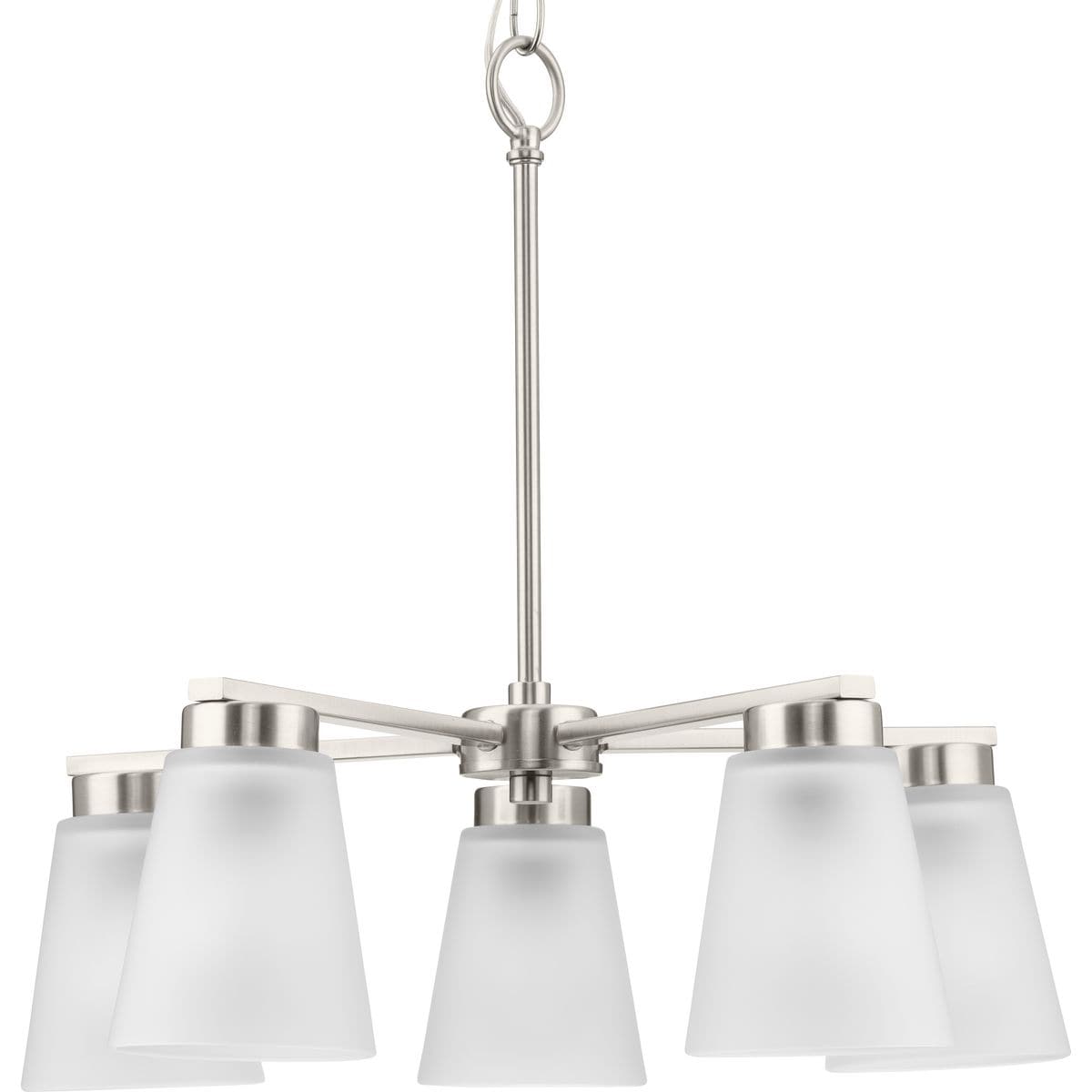 Illuminate your home with the elegant Tanner 5-Light Brushed Nickel Chandelier by Progress Lighting. This transitional fixture combines sleek, brushed nickel lines with soft, etched glass shades, offering sophisticated lighting that's perfect for dining rooms, foyers, and more. Adjustable in height, it adapts seamlessly to your space, enhancing both form and function.