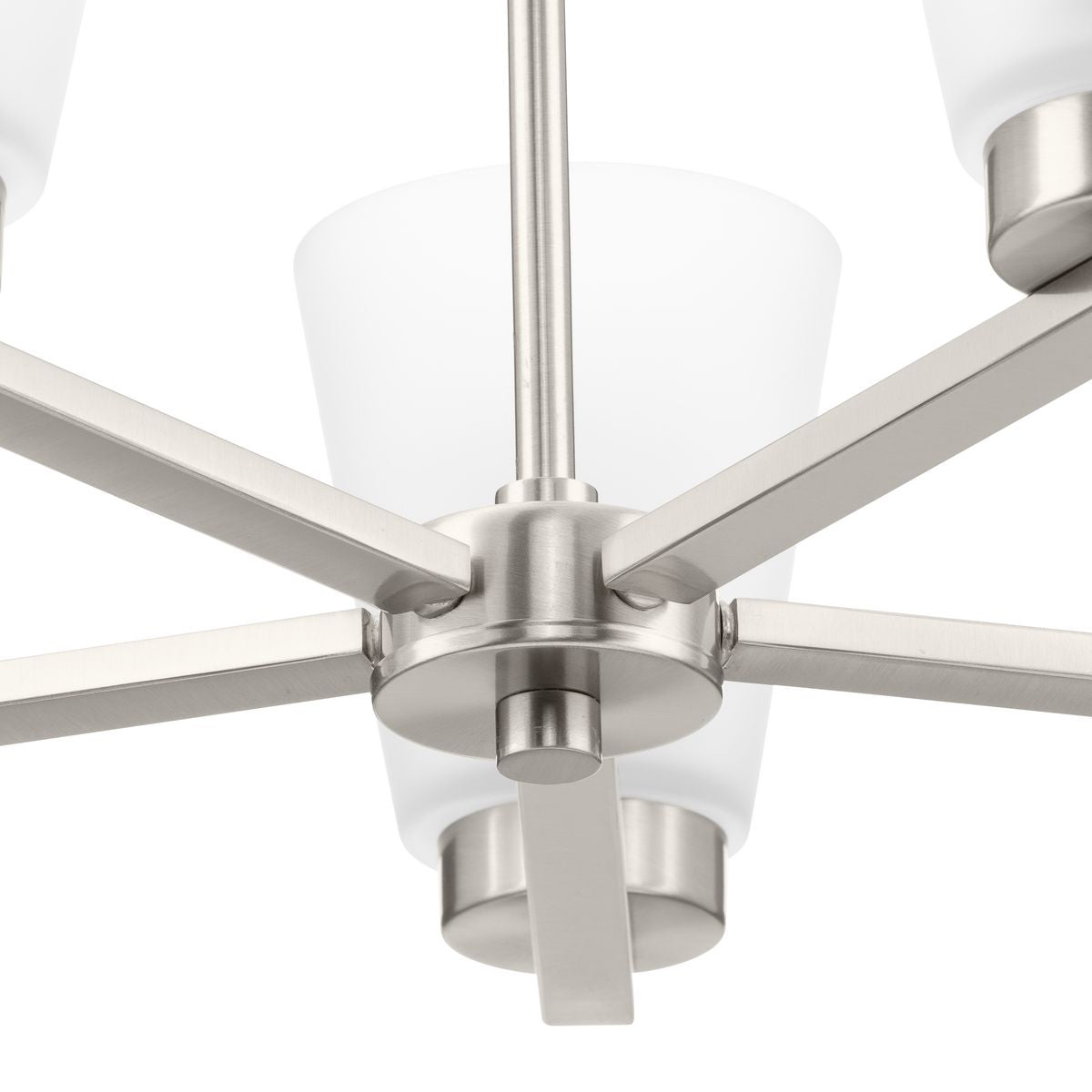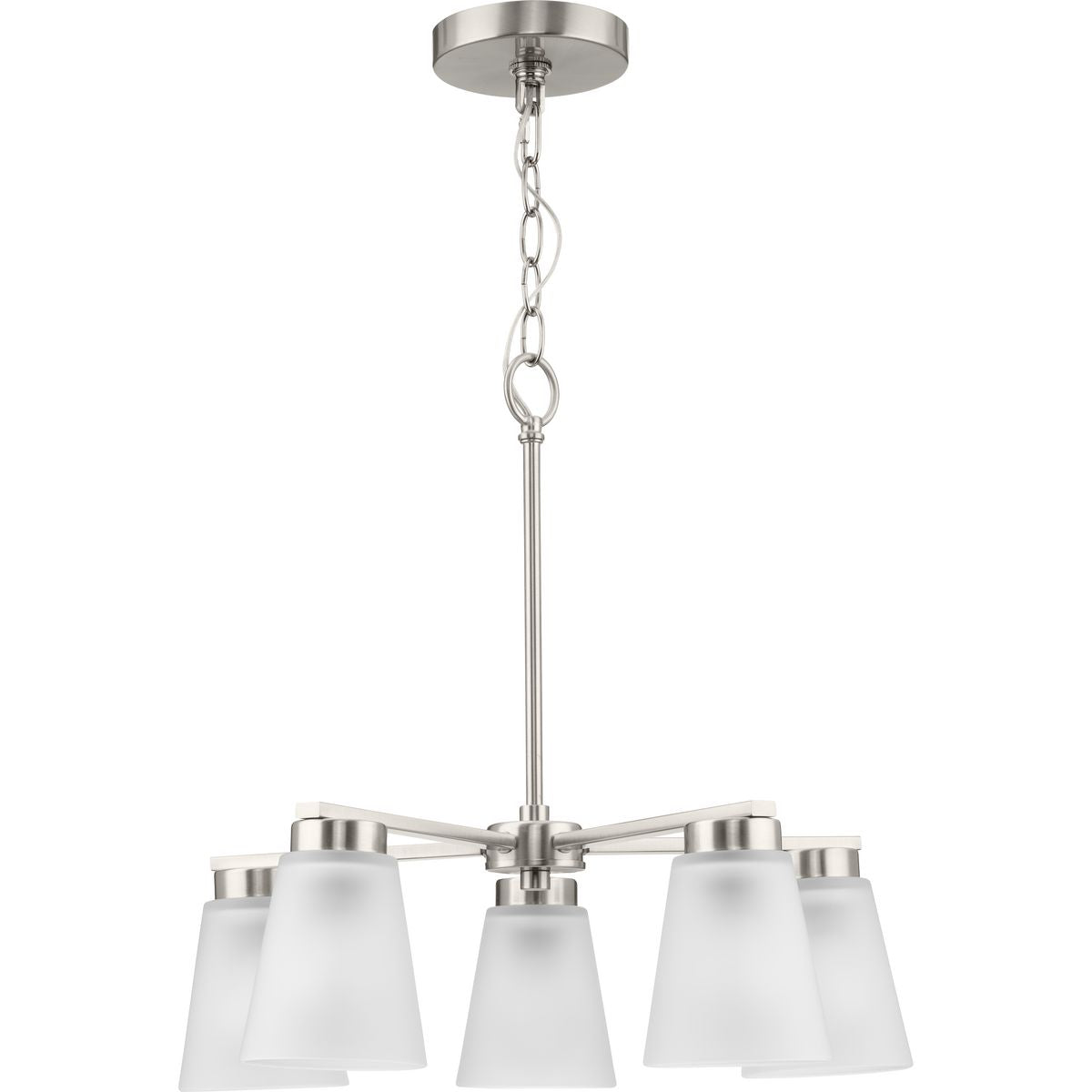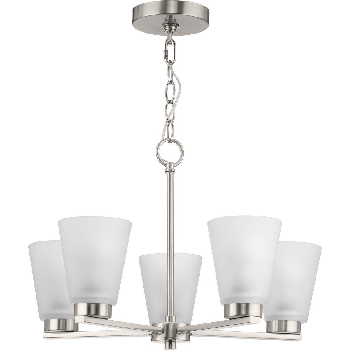 Illuminate your home with the elegant Tanner 5-Light Brushed Nickel Chandelier by Progress Lighting. This transitional fixture combines sleek, brushed nickel lines with soft, etched glass shades, offering sophisticated lighting that's perfect for dining rooms, foyers, and more. Adjustable in height, it adapts seamlessly to your space, enhancing both form and function.