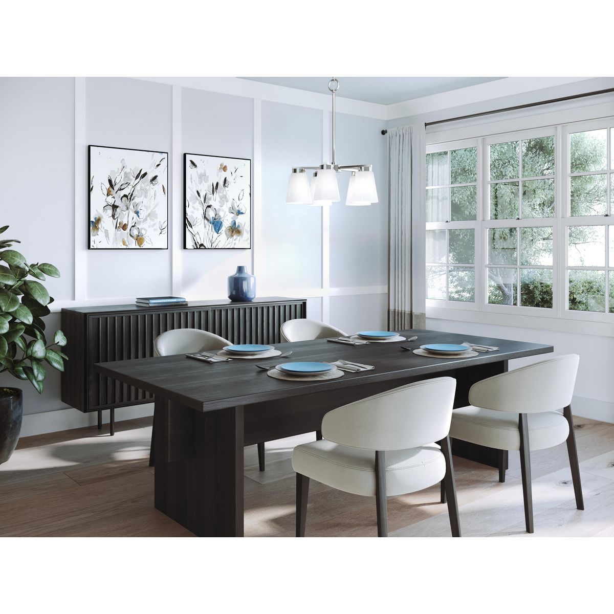 Envision the Tanner 5-Light Brushed Nickel Chandelier as the crown jewel of your dining area. Its brushed nickel finish remarkably unifies strength and style, while soft etched glass shades softly diffuse light, creating an ambience of luxury. Picture it elegantly suspended above a grand dining table, or poised in a stately foyer, its height impeccably tailored to your space. This chandelier doesn't merely light the room; it defines it, becoming indispensable to inspired, luxurious living.