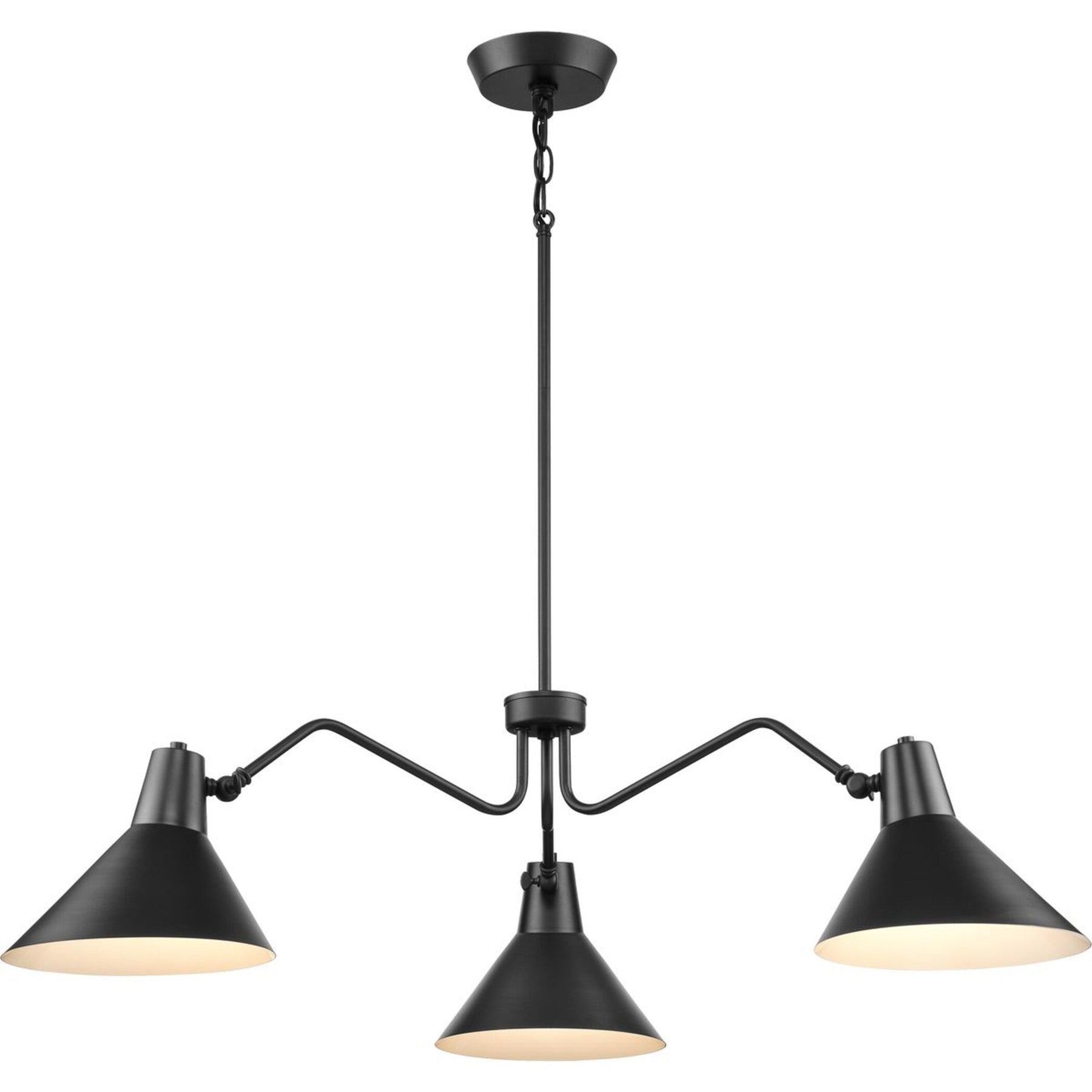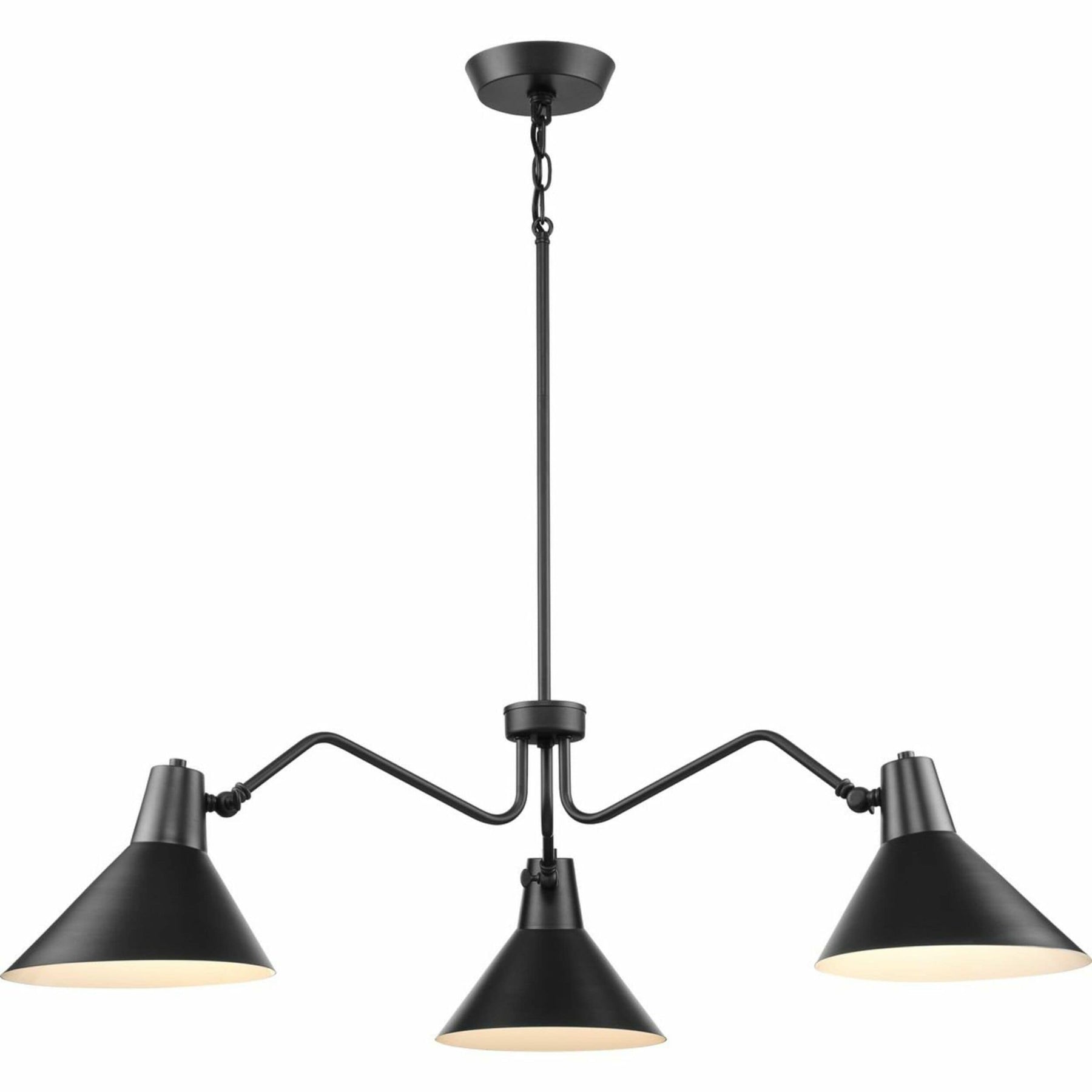 The Trimble 3-Light Matte Black Industrial Chandelier from Progress Lighting marries iconic design with modern elegance. Boasting angular metal shades and a matte black finish, this statement piece provides crisp illumination, making it perfect for dining, living, and bedroom spaces. Its expansive frame and adjustable hanging heights offer both style and flexibility, ensuring a perfect fit for any contemporary or industrial interior.